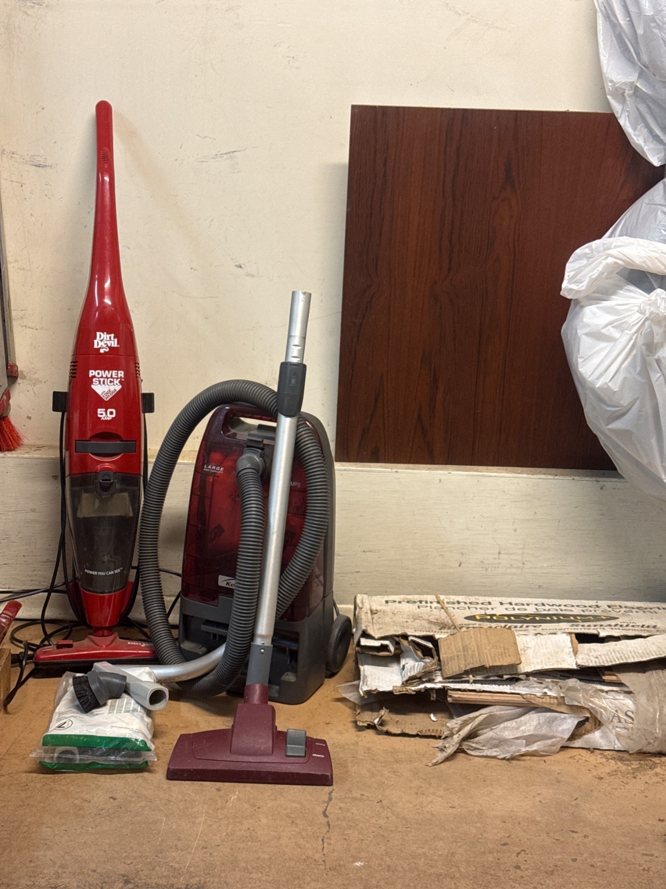 Kenmore Daredevil Power Stick vacuum cleaner in red with included attachments and additional vacuum bags. Lightweight and compact design suitable for various cleaning needs. Attachments include a standard vacuum head and hose, offering versatility. Items appear to be in used condition; wear is consistent with normal use. Measurements for the power stick are approximately 45 inches in height and 9 inches in width.