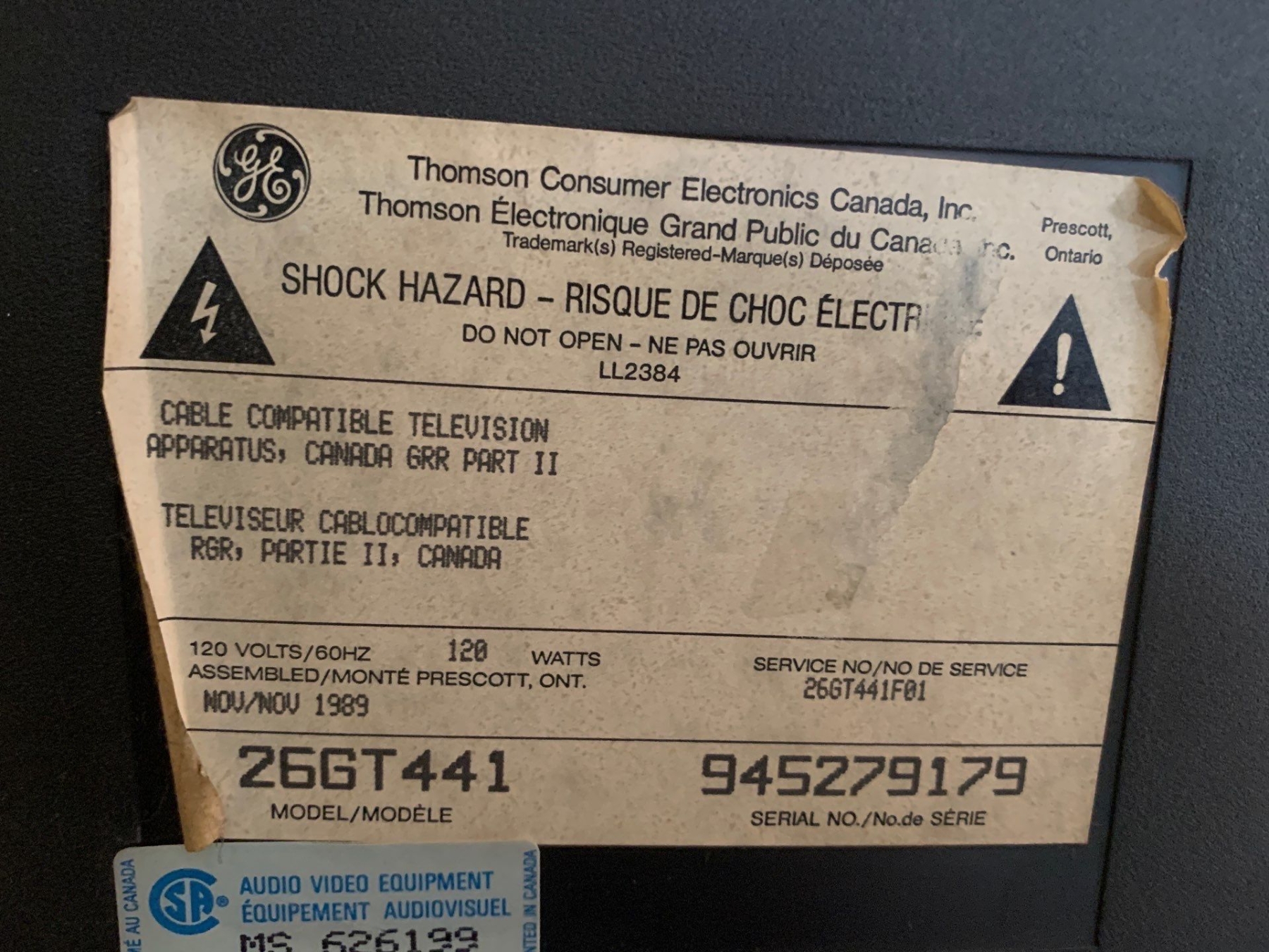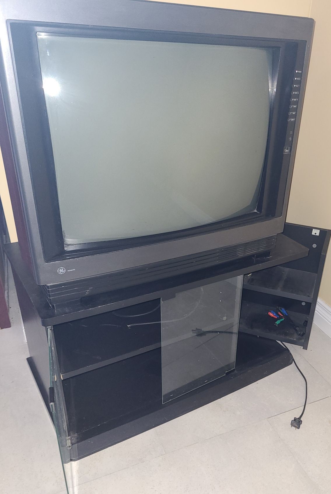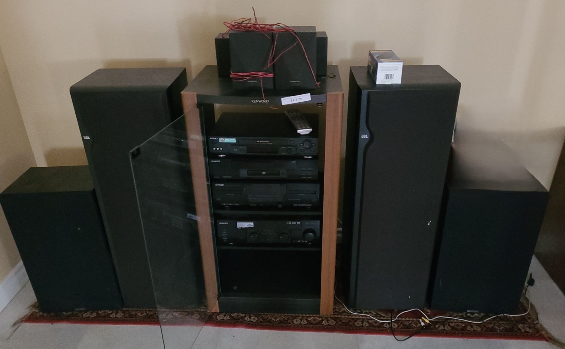 Also incl GE 25 Inch Television Model 26GT44 32 w, 41 h, 17 1/2 d, Kenwood Stereo in Cabinet 23 w, 42 h, 17 d, DV-502 , CT-405 & VR-509 & Sony VCR Model SLV-N71- Accusound, JBL & Kenwood Assorted Speakers. Remotes included