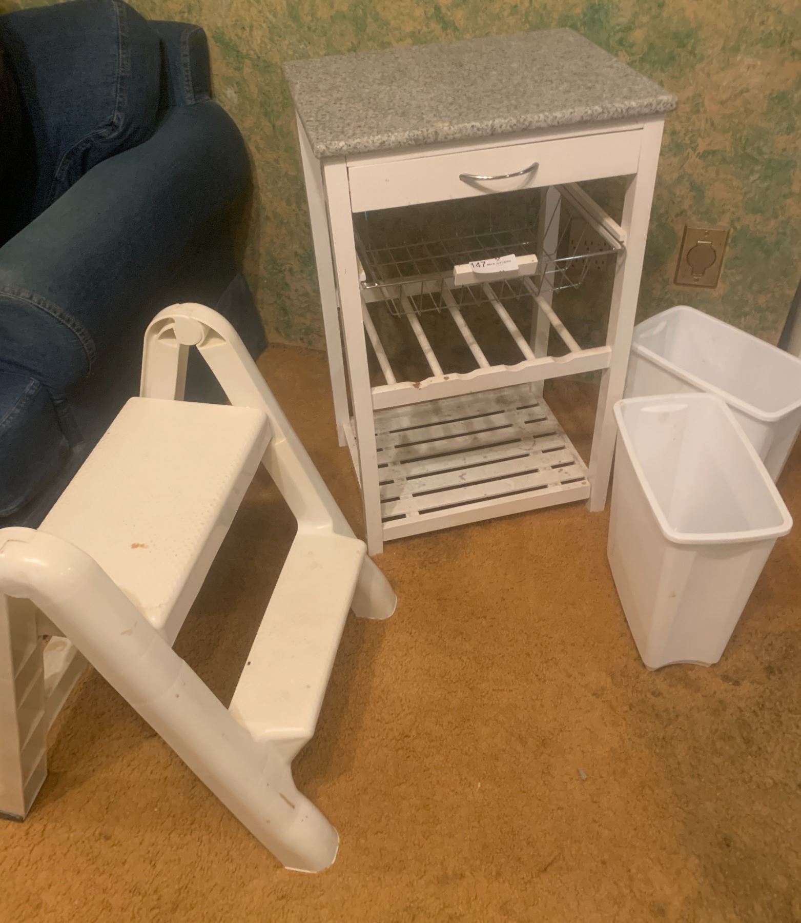 Kitchen Cart, Step Stool, and 2 Waste Bins
