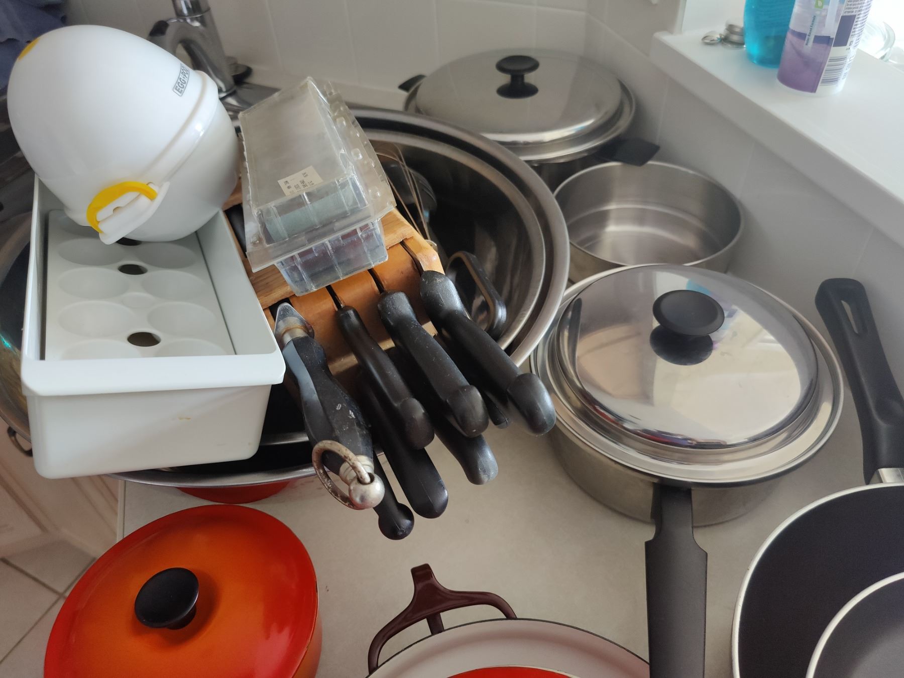 Pots, pans, knife block, marble rolling pin & more