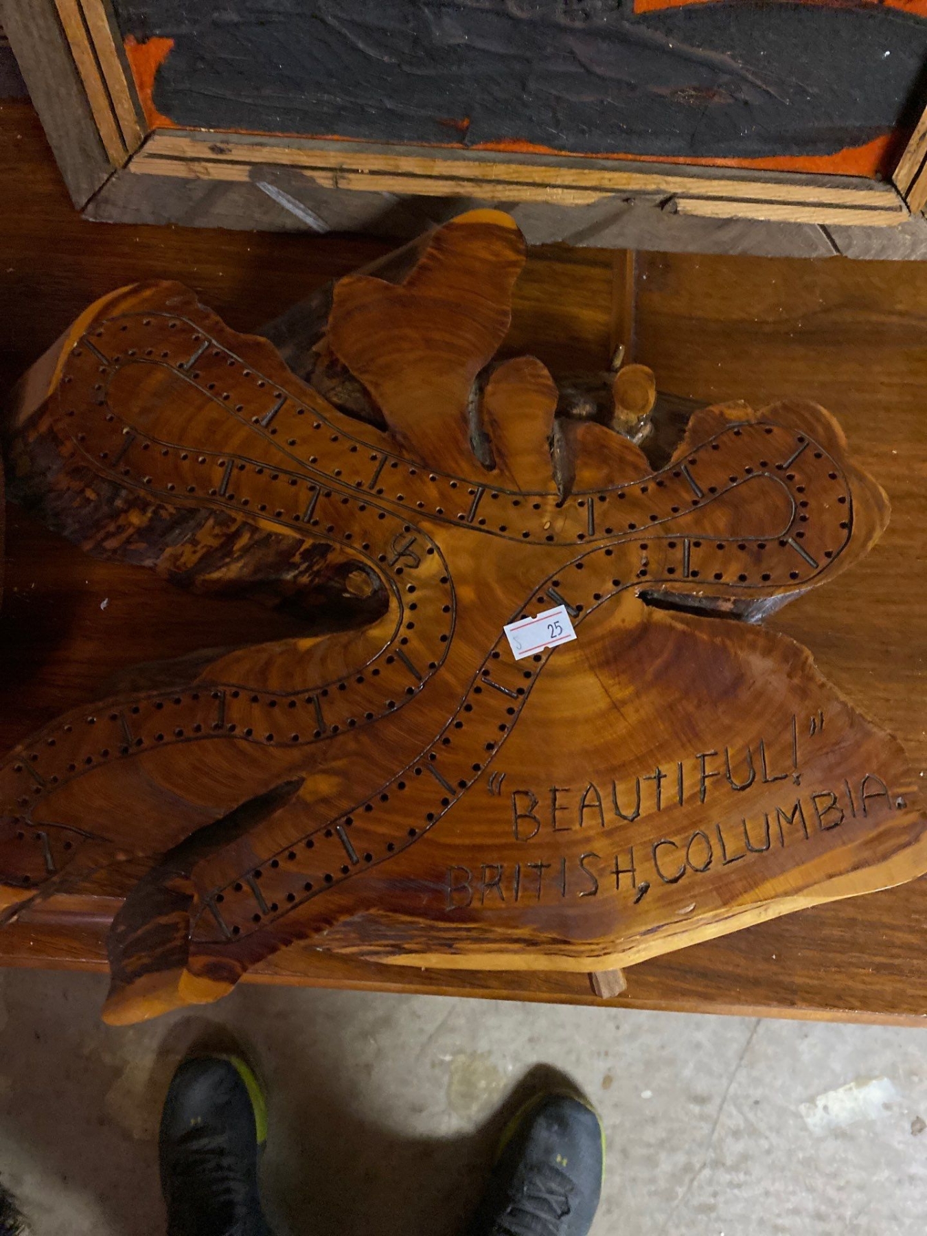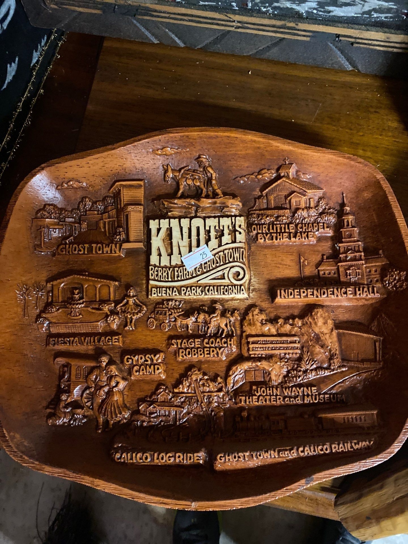 Knotts, Burberry Farm Ghost Town, serving dish and beautiful. British Columbia carved nodded wood crib board.