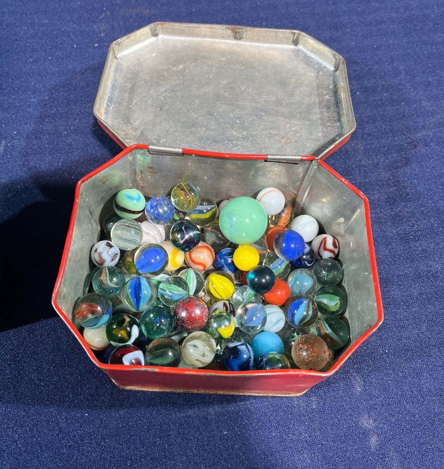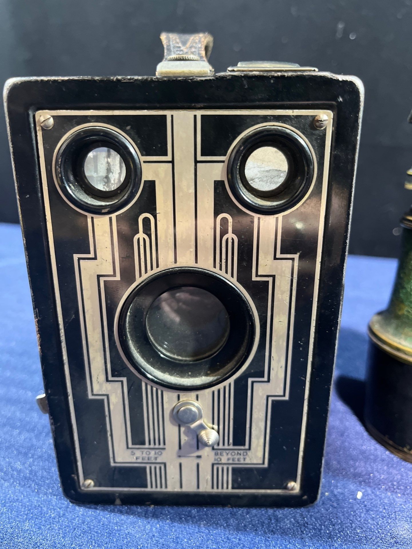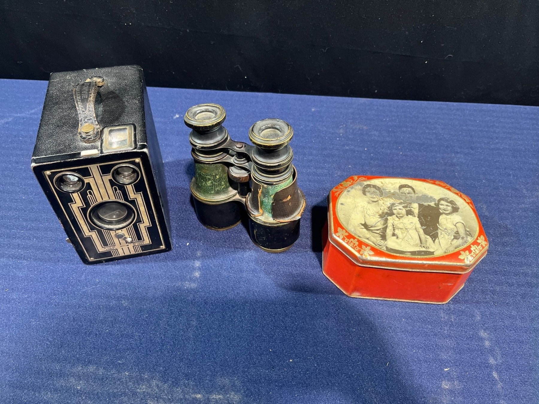Kodak Brownie Camera, Antique Binoculars, and a Royal Family Collectors Tin full of Marbles