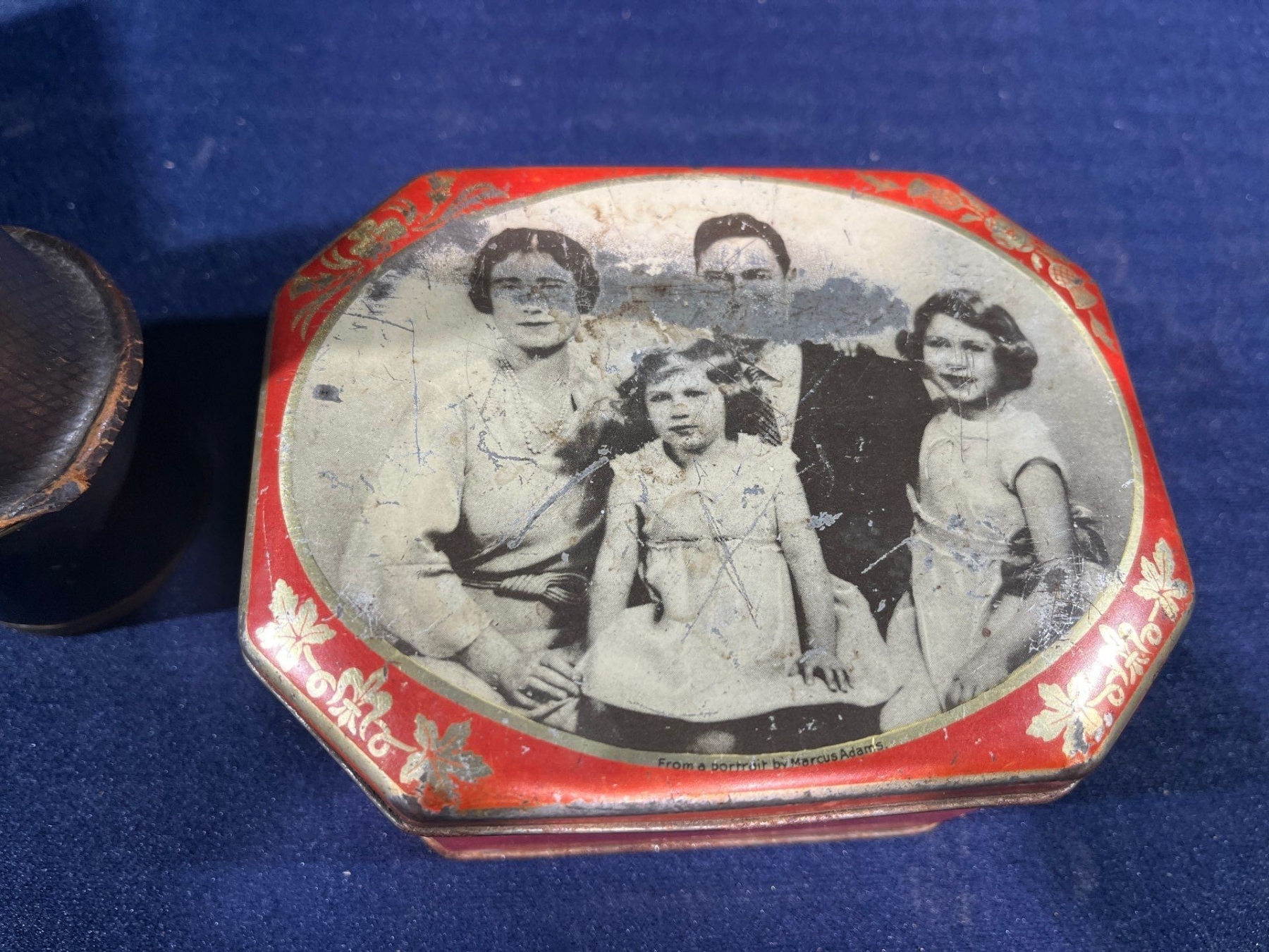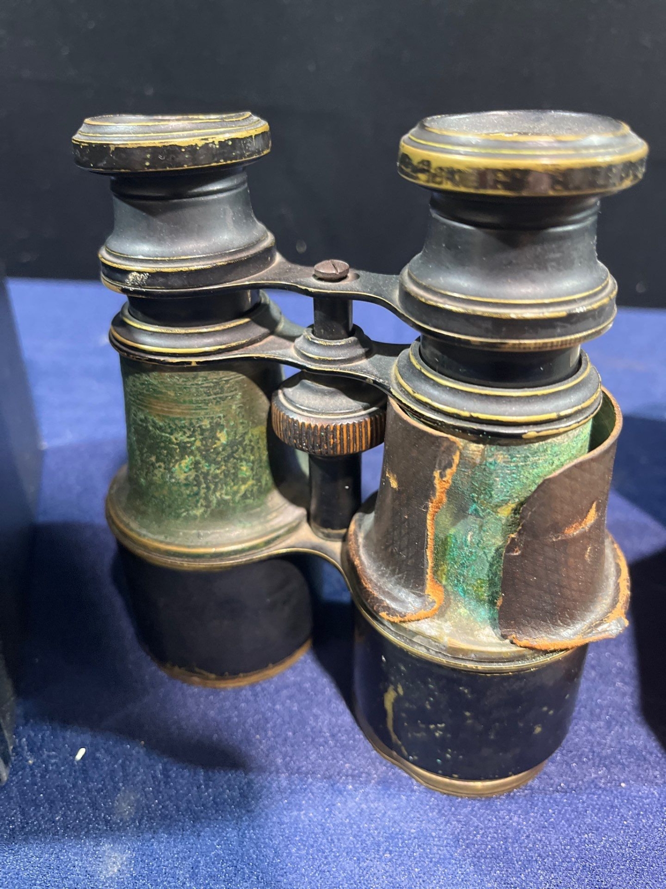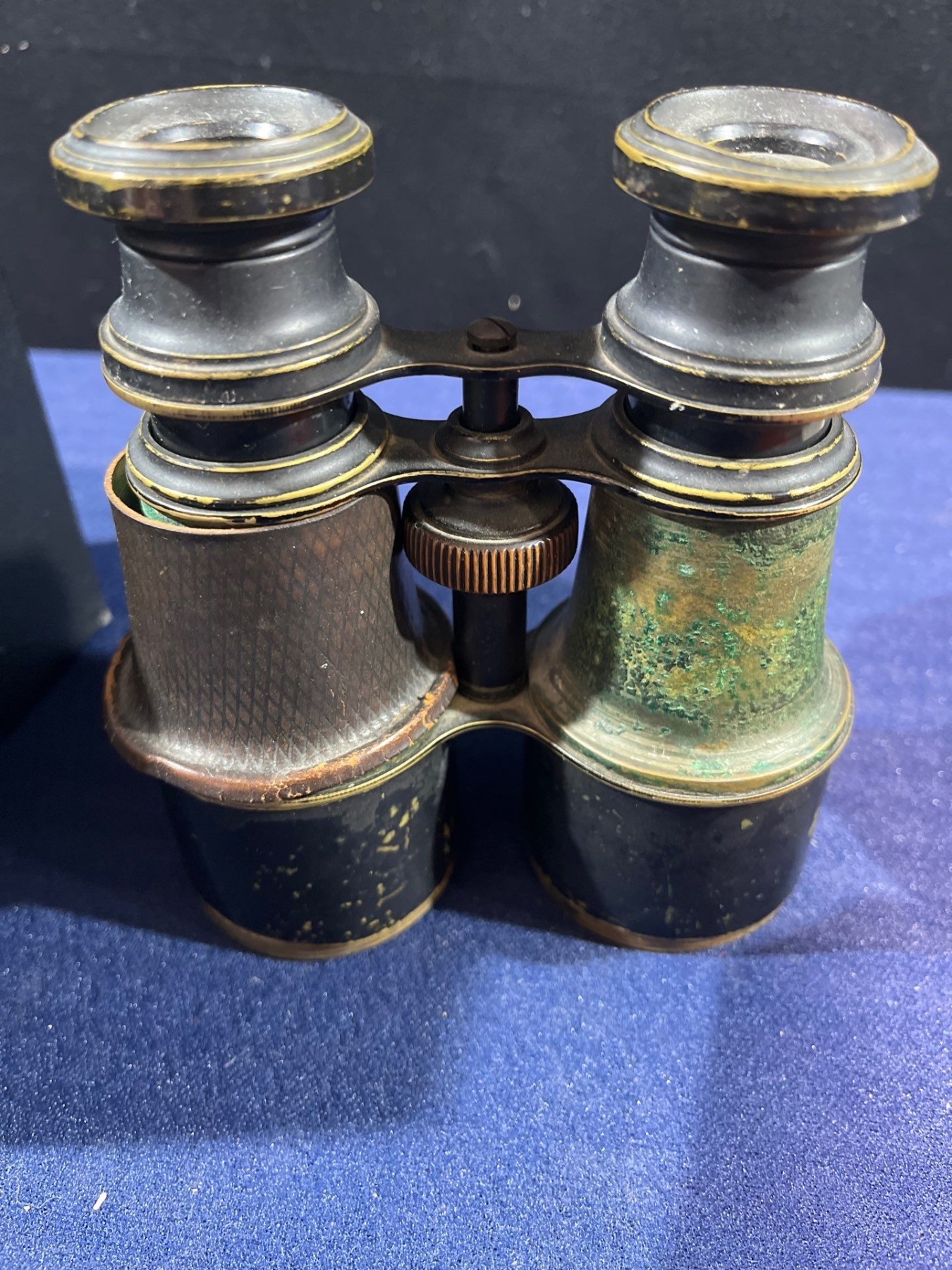 Kodak Brownie Camera, Antique Binoculars, and a Royal Family Collectors Tin full of Marbles