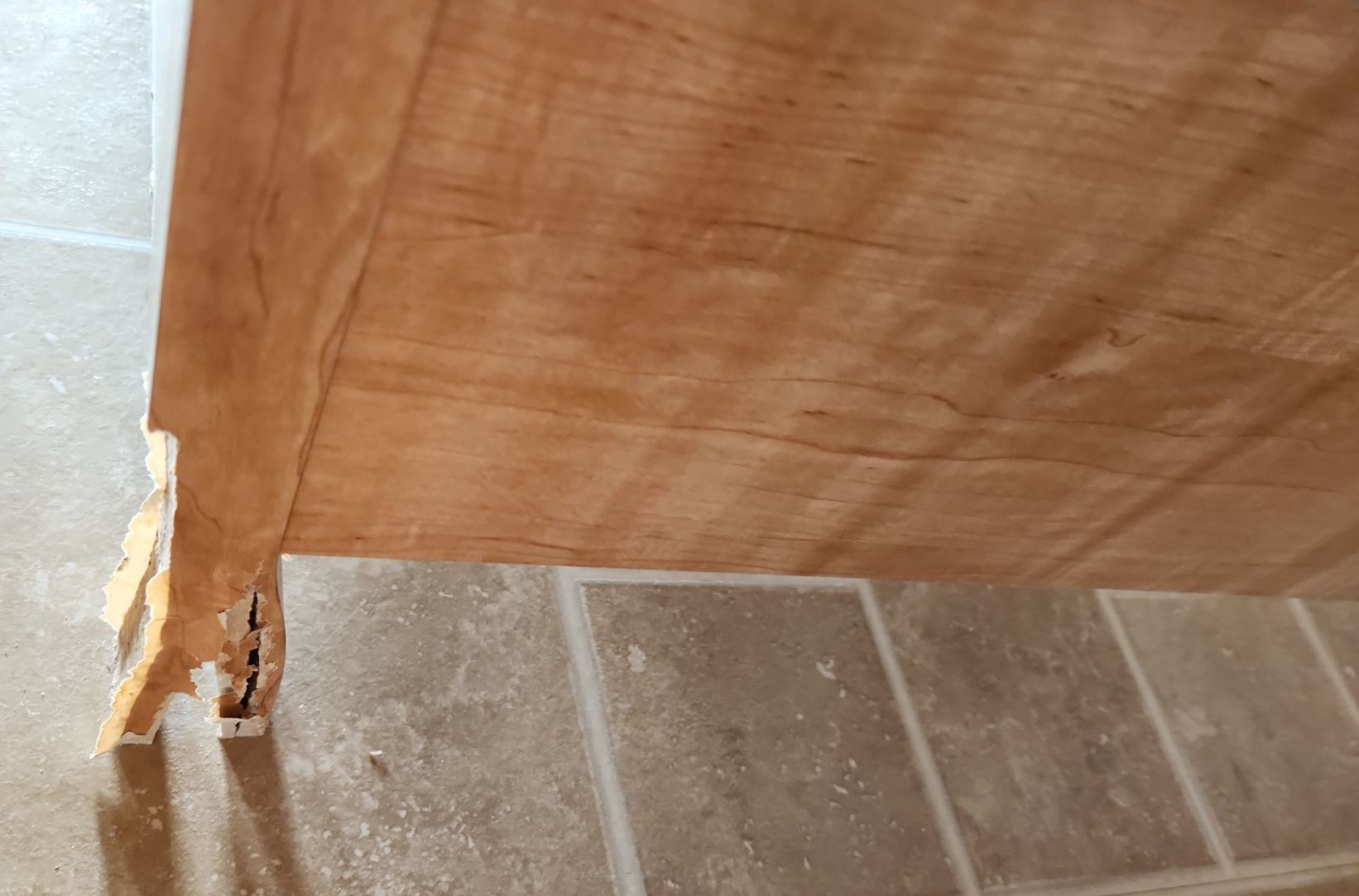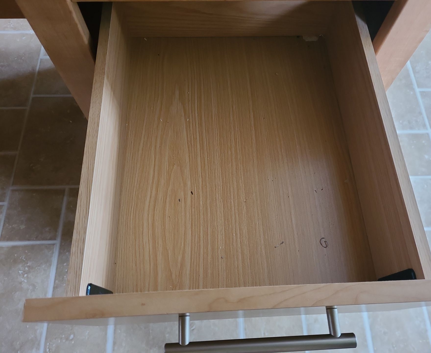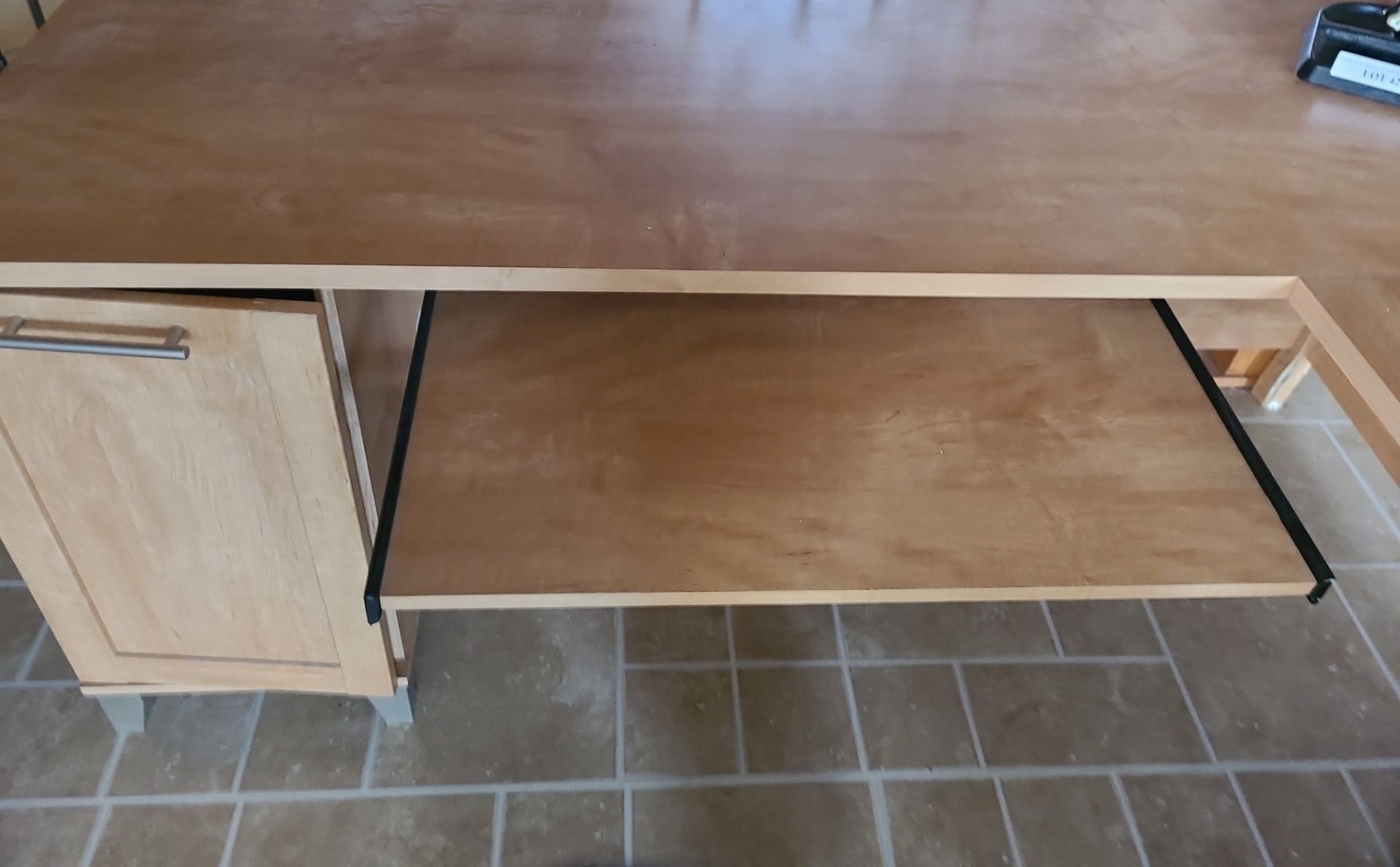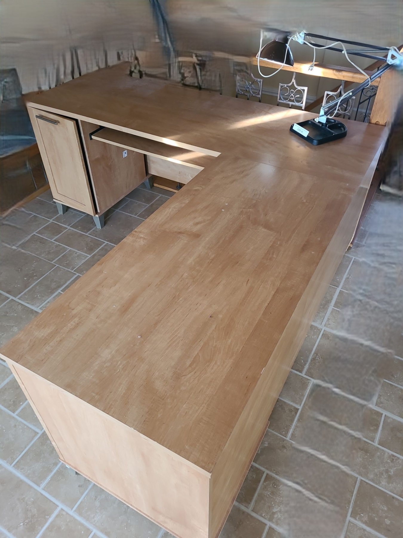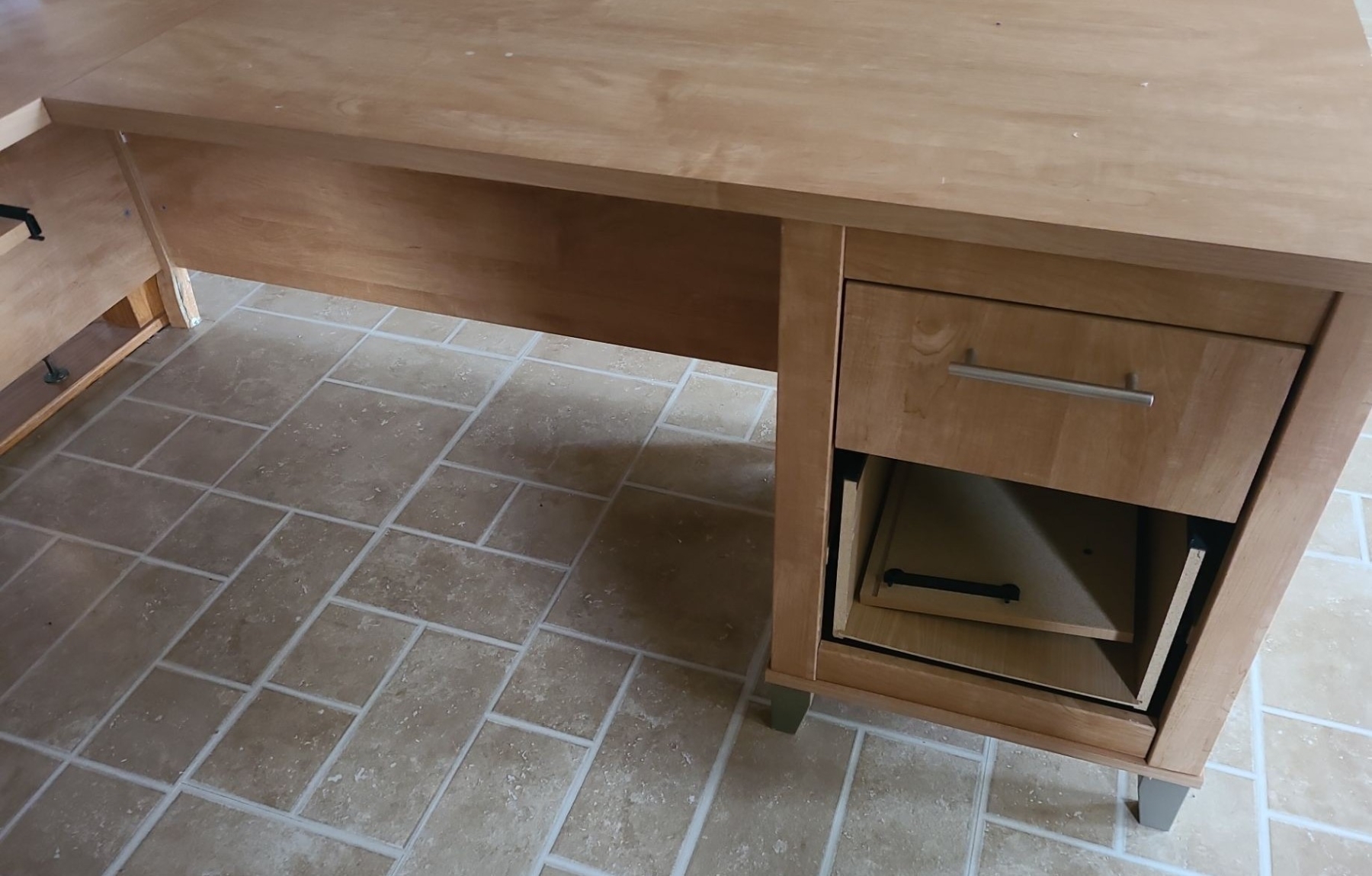 Desk Lamp included. Bottom Drawer needs re-attaching, Centre Support Leg Damaged, Bring Tools, disassembly required