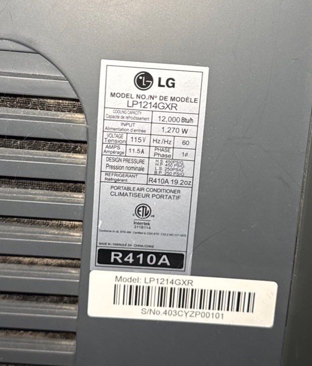 LG Portable Air Conditioner ModelNo: LP1214G XR
