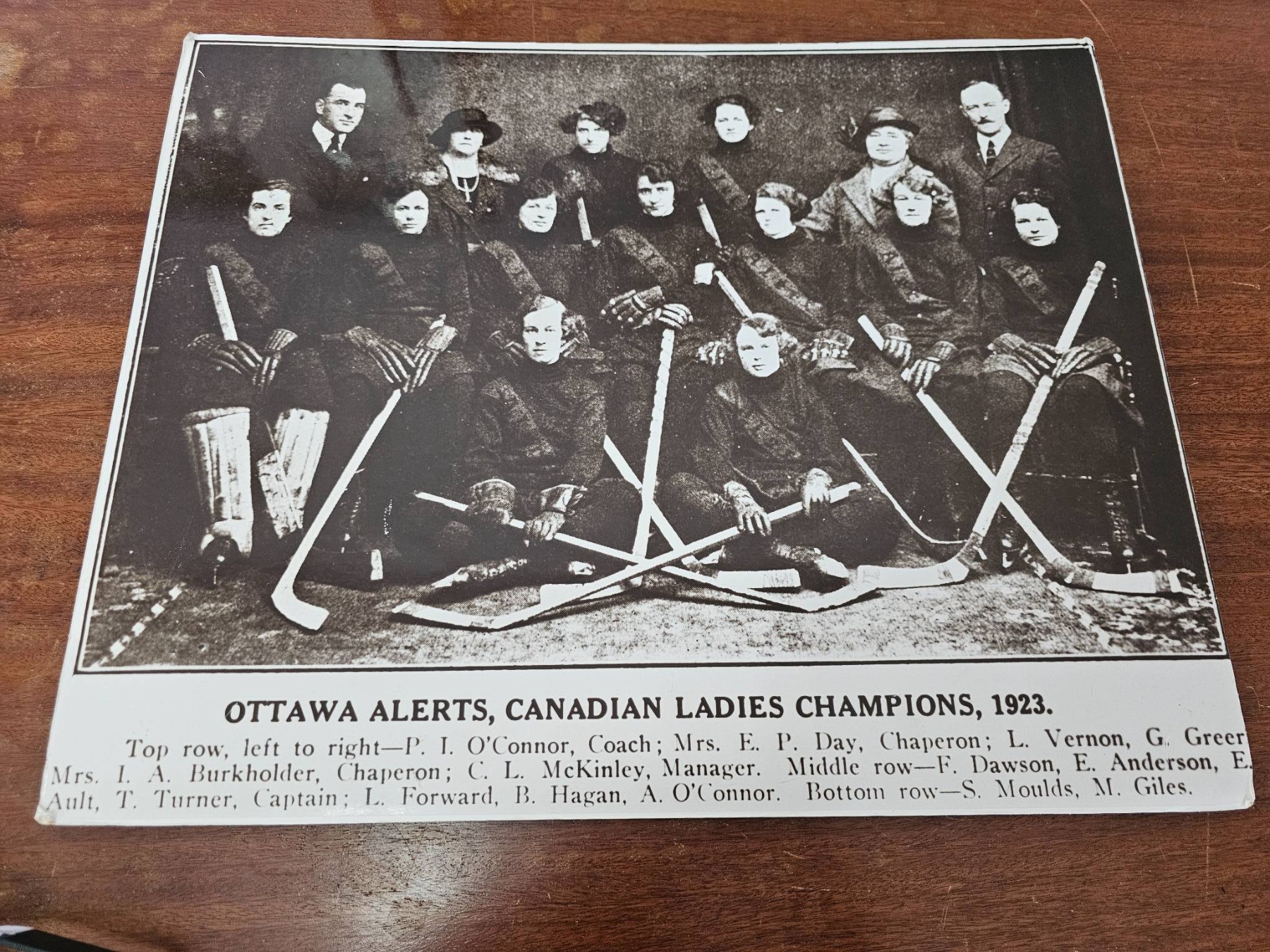 Ladies hockey team photographs and ephemera, including historic team portraits and modern photos. Items include a Cobalt-Timiskaming League Ladies Hockey Team photograph, an Ottawa Alerts Canadian Ladies Champions 1922 team portrait, and a collection of modern hockey imagery. Some wear and discoloration present due to age and handling.
