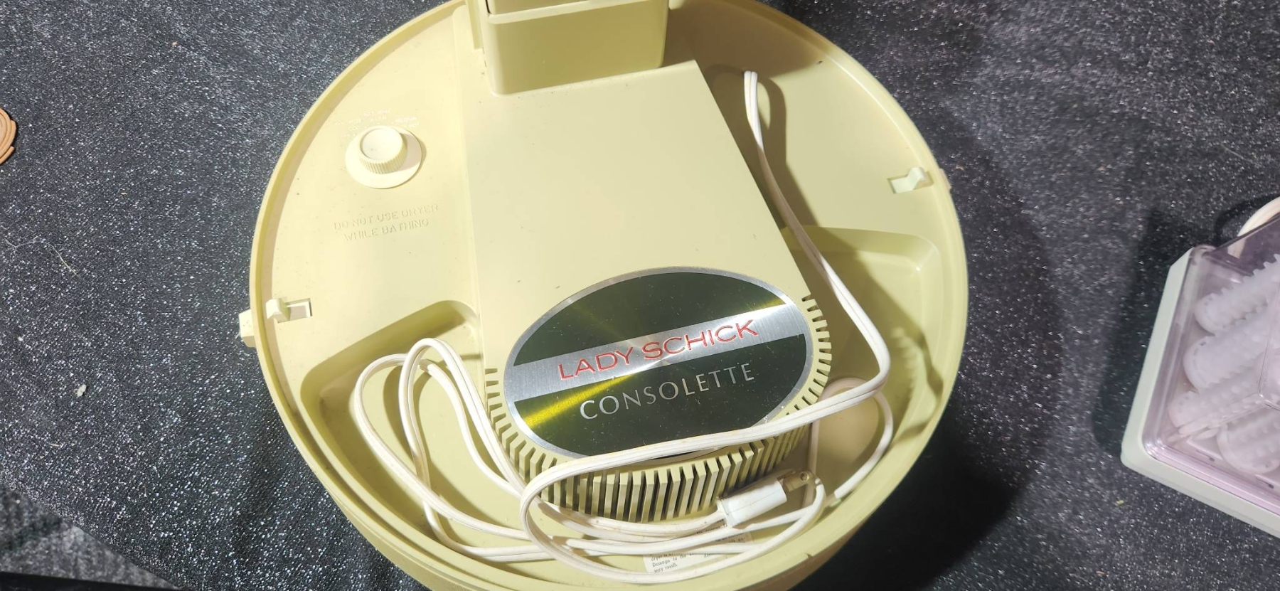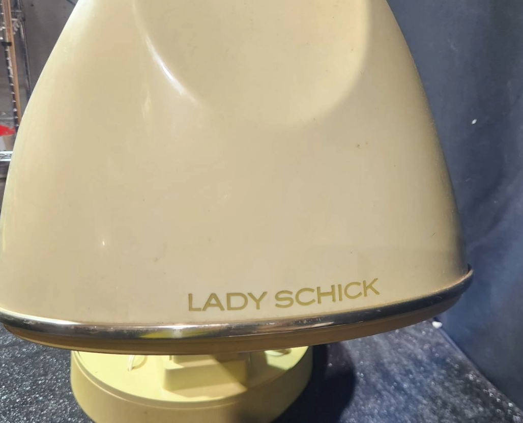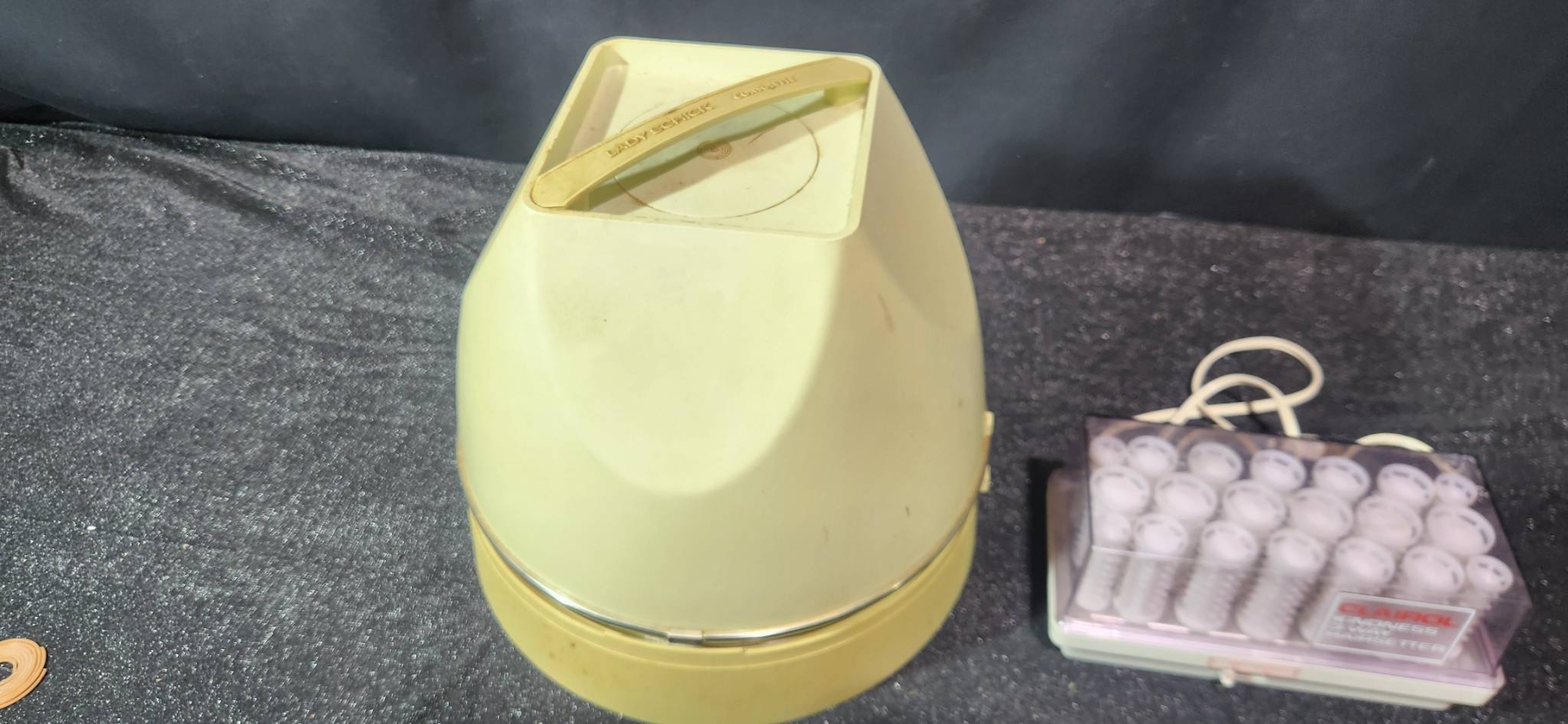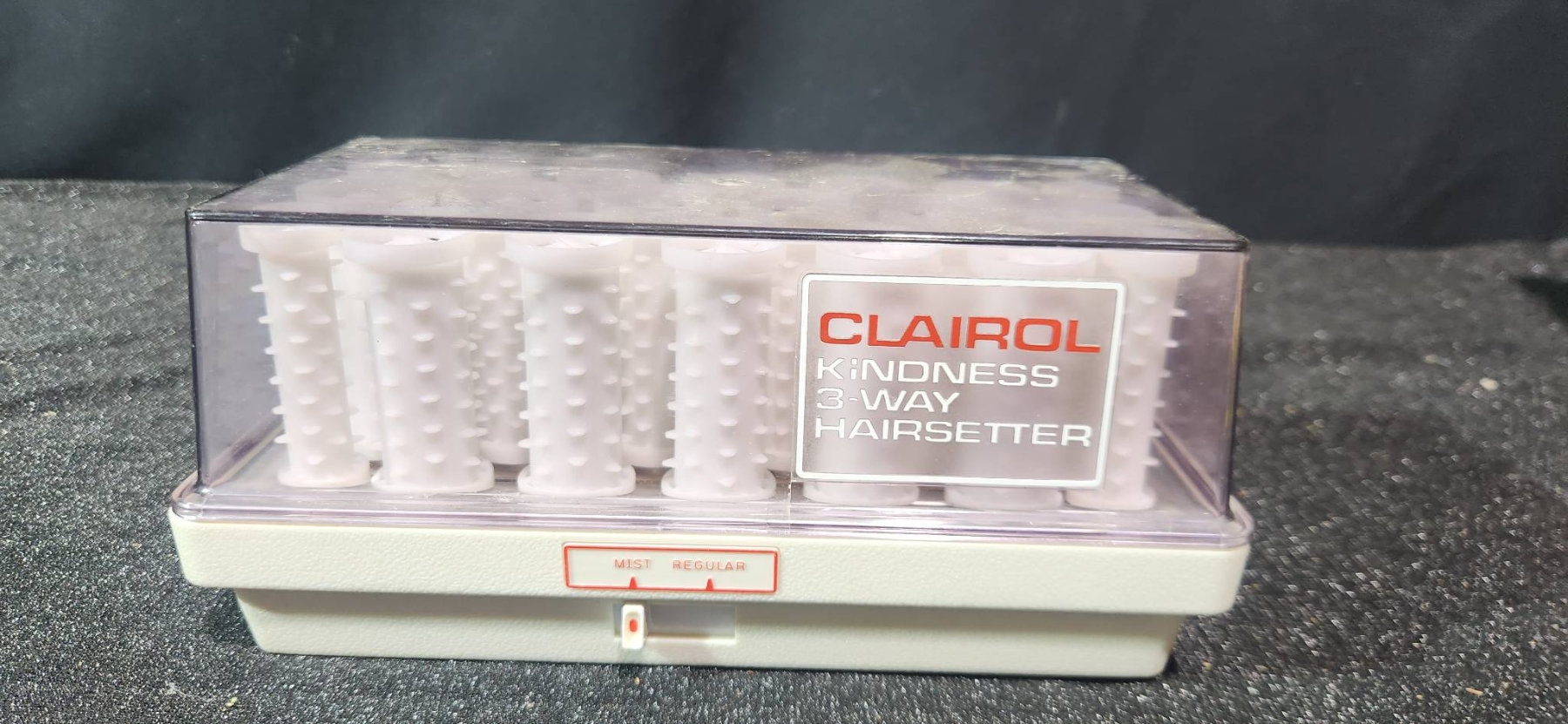 Tested and working Lady Schick hair dryer and Clairol Kindness hairsetter set. The Lady Schick dryer features a compact design with a built-in vented hood for consistent drying. The Clairol Kindness hairsetter comes with multiple rollers in excellent condition for quick styling. These are perfect for hair enthusiasts or collectors seeking functional, retro beauty equipment.