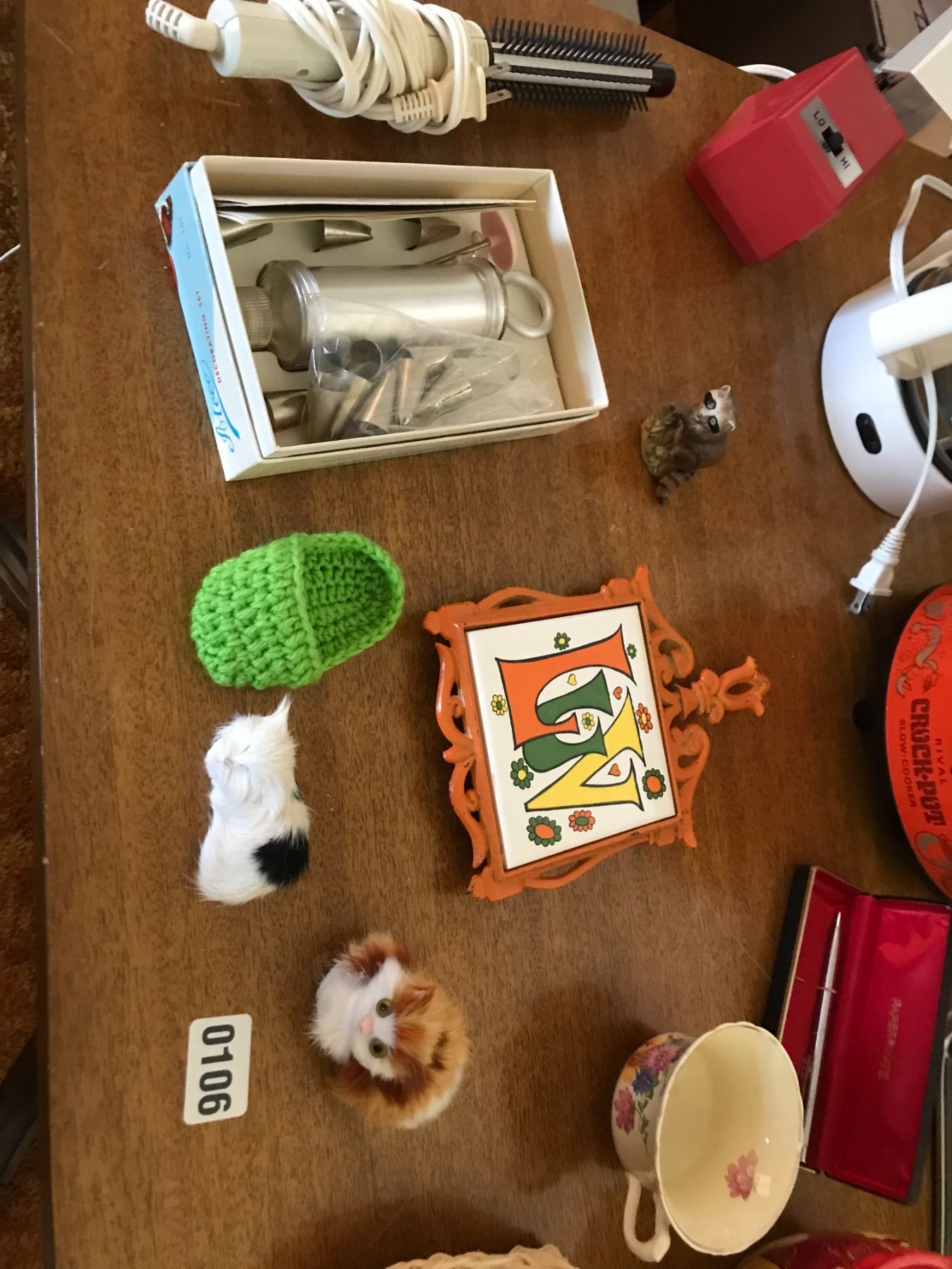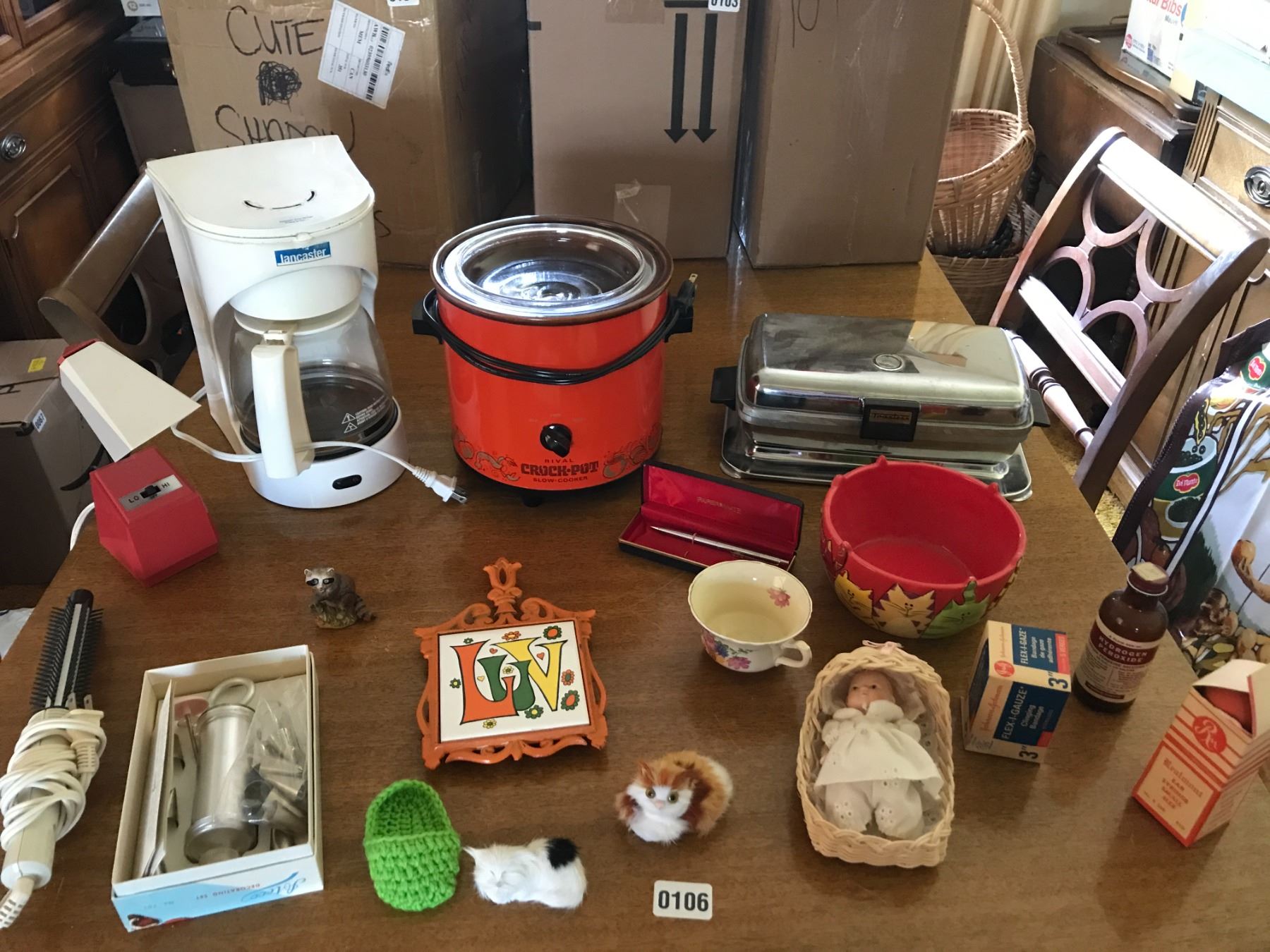 Lancaster Coffee Post, Rival Coffee Crock Pot, Vintage Waffle Maker, Asst Vintage Home Decor, Ointments, Cake Decorative Set, Curling Iron & Vintage Mini Light