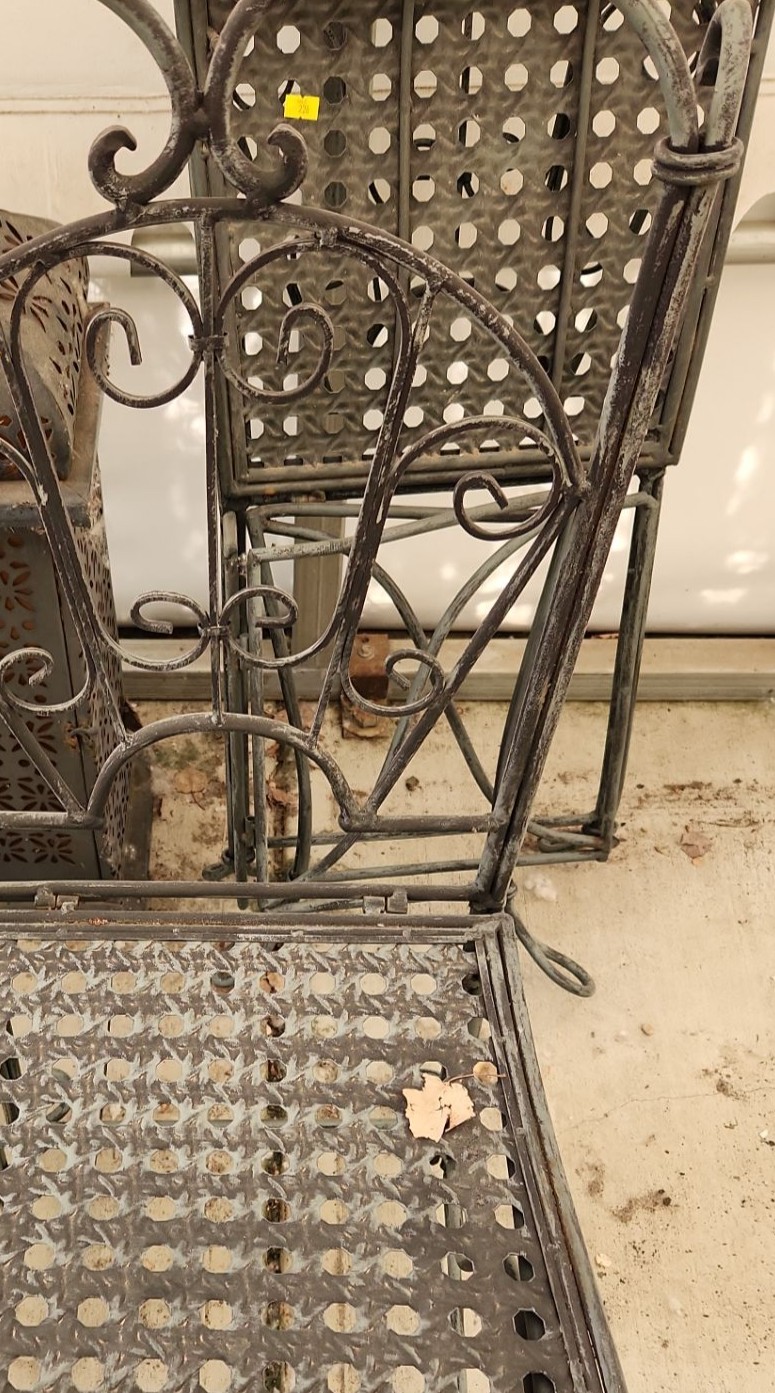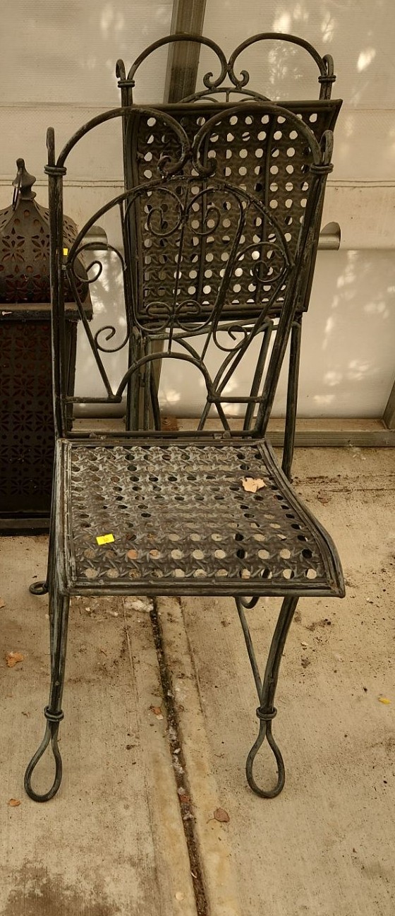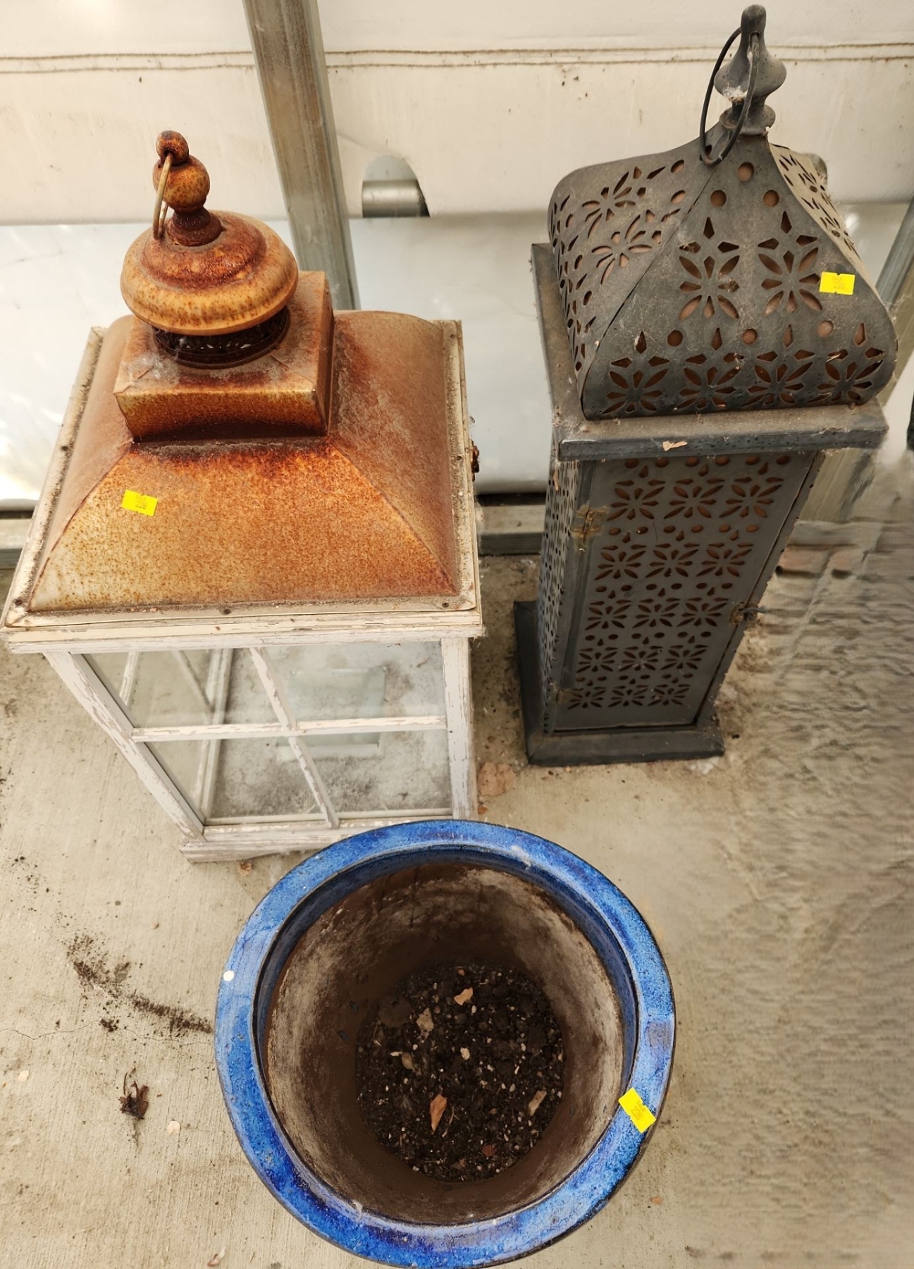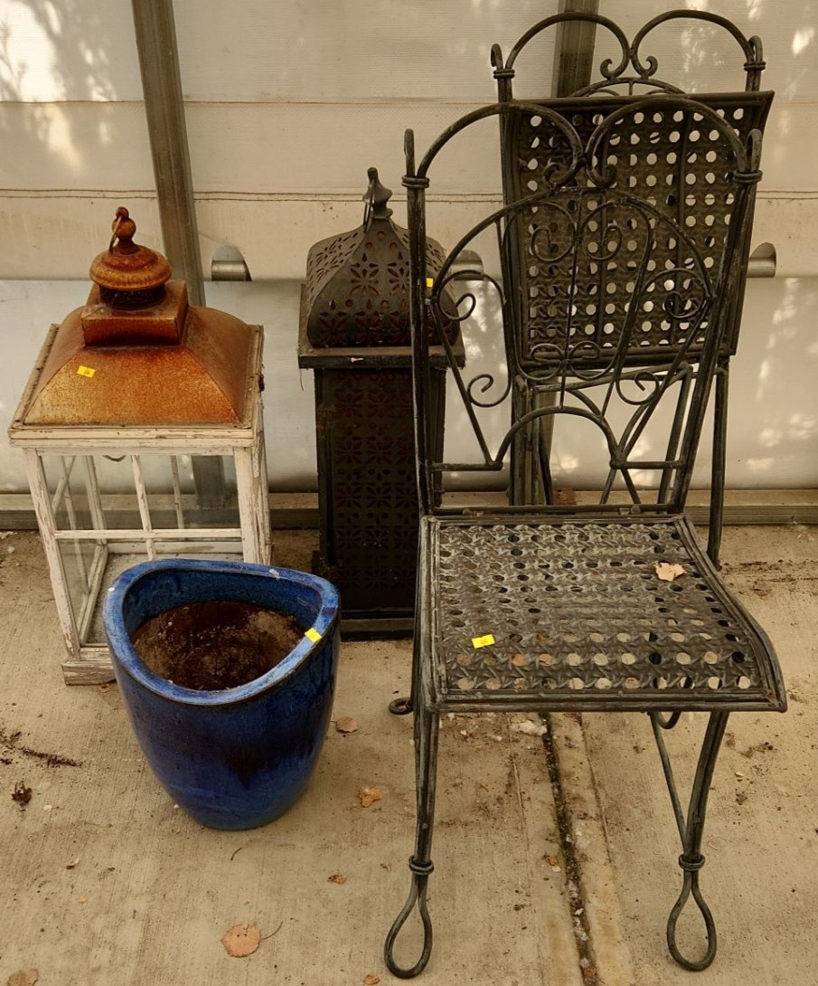 Lanterns 29/ 30 T, 2 Folding Metal Garden Chairs 15 W, 20 D 36 T and Blue Ceramic Flower Pot 14 T