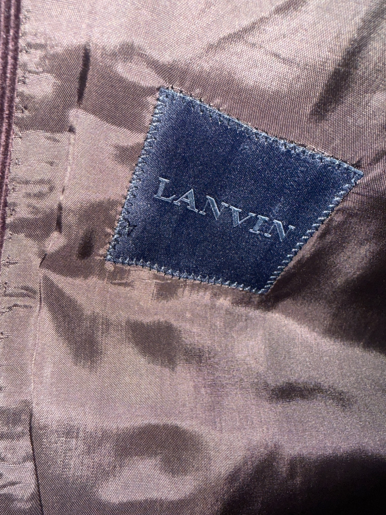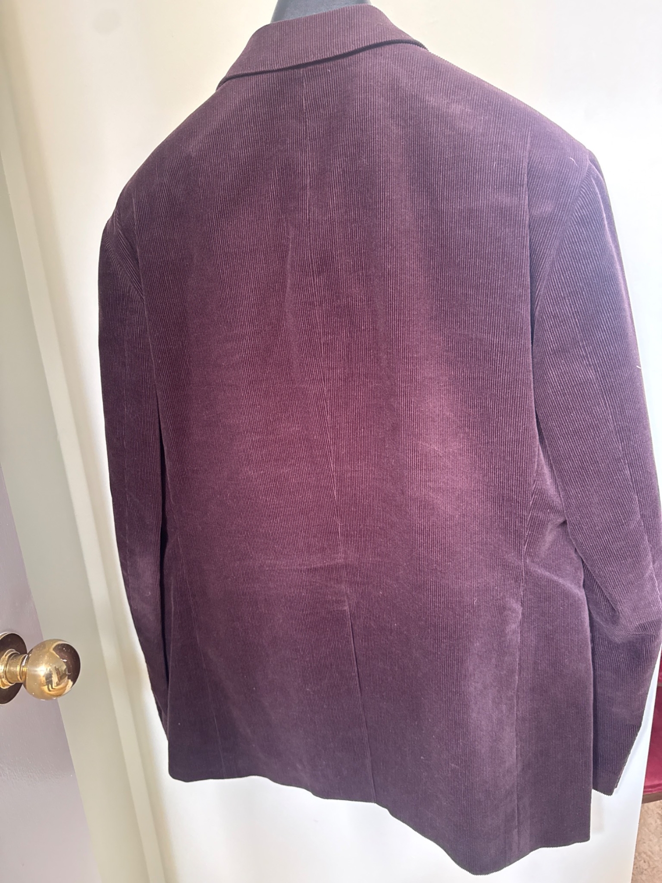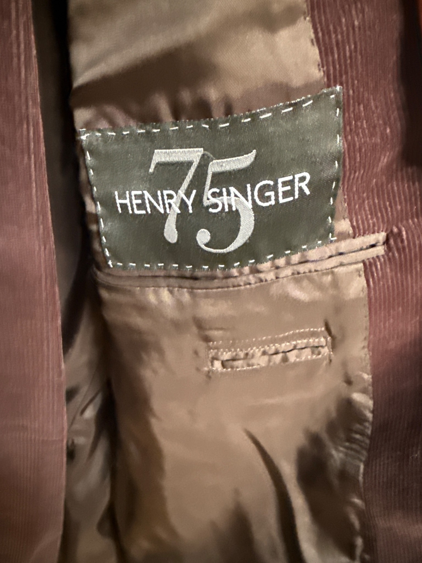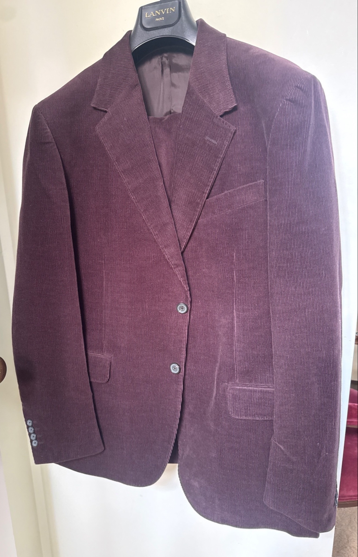 A stylish Lanvin corduroy jacket, crafted in a rich burgundy hue, featuring interior branding. Paired with a Henry Singer branded shirt, this sophisticated combination offers timeless appeal. Ideal for business or casual wear. Size 42 tall making a great tailored fit essential. Both items exhibit excellent attention to detail and craftsmanship.