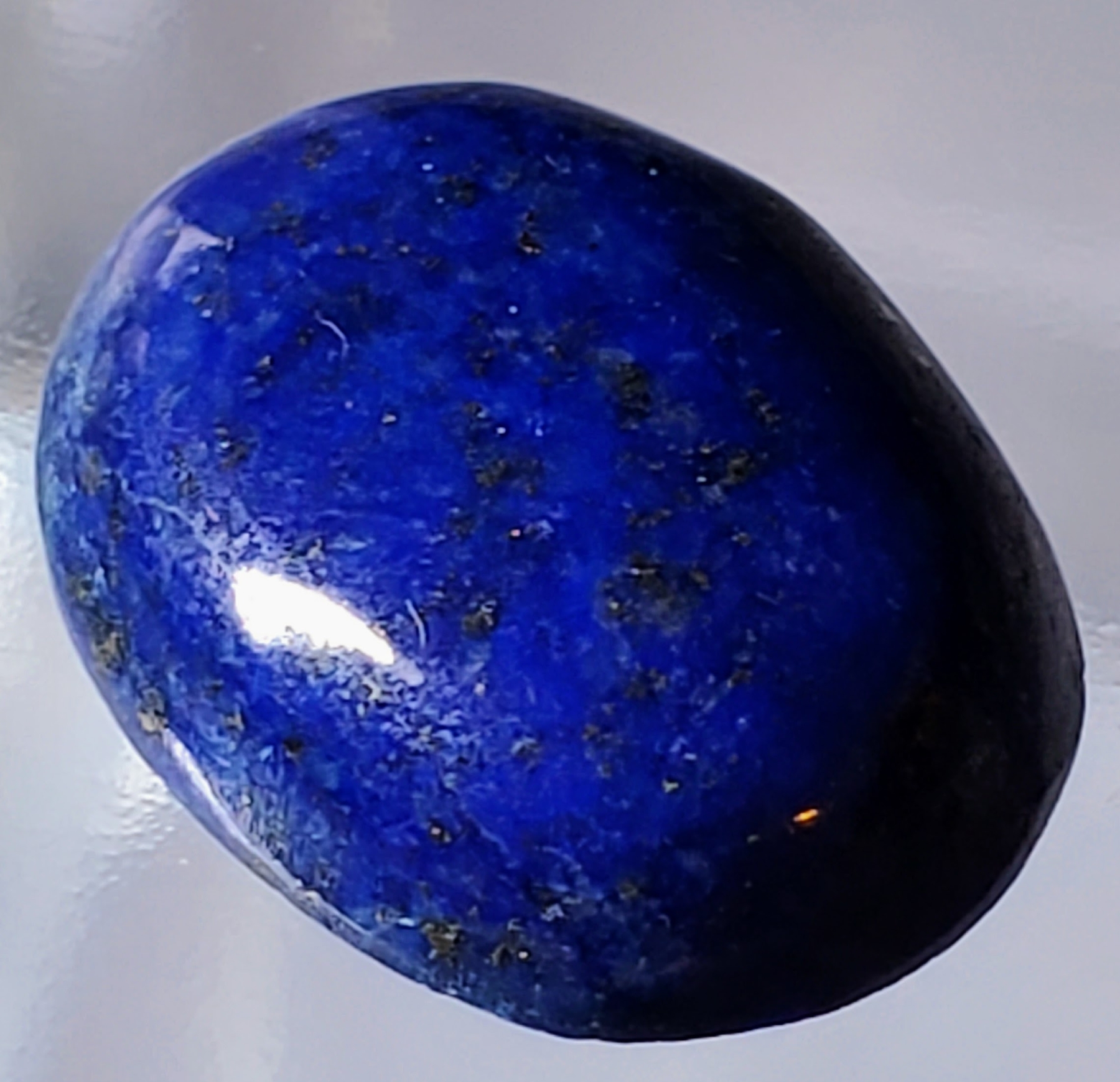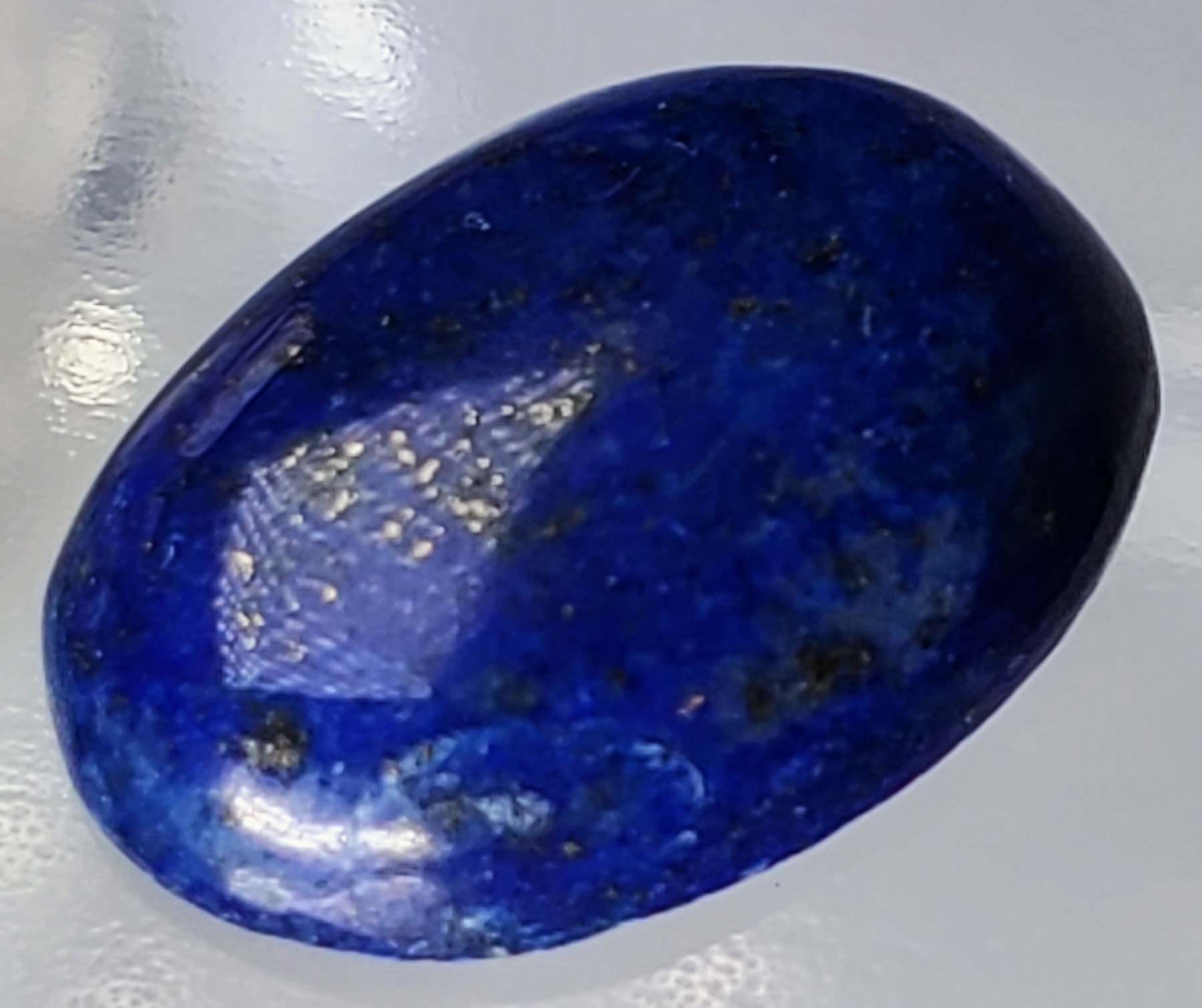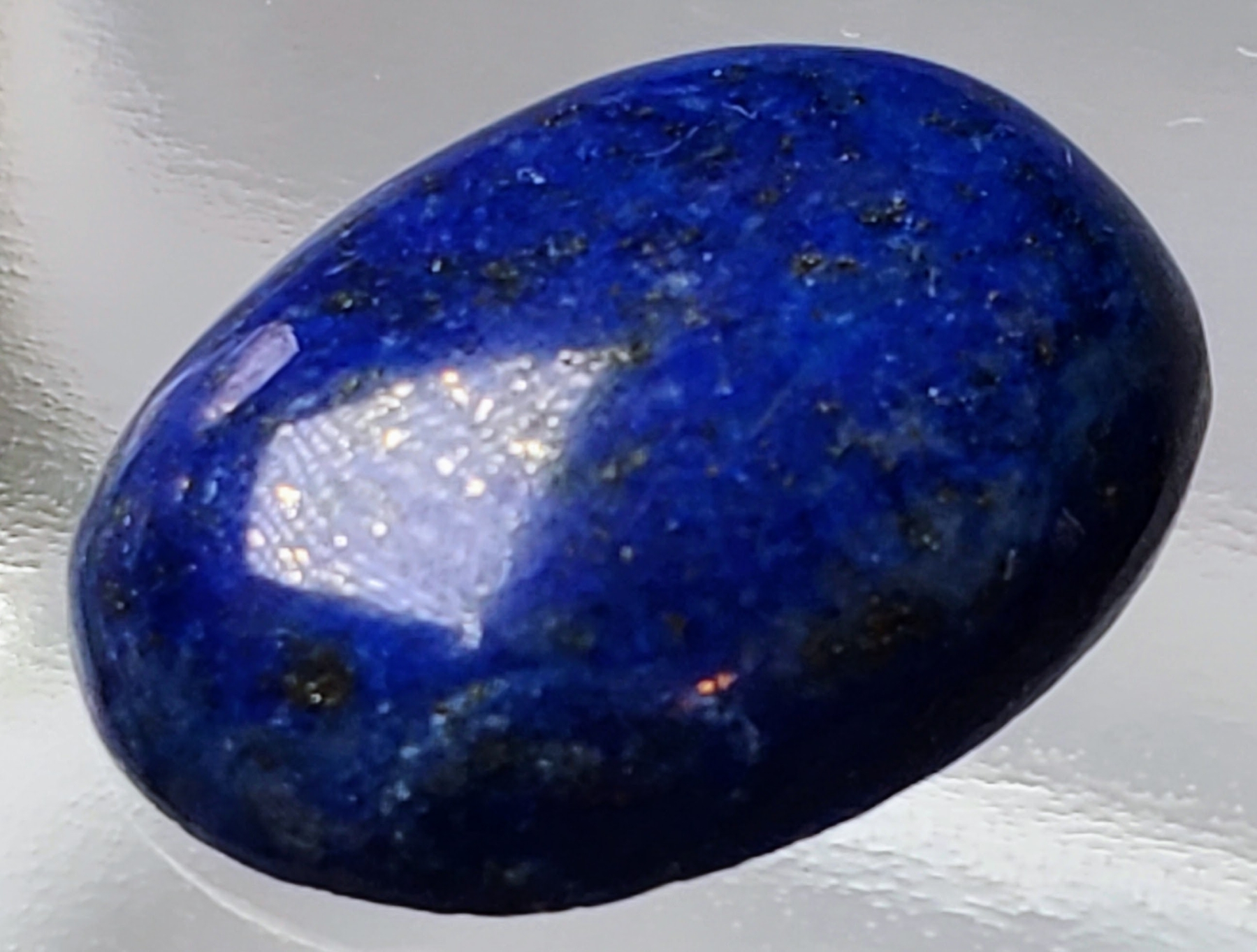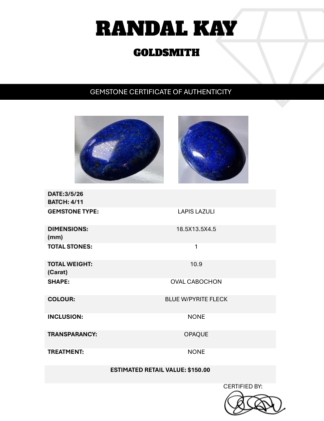 A 10.9-carat lapis cabochon featuring deep blue color with natural pyrite flecks and smooth polish. Opaque and untreated, it offers classic appeal. Estimated retail price is $150.