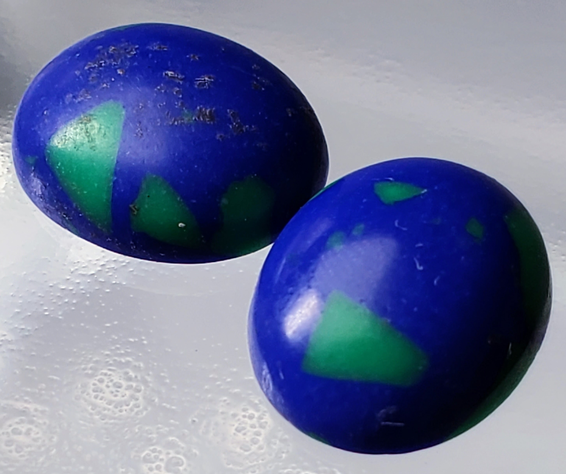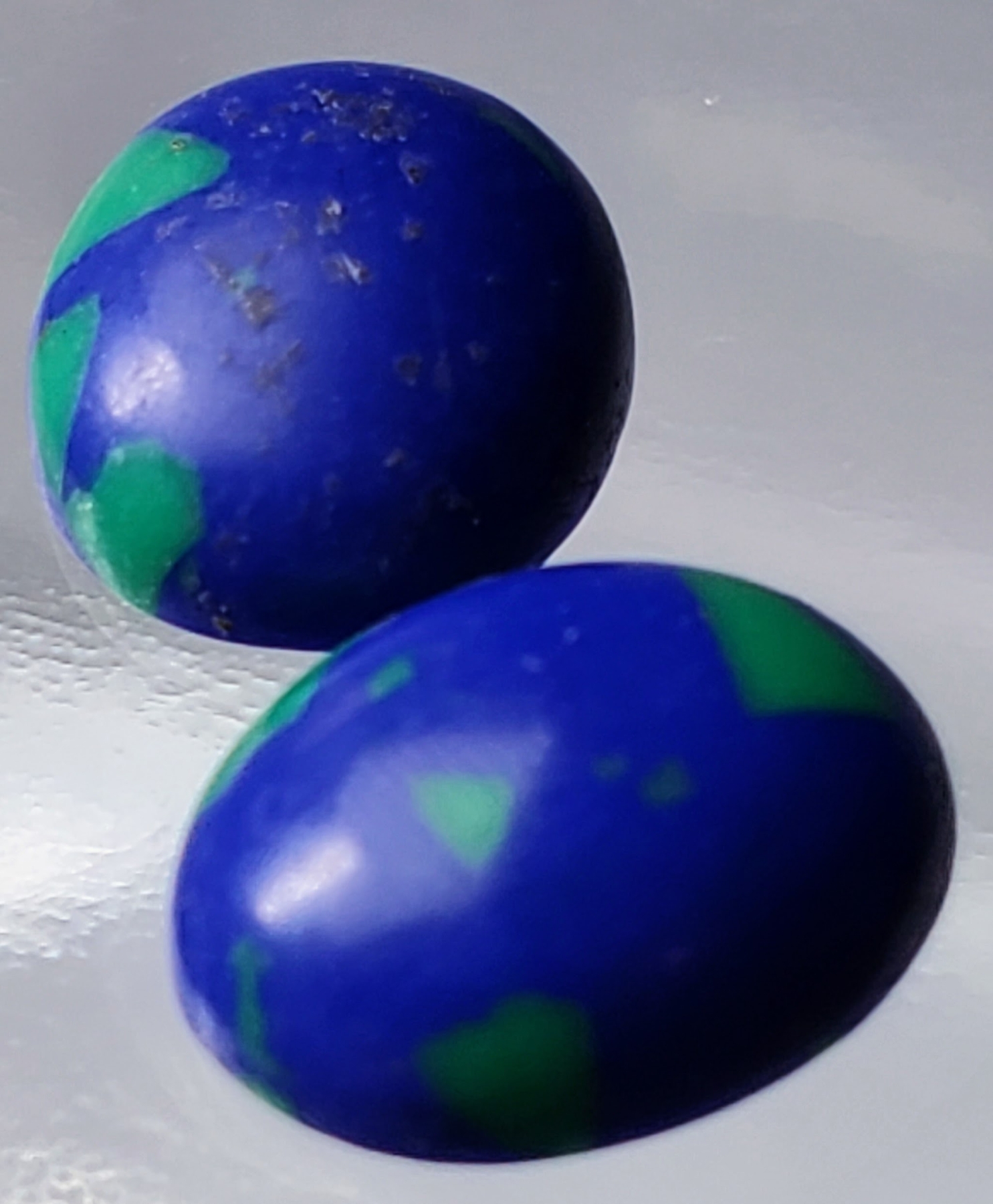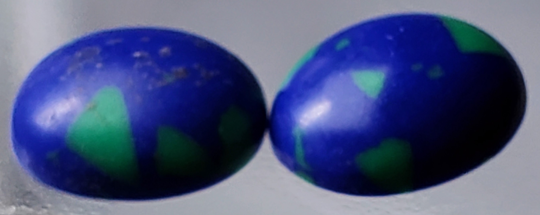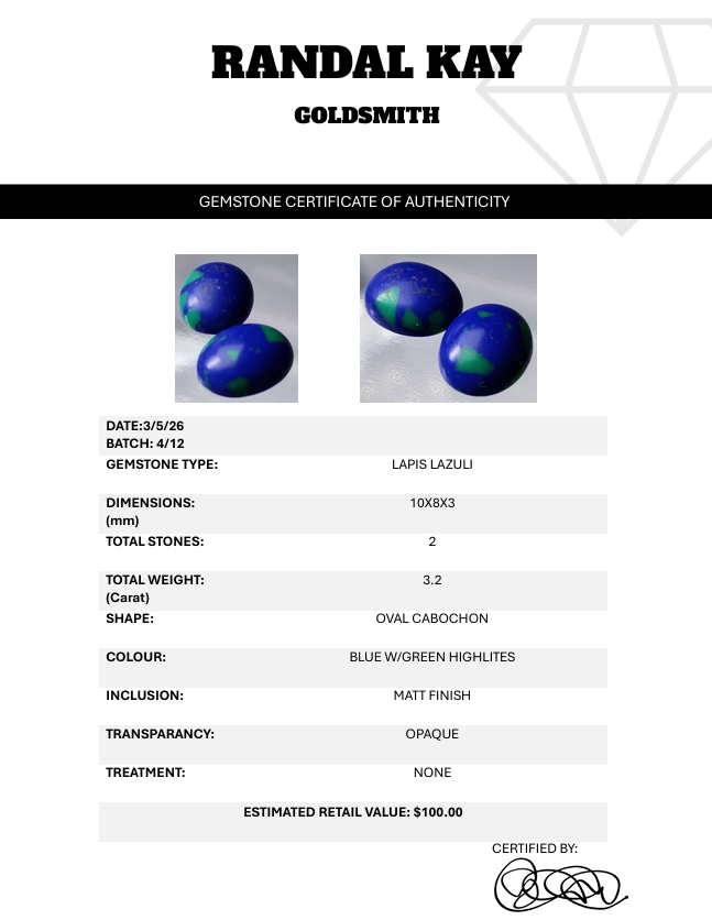 A 3.2-carat pair of blue lapis cabochons with green highlights and matte finish, offering natural earthy character and charm. Estimated retail price is $100.