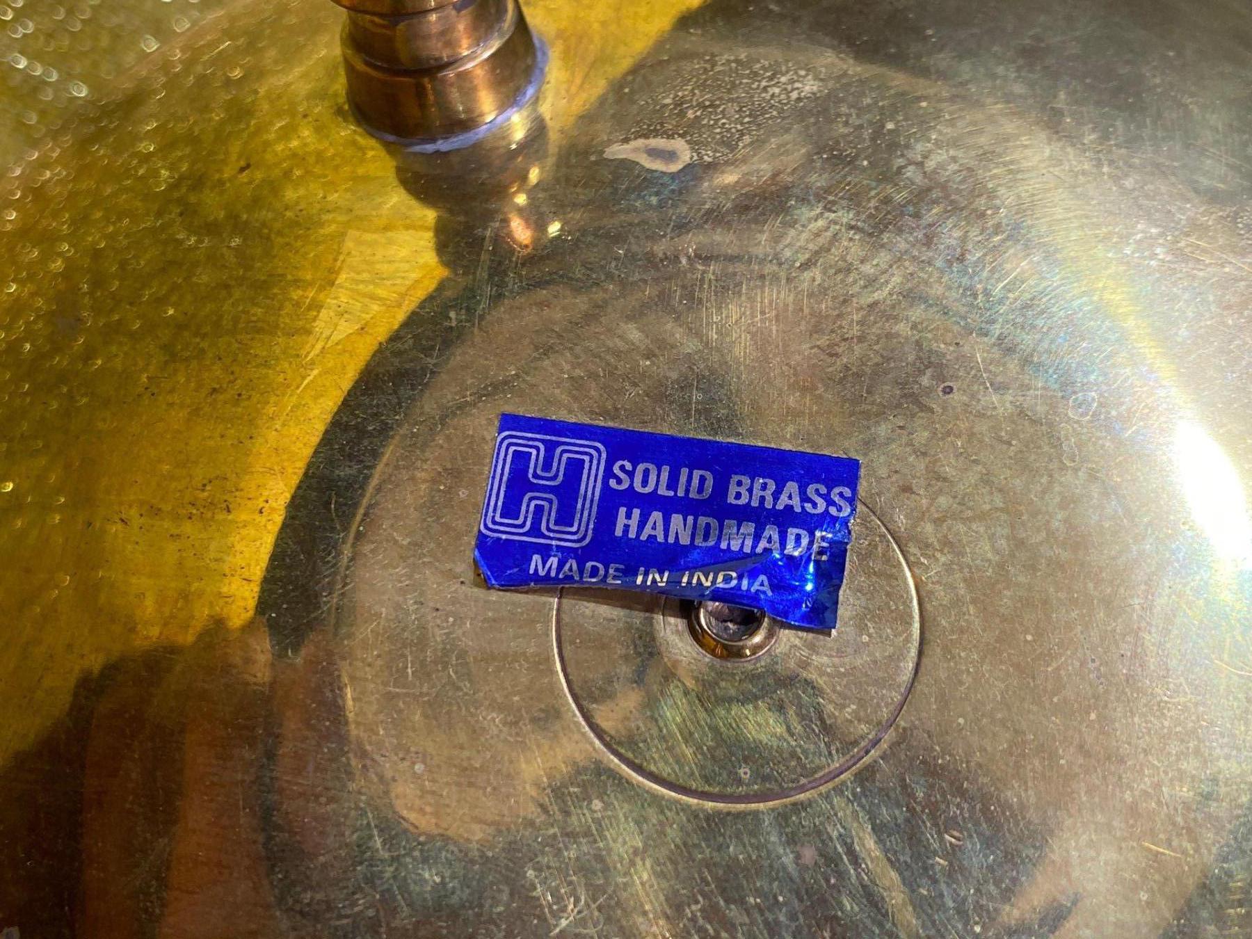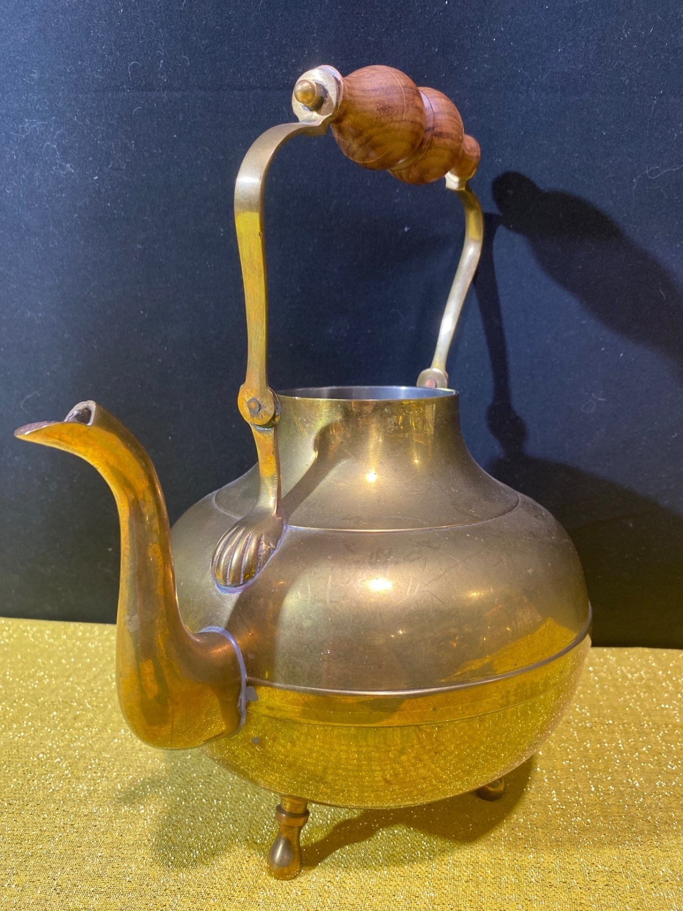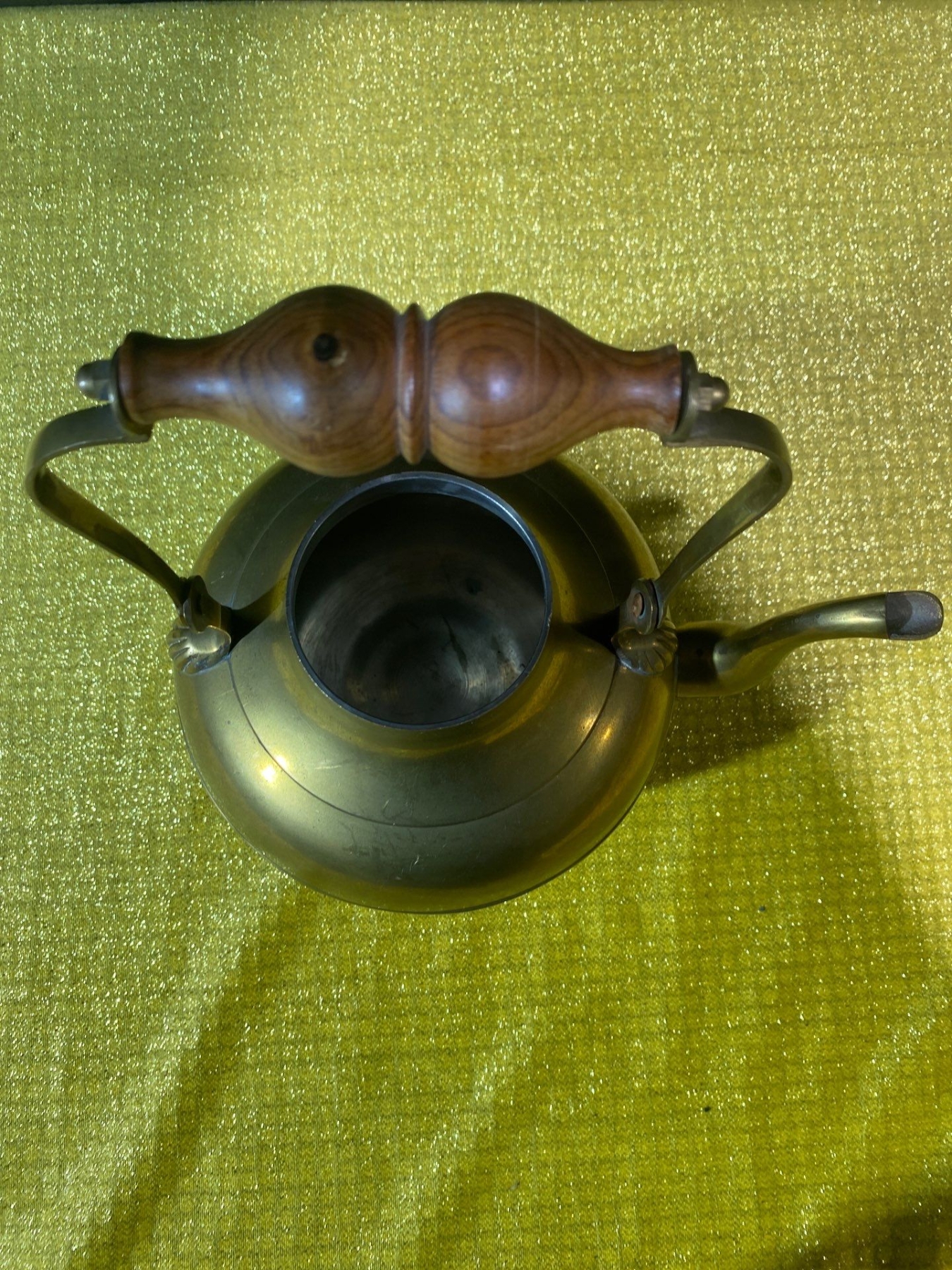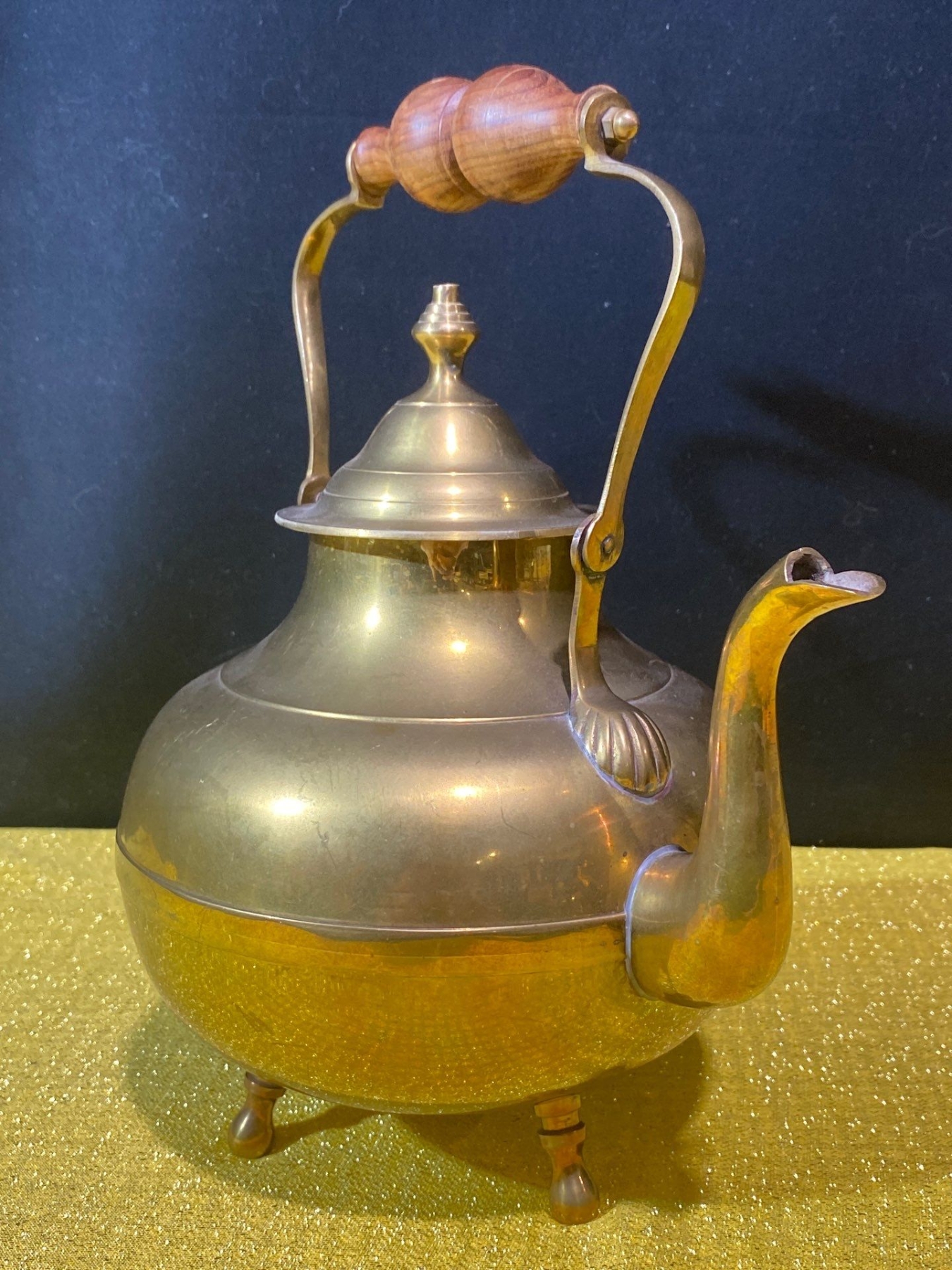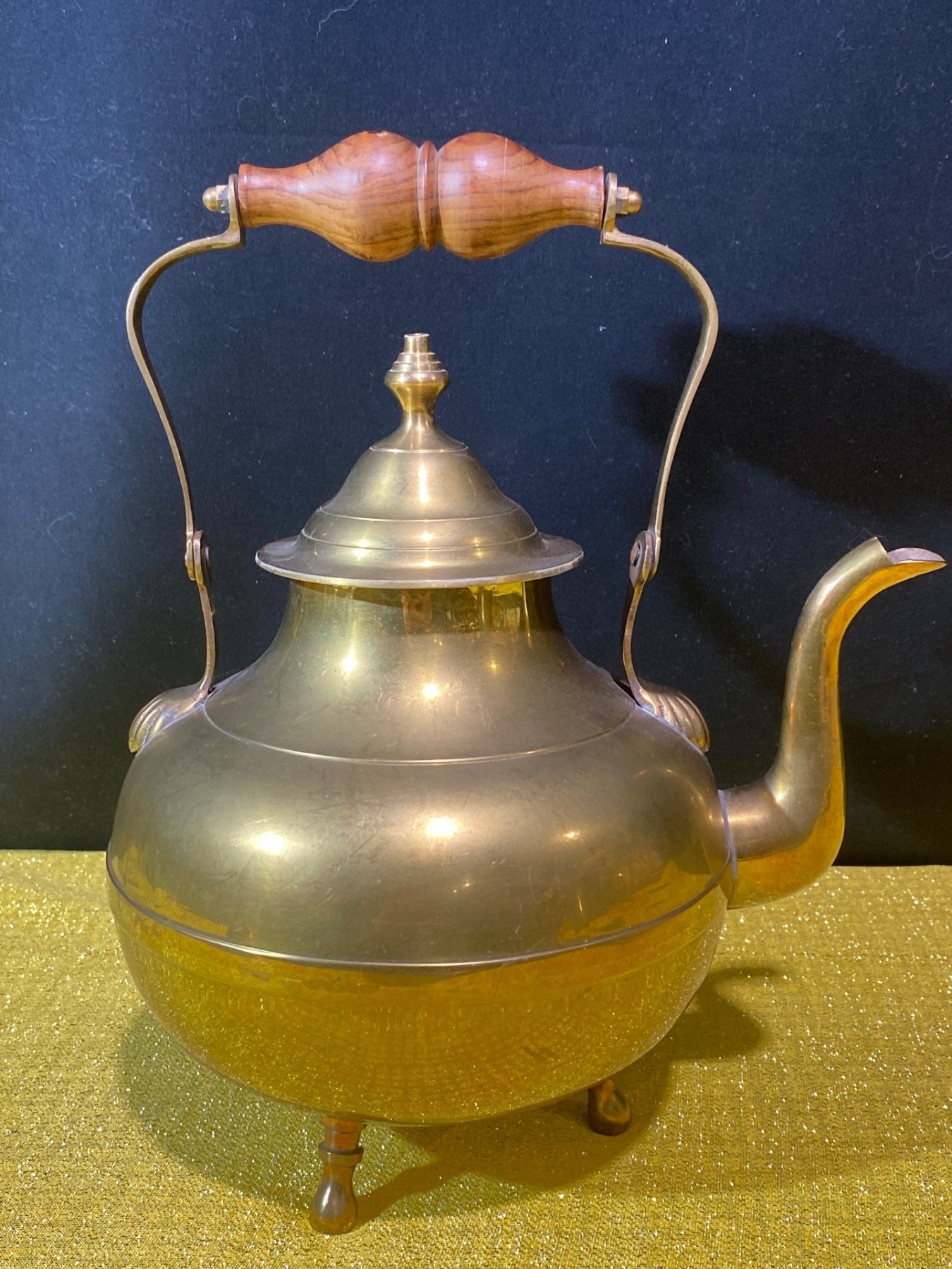 A substantial antique brass kettle featuring a sturdy wooden handle and classic rounded form. Its warm patina and timeless design reflect both functional craftsmanship and decorative charm, making it an ideal piece for collectors of vintage kitchenware or brass decor.