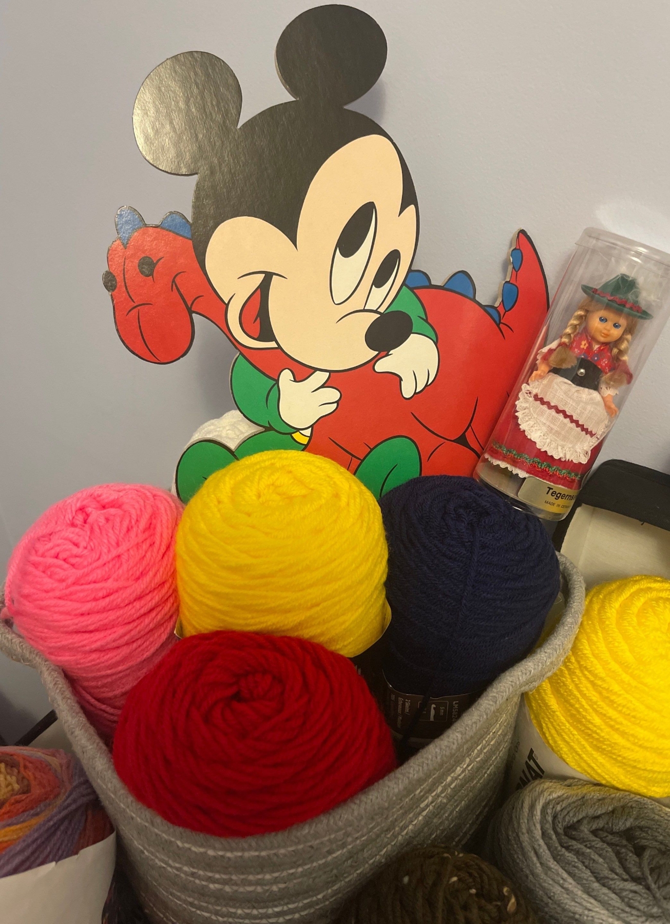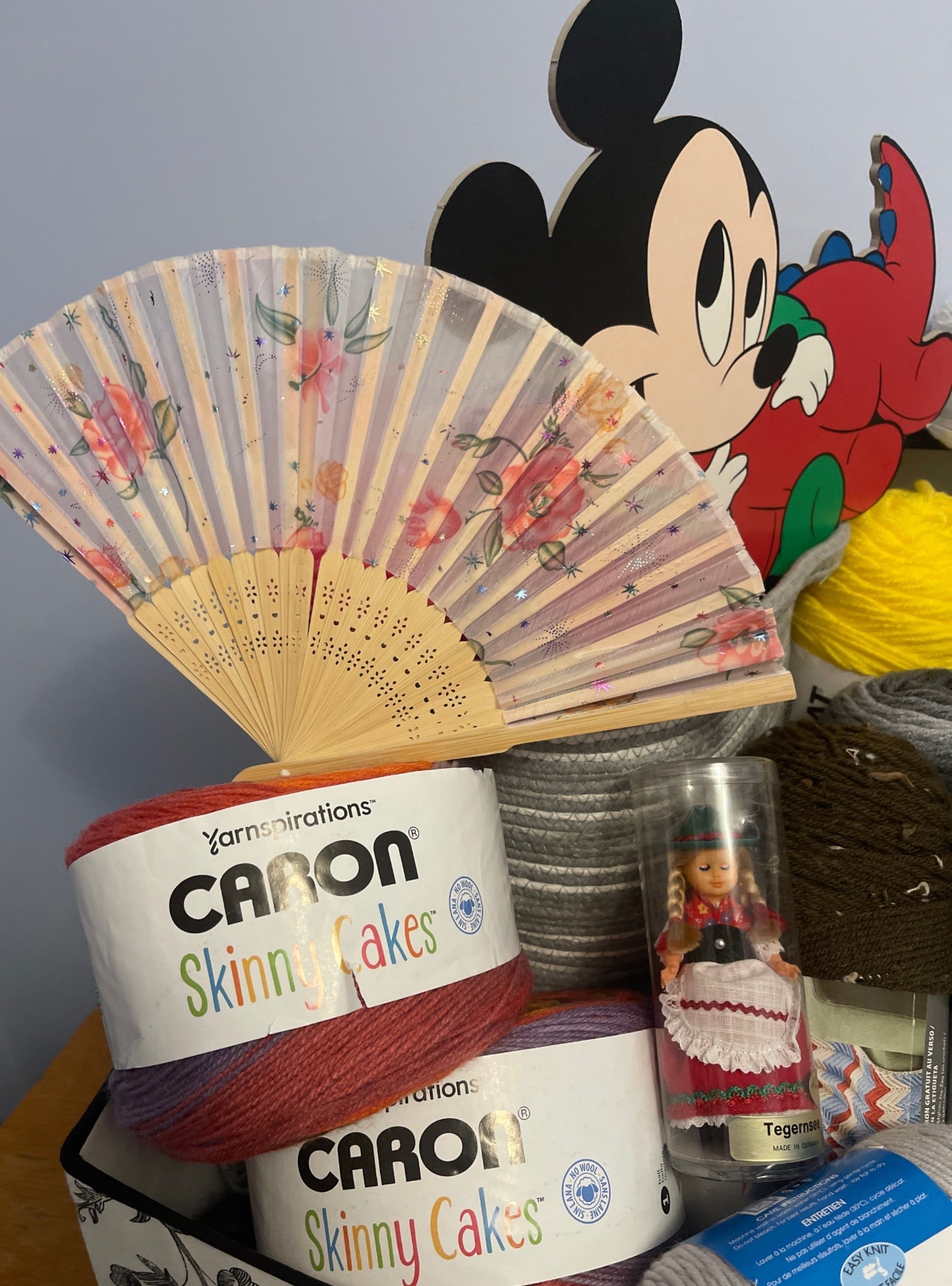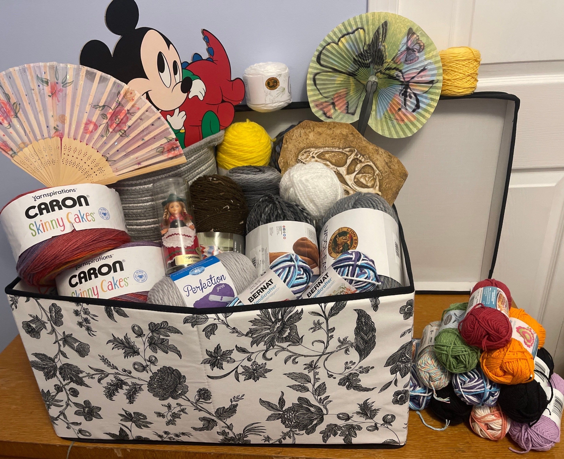 Large Basket Full Of Yard, Thread , Wool, & More!! Mickey Mouse Hand Fans, Crafts, & more