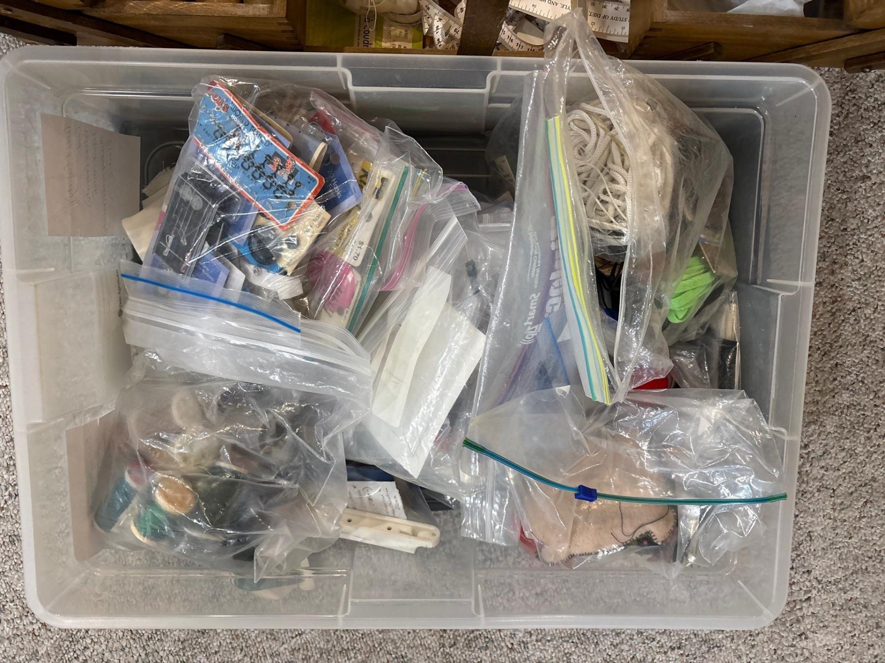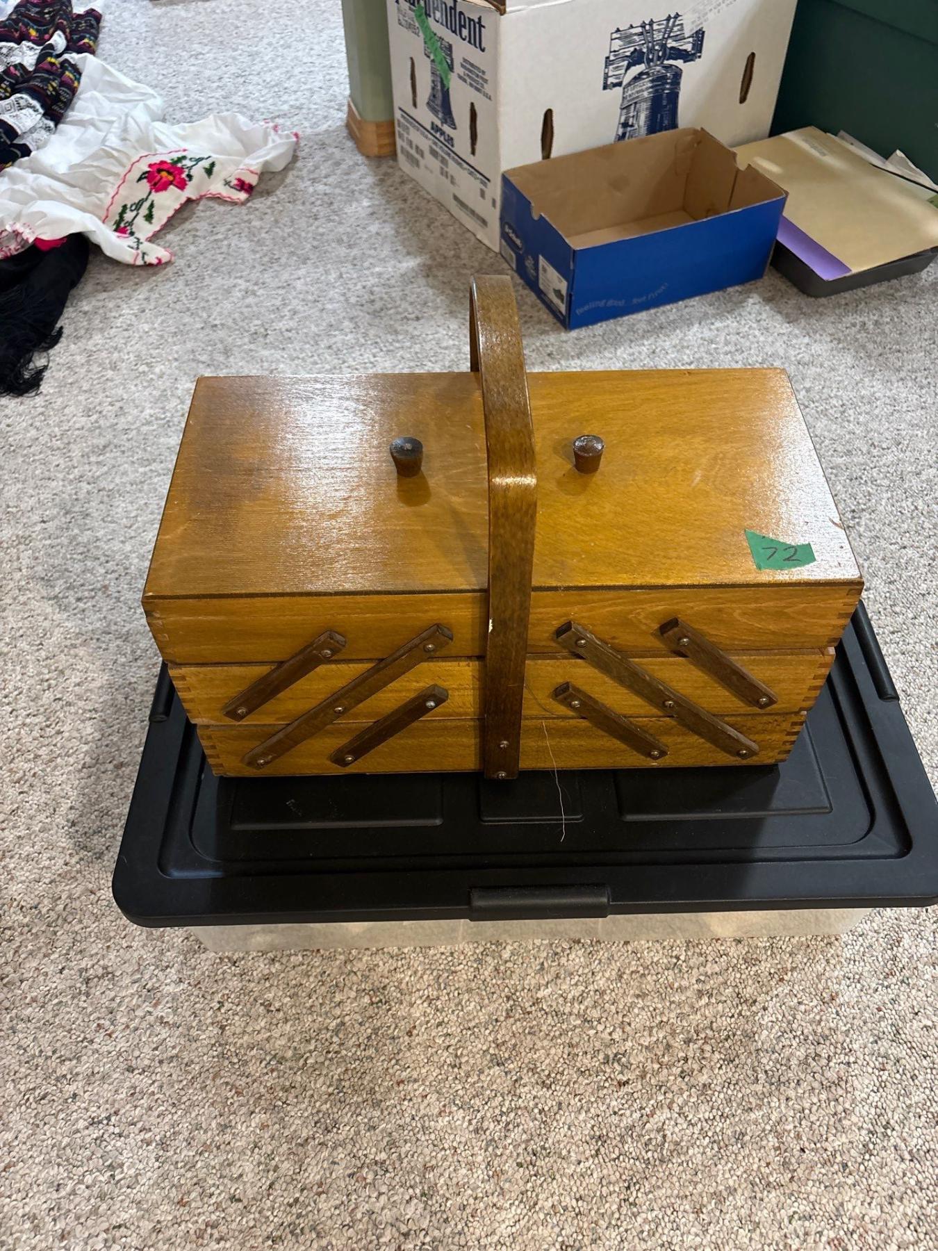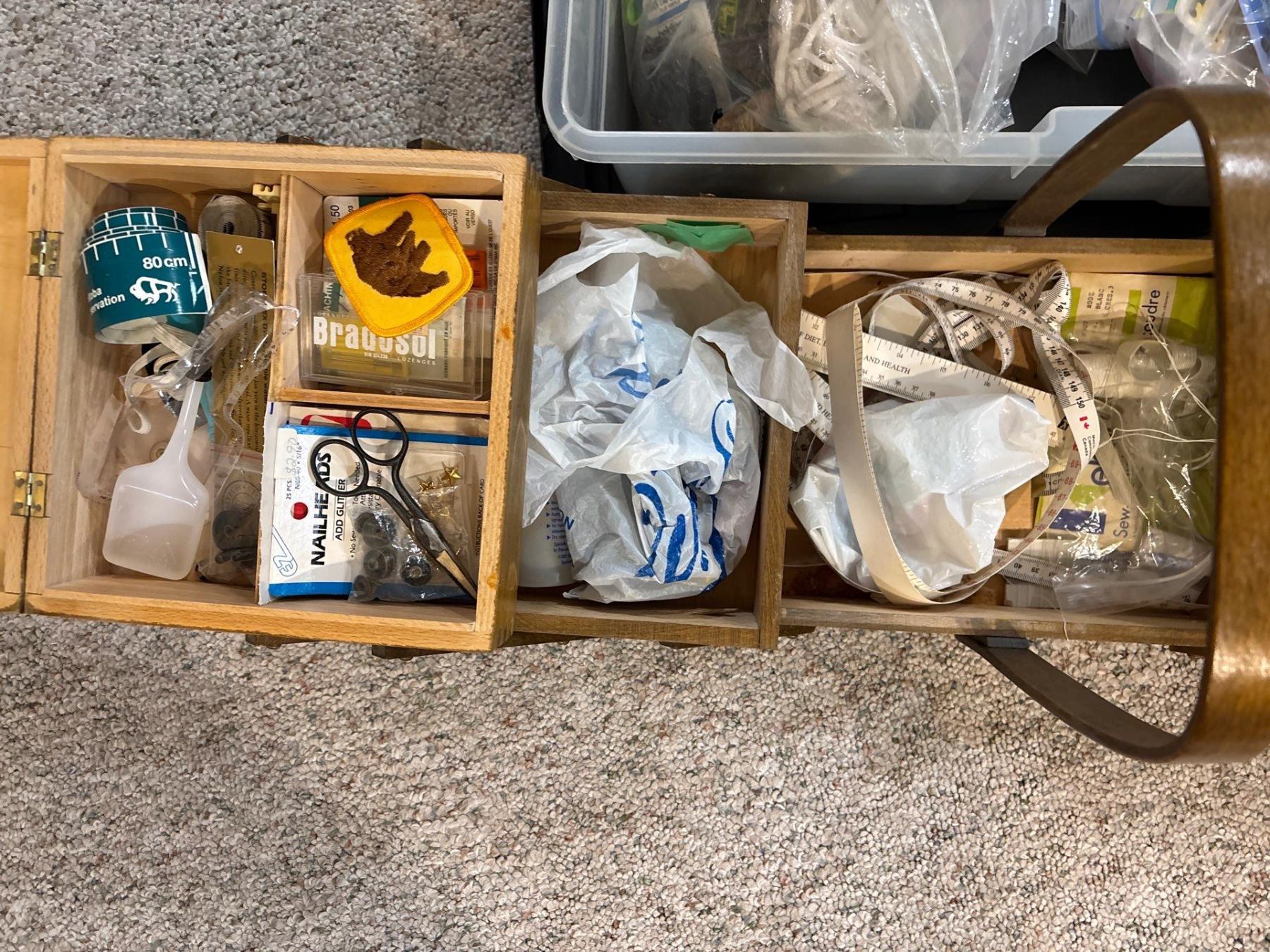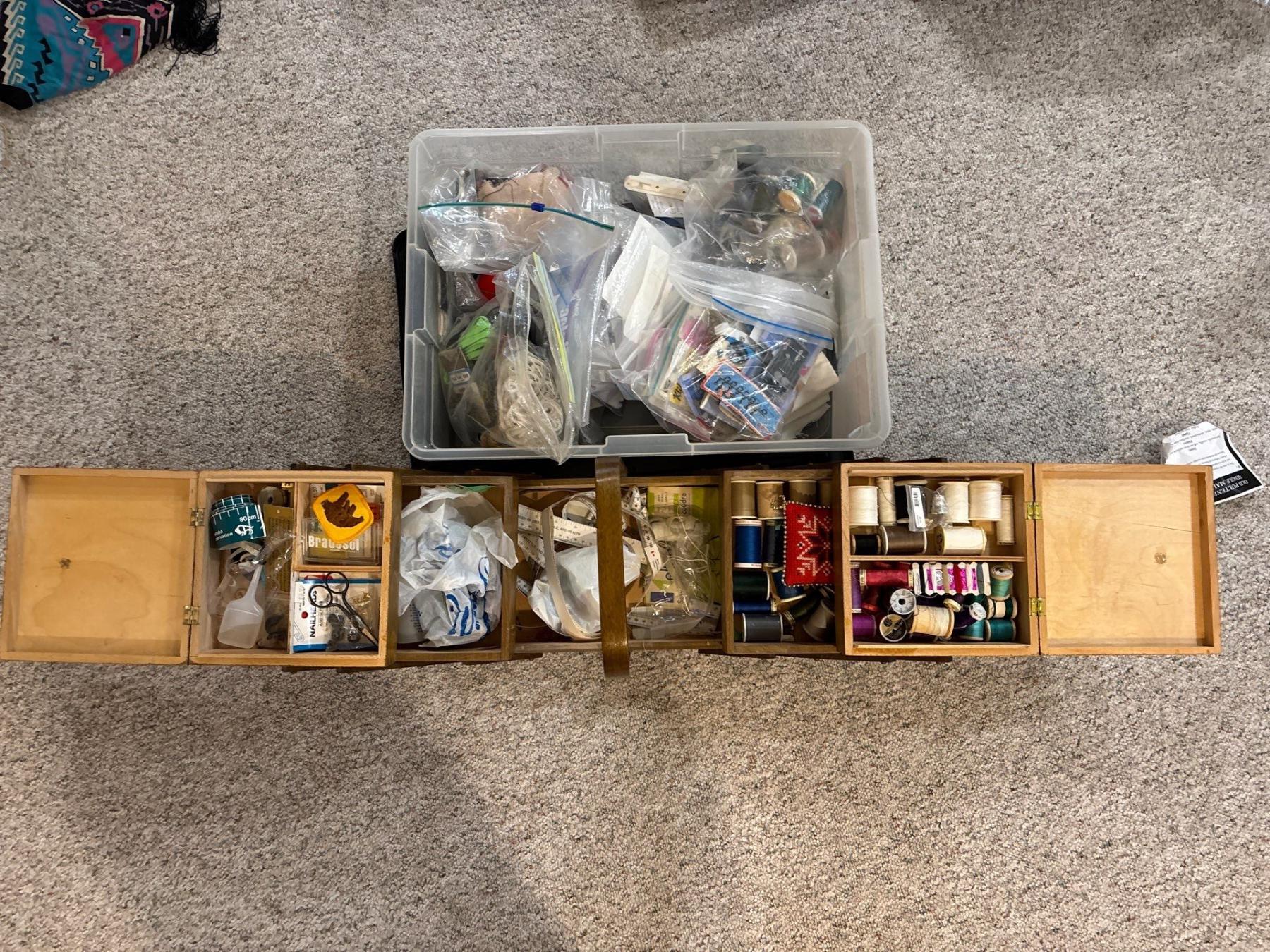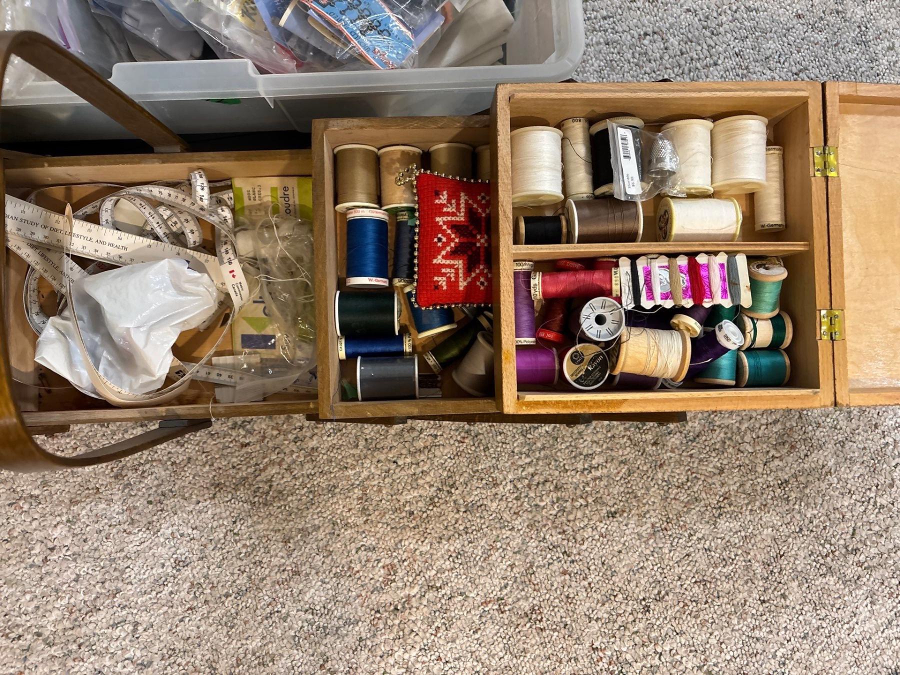 Large Collection Of Sewing Supplies As Well As A Solid Wood Sewing Storage Box . Contains Lots of thread Needles & Other Sewing Items.