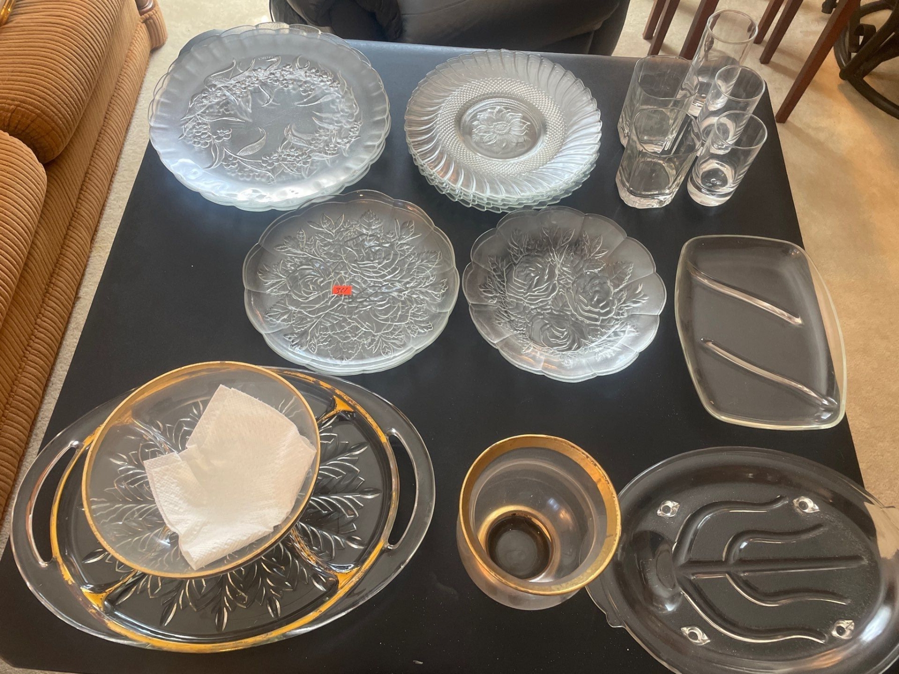 Large Collection of Glassware, Serving Tray and Bowl with Gold Trim, Dishes, High Ball Glasses, Serving Trays and more.
