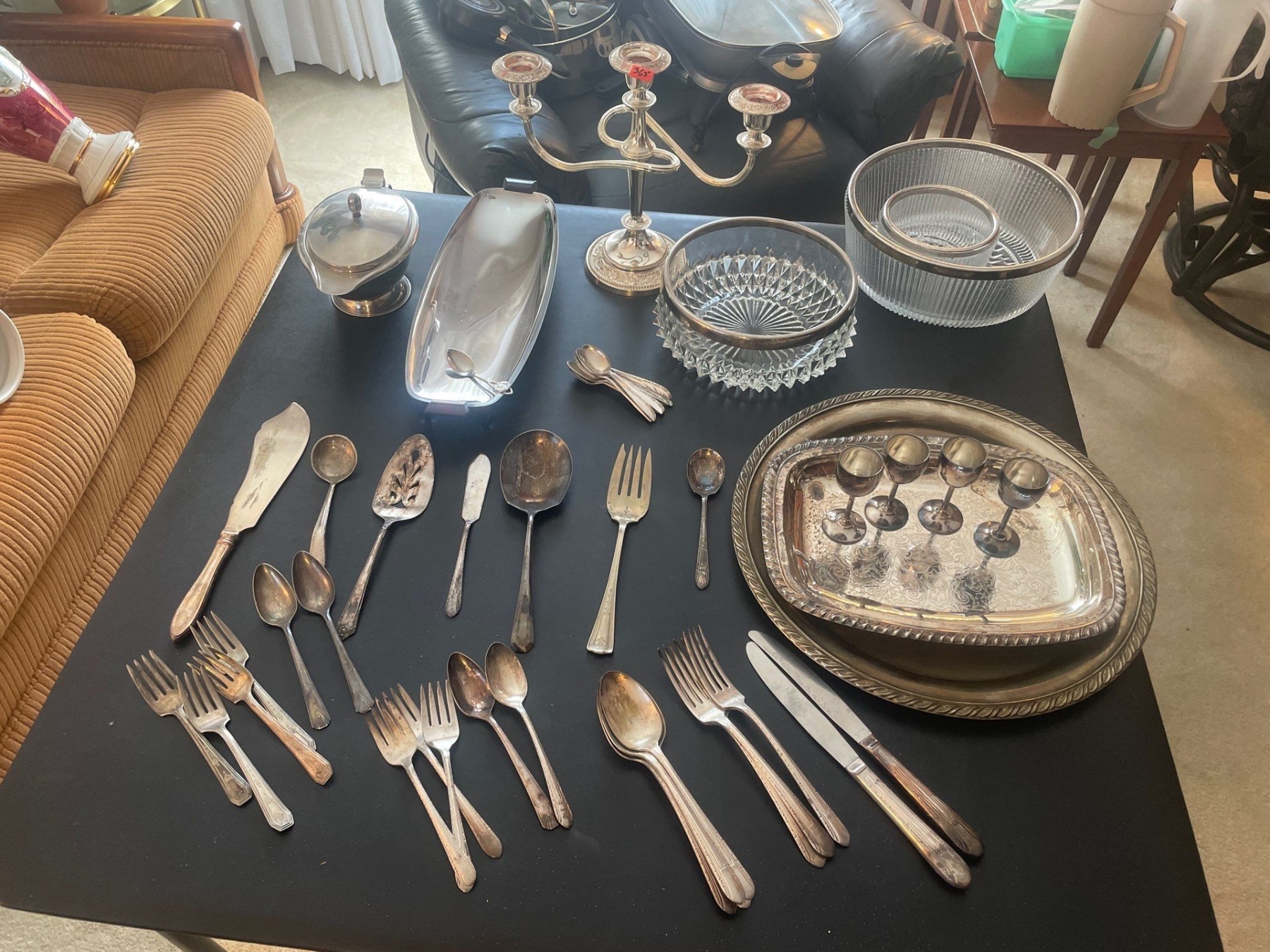 Large Collection of Steel and Silver Plate. Silver Serving Trays, and small Silver Cops, Candelabra, Serving Bowl, Silver Cutlery and more.