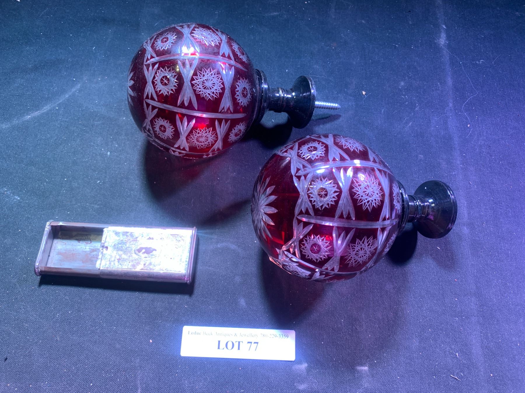 Large Cranberry Colour Crystal Finials & Vintage Sliding Tin
