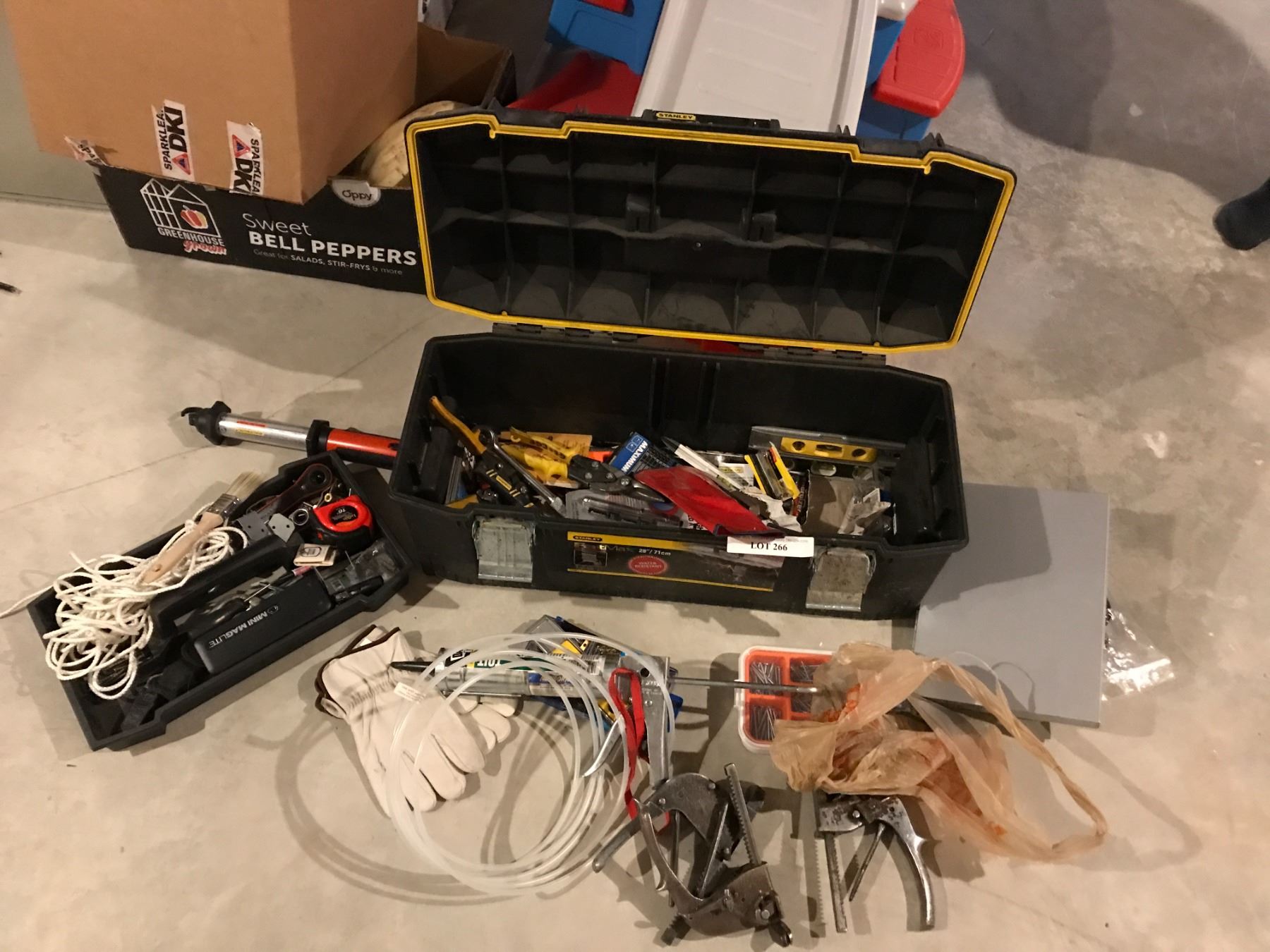 Large Fat Max Toolbox with large assortment of tools including level, wrenches, tape measure, maglite etc