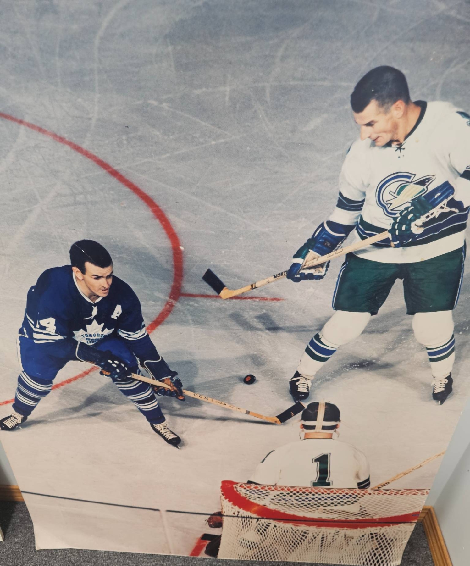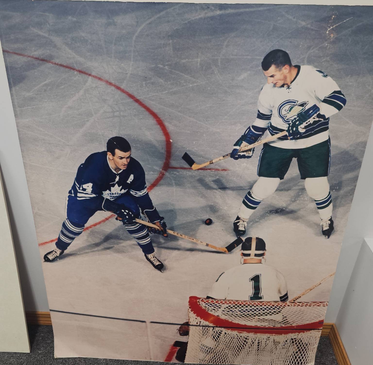 A vibrant, oversized poster print showcasing an exciting ice hockey scene. Measuring 29 x 37 inches, it features players in action on the rink, offering a dynamic snapshot of the sport. Perfect for collectors, sports enthusiasts, or adding character to any game room or man cave.