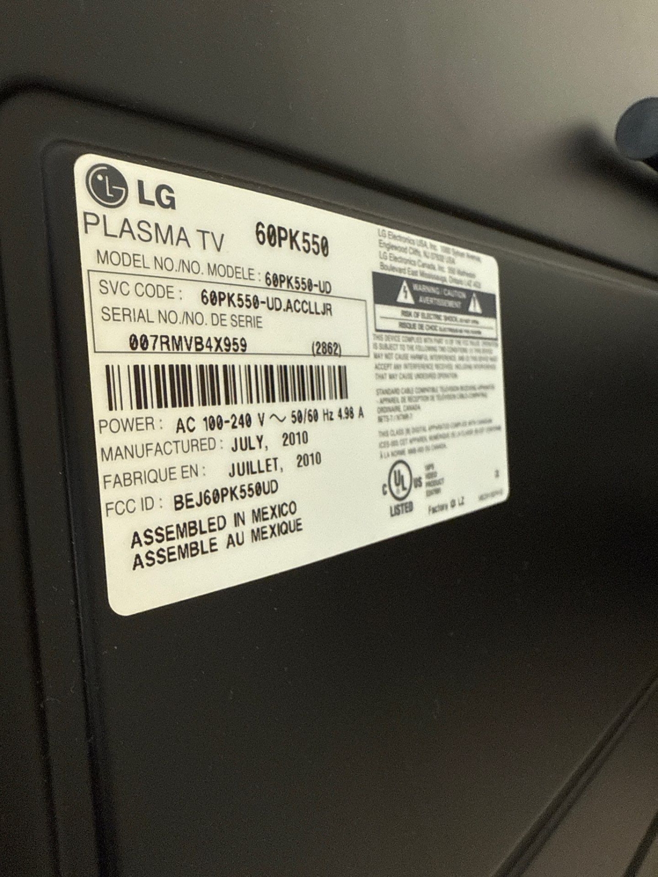 Large LG Plasma Television Model No. 60PK550-UD, 54In Wide