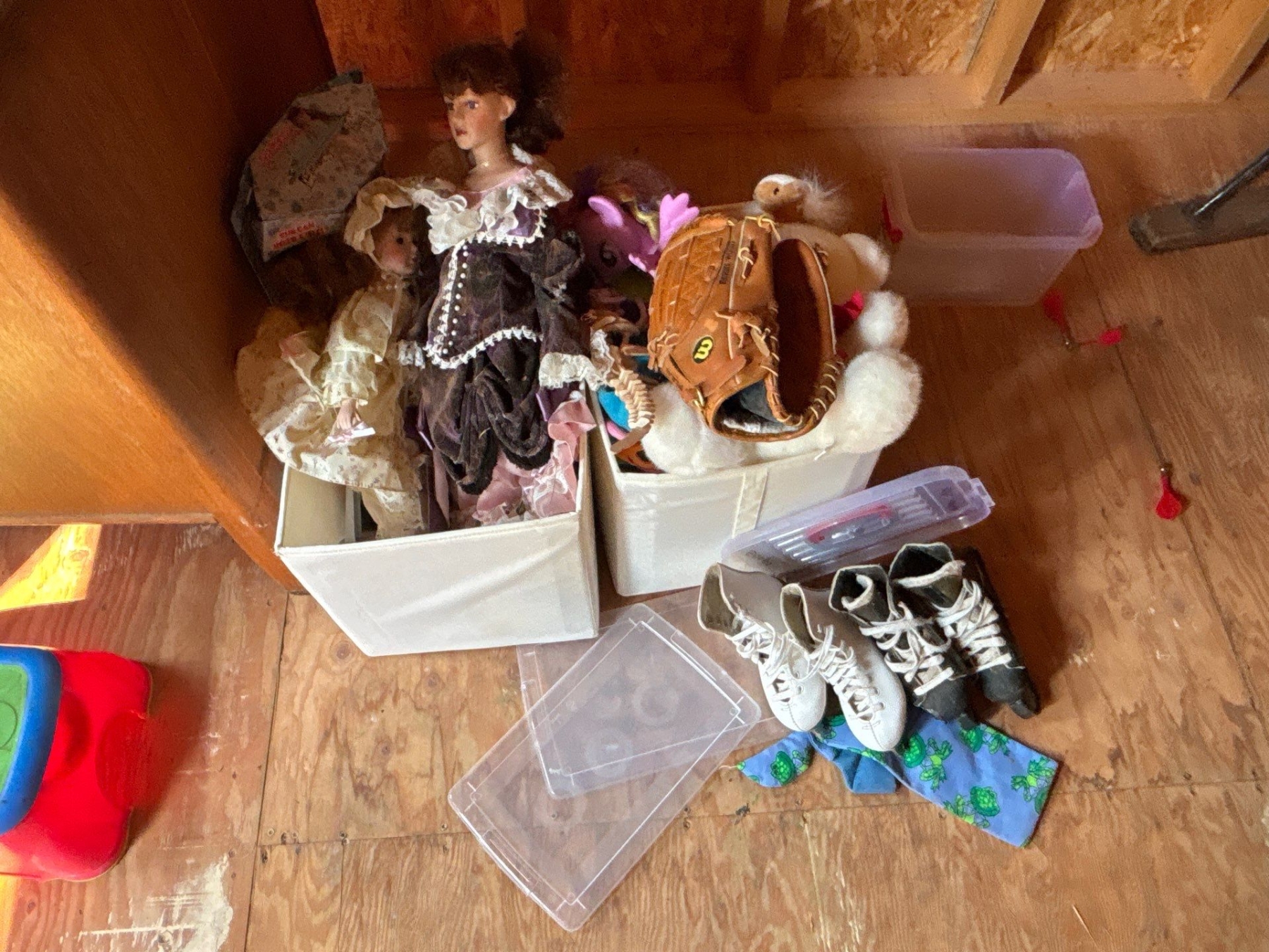 Large Lot Of kids Toys Dolls Skated BaseBall Glove & Learning games Like An Abacus.