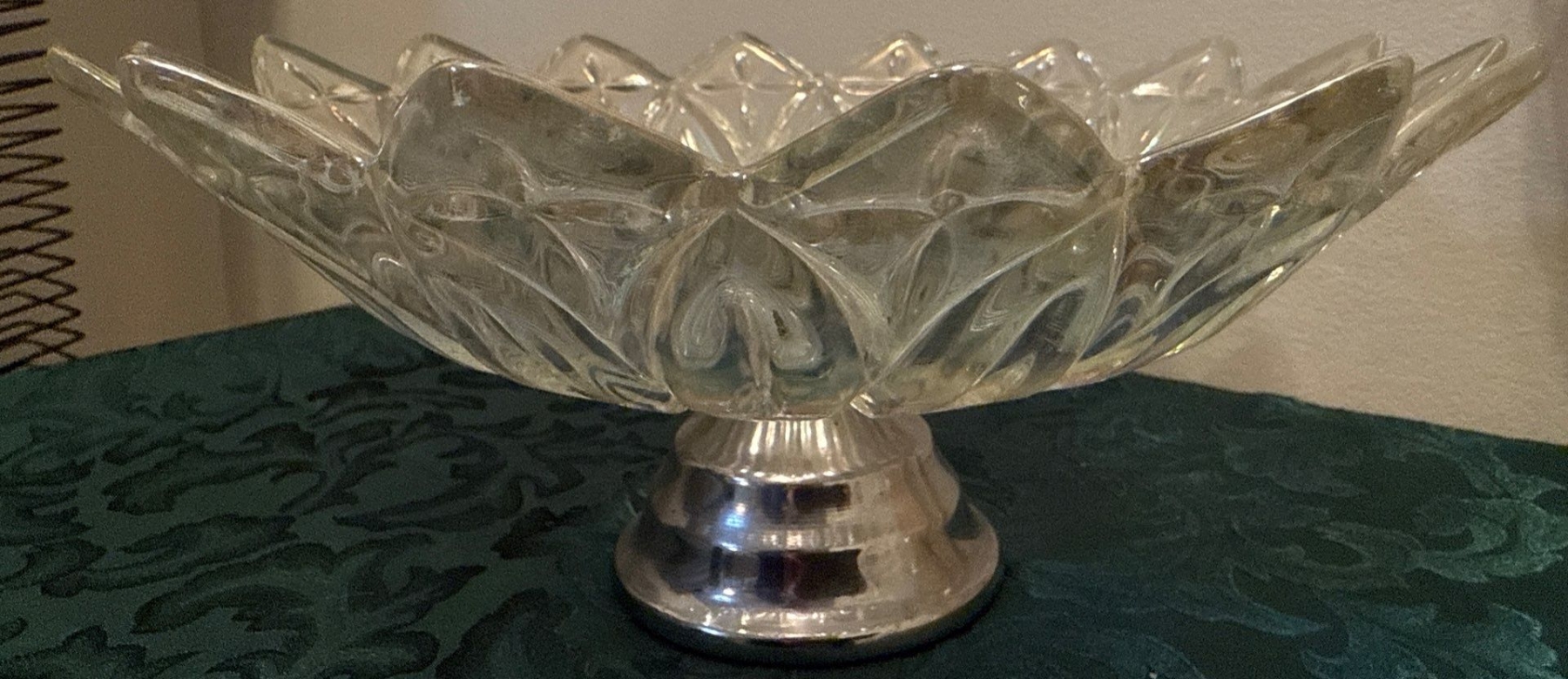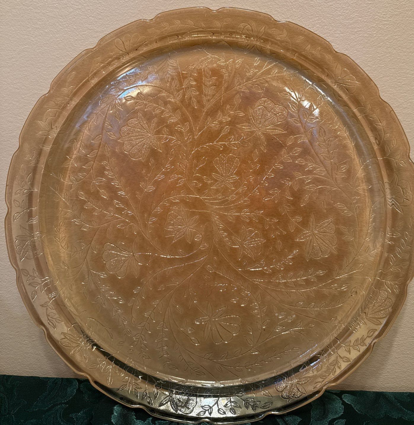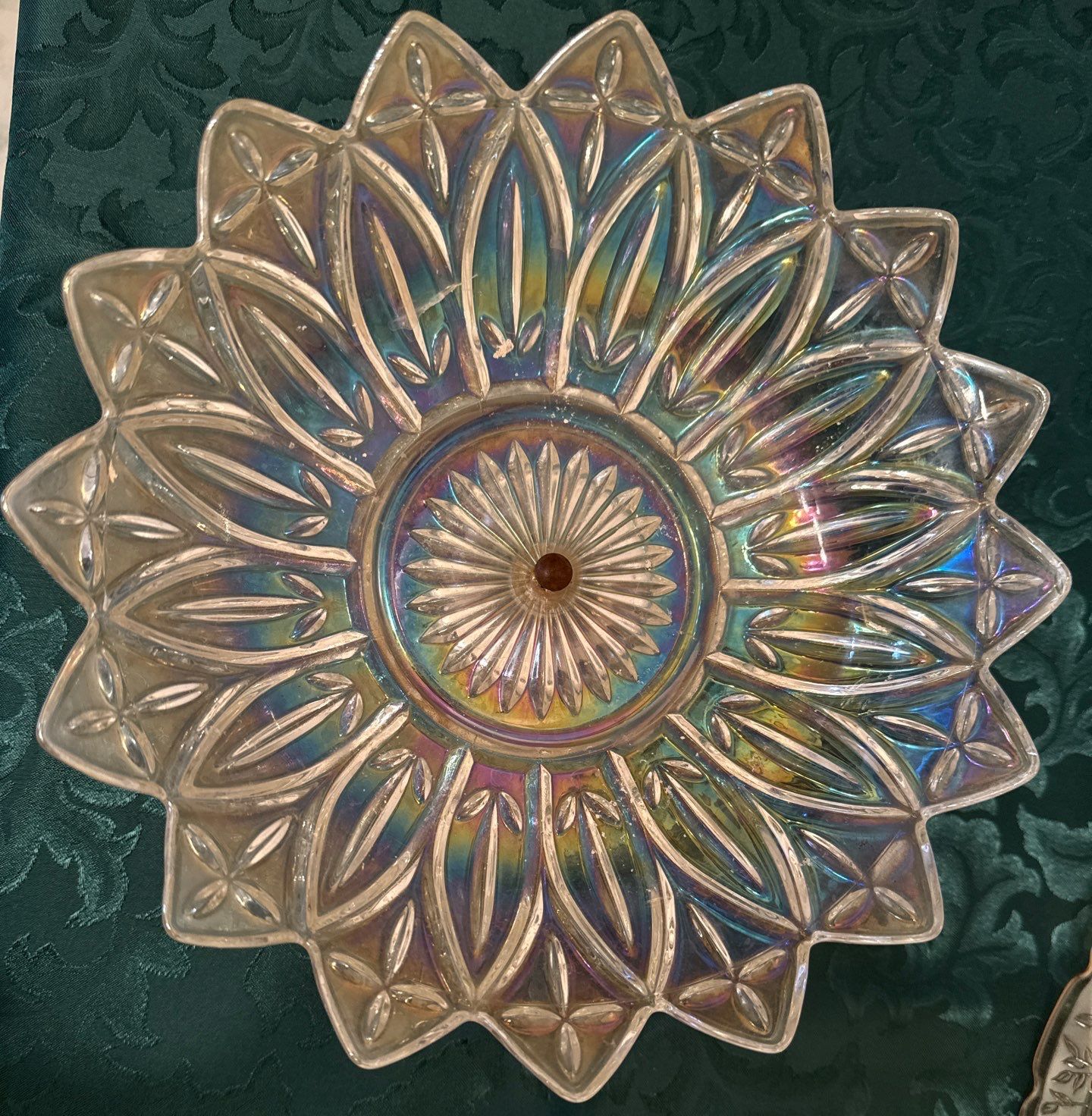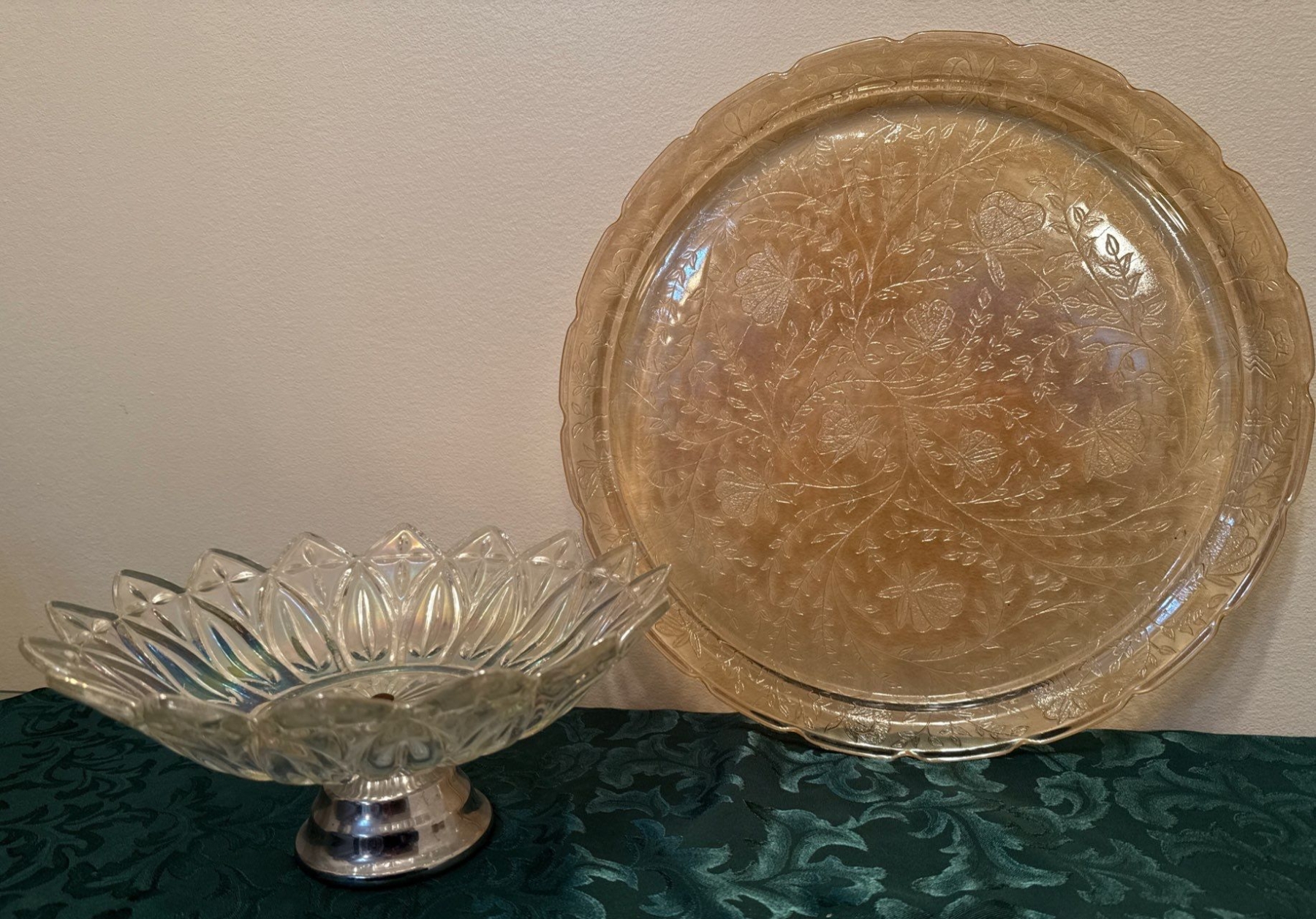 Large Louisa Marigold Carnival Glass Plate & Pedal Bowl w/Metal Stand Fenton Glass Co.