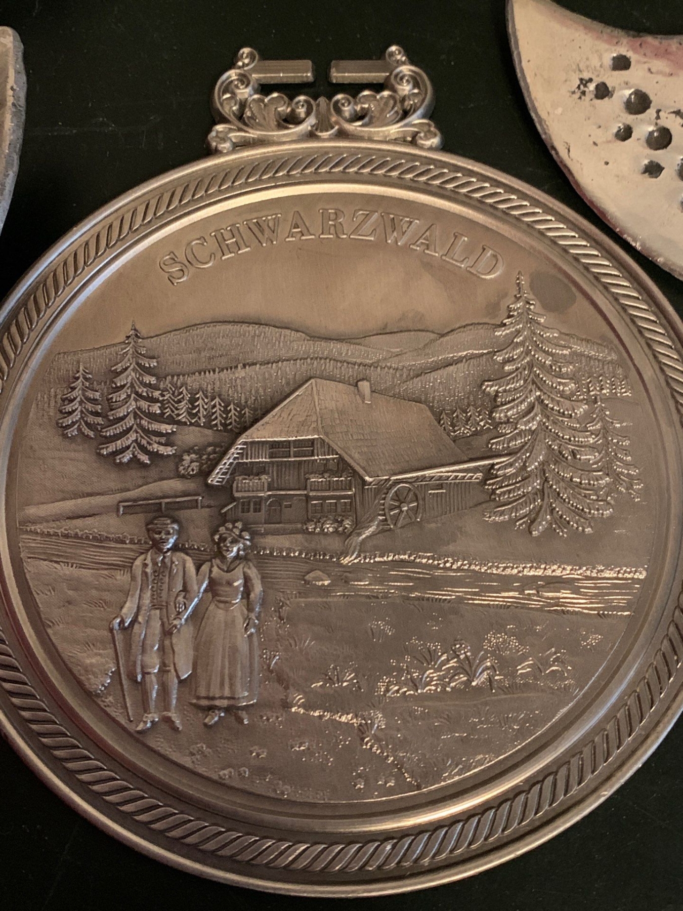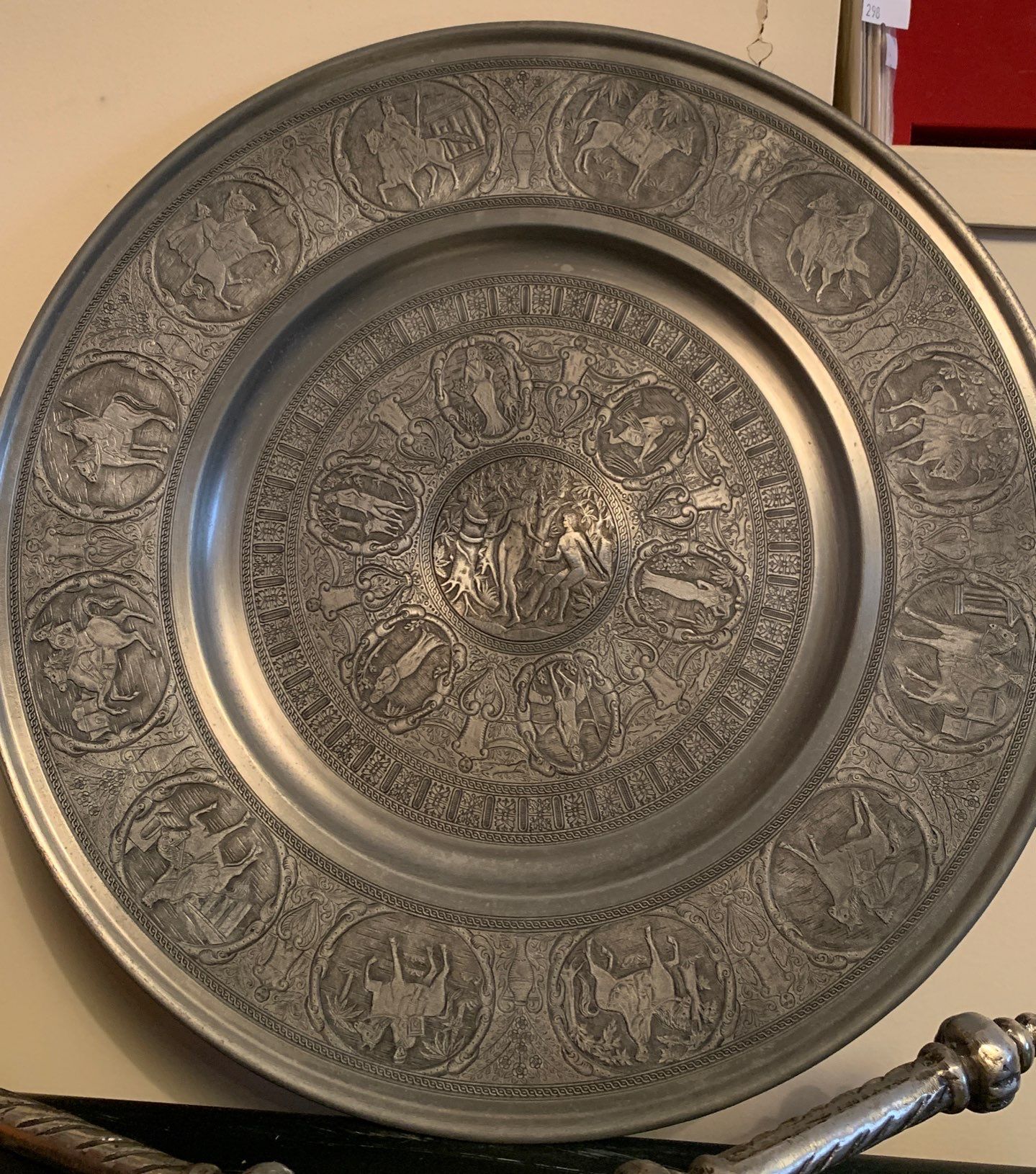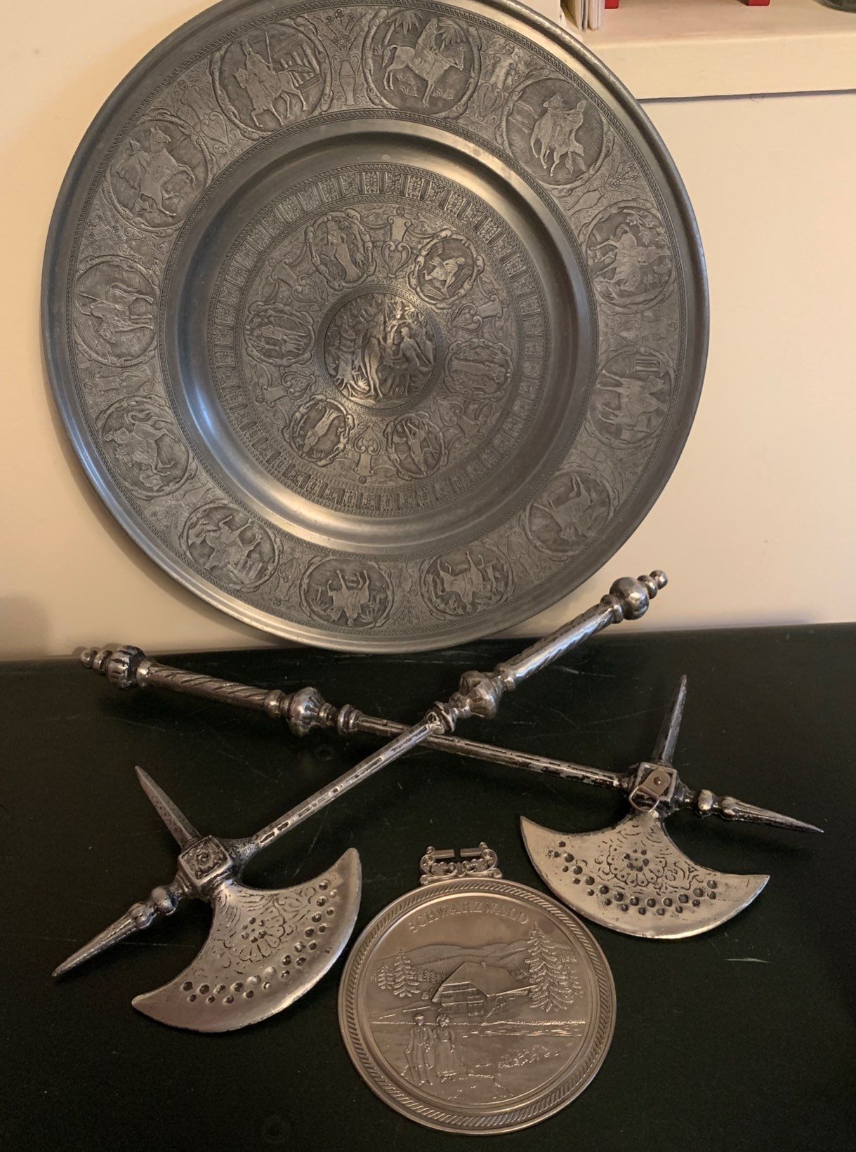 Large Pewter Adam & Eve Decorative Plate w/ Viking Weaponry & More