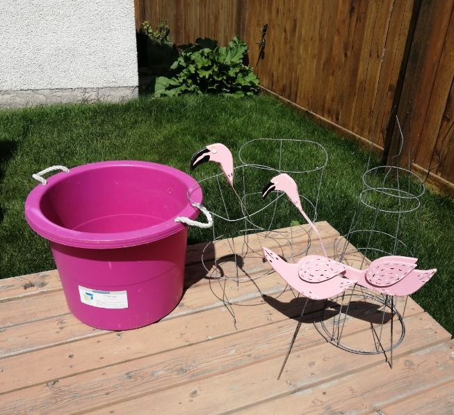 Large Pink Bucket, 4 x Tomato Frames, and 2 x Flamingo Lawn Ornaments