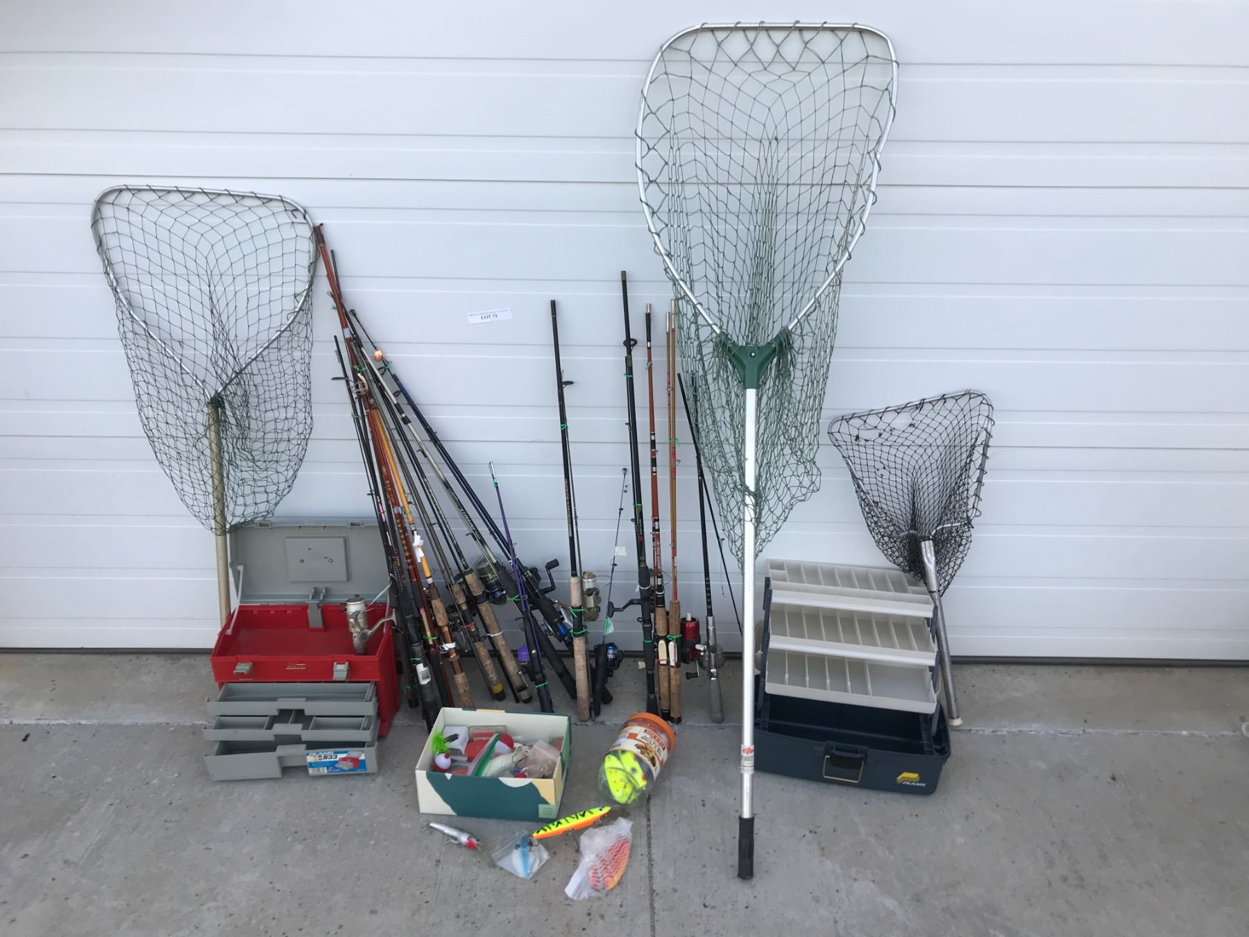Large Selection of Fishing Rods incl Total Tackle, True Temper, Walleye Special, 3 Fishing Nets, 2 Tackle Boxes & assorted Bait
