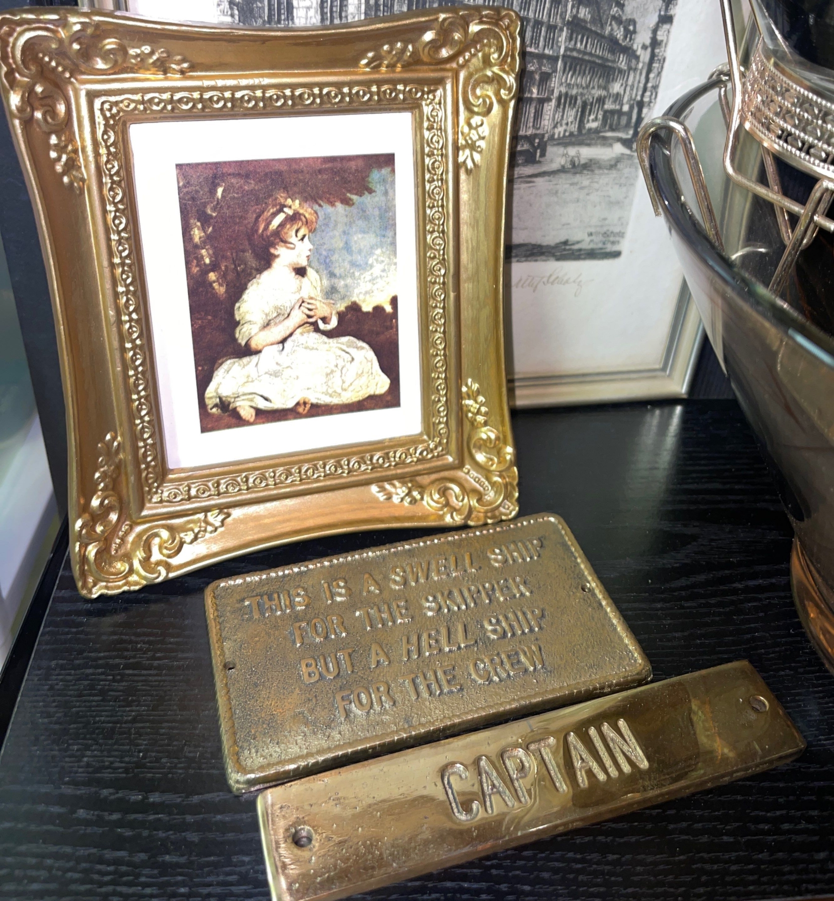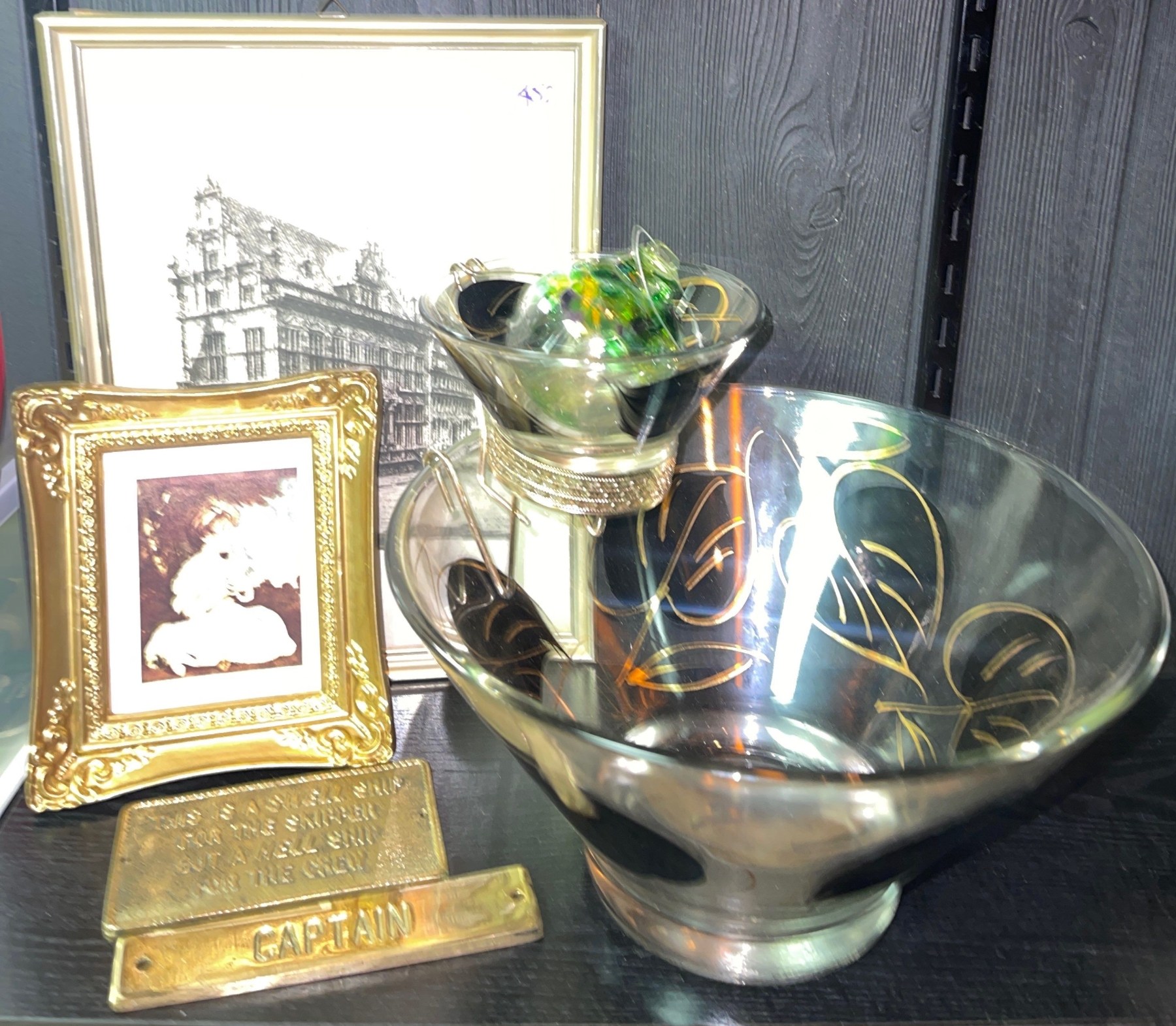 Large Serving Bowl w/ Brass Boat Plaques & Decor