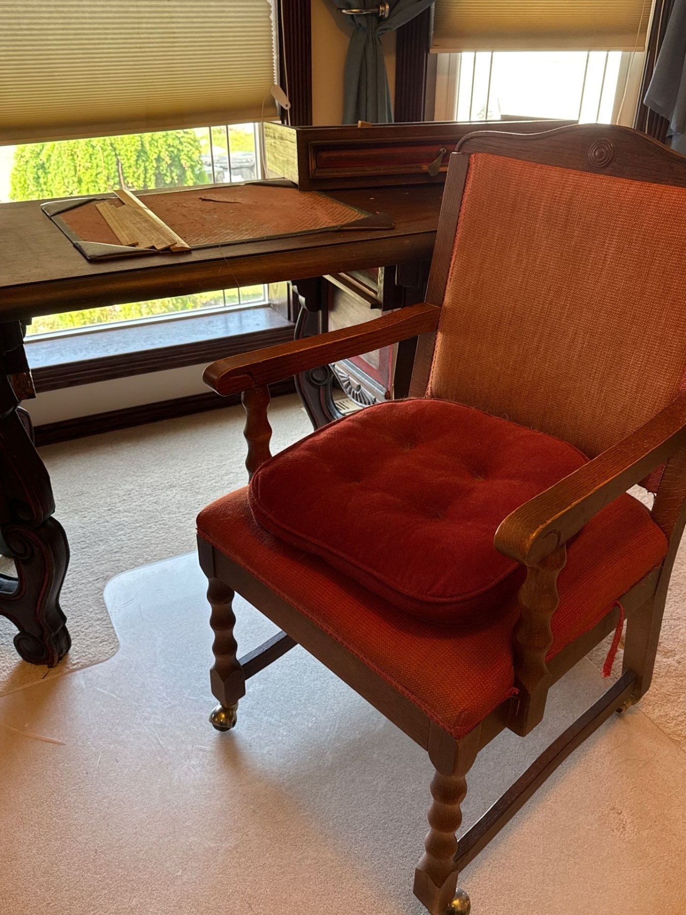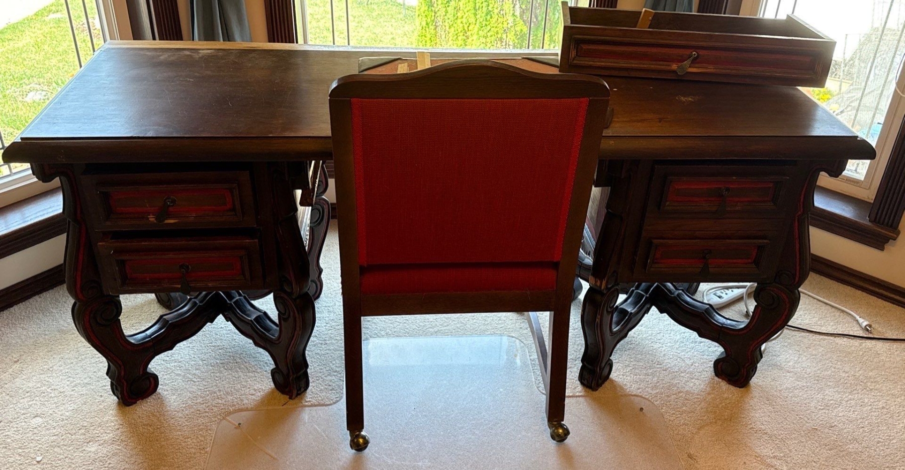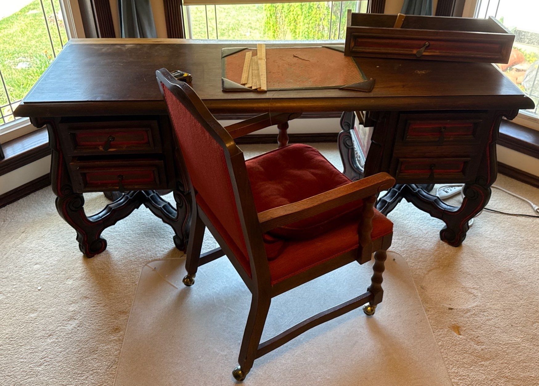 Large Solid Antique Wooden Desk and Chair, Slight Damage w/ Middle Drawer - 71W, 23D, 31T