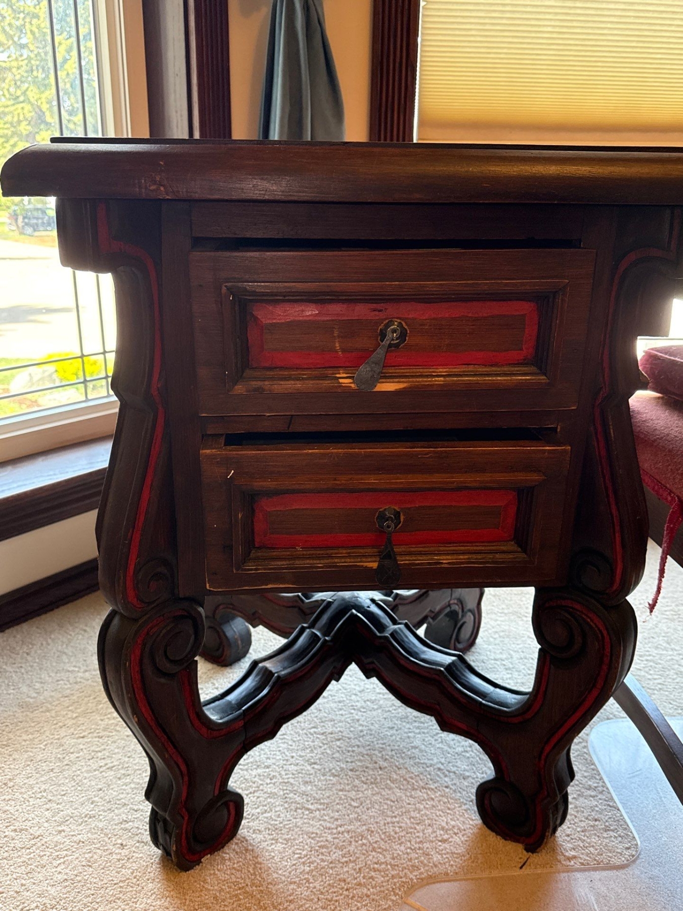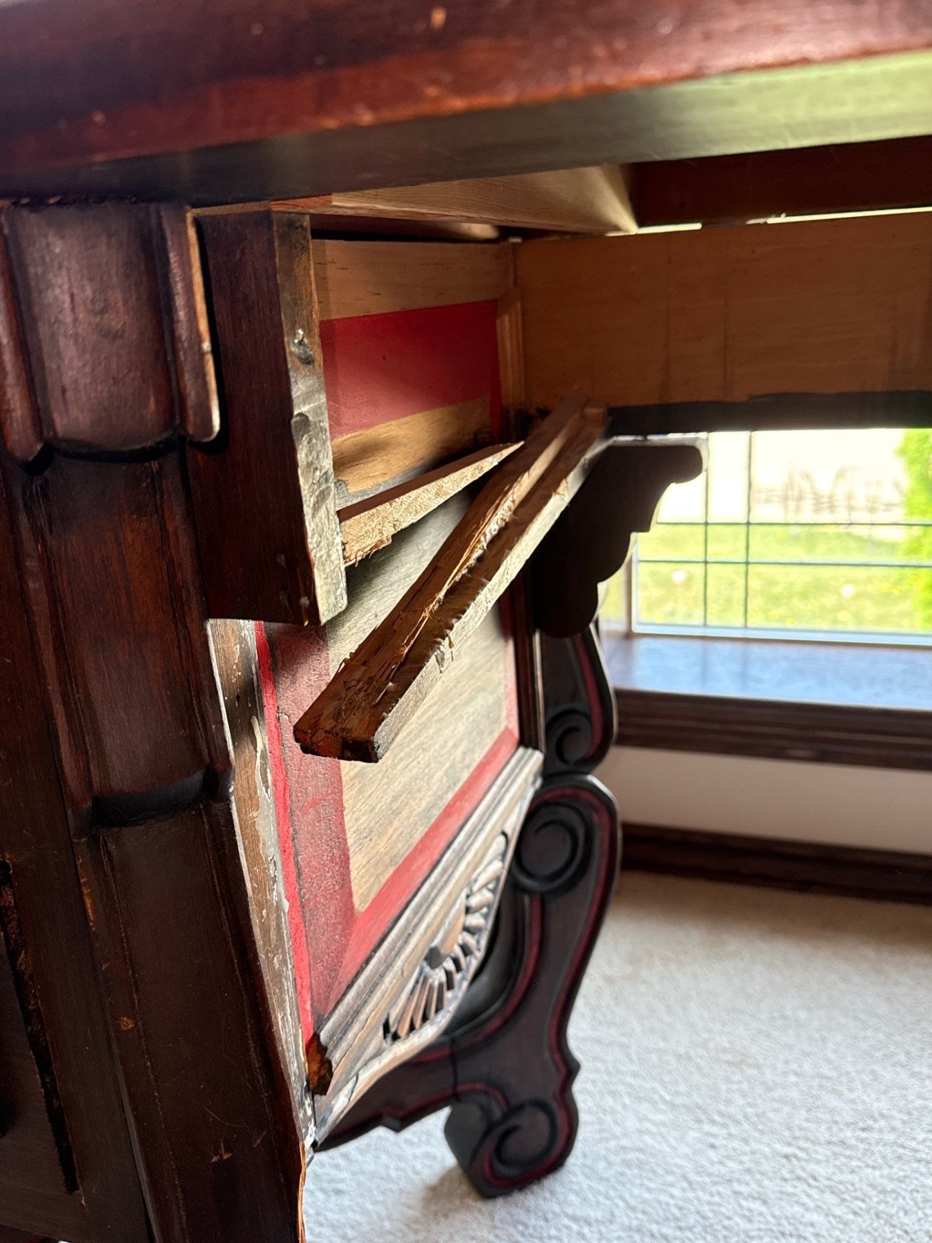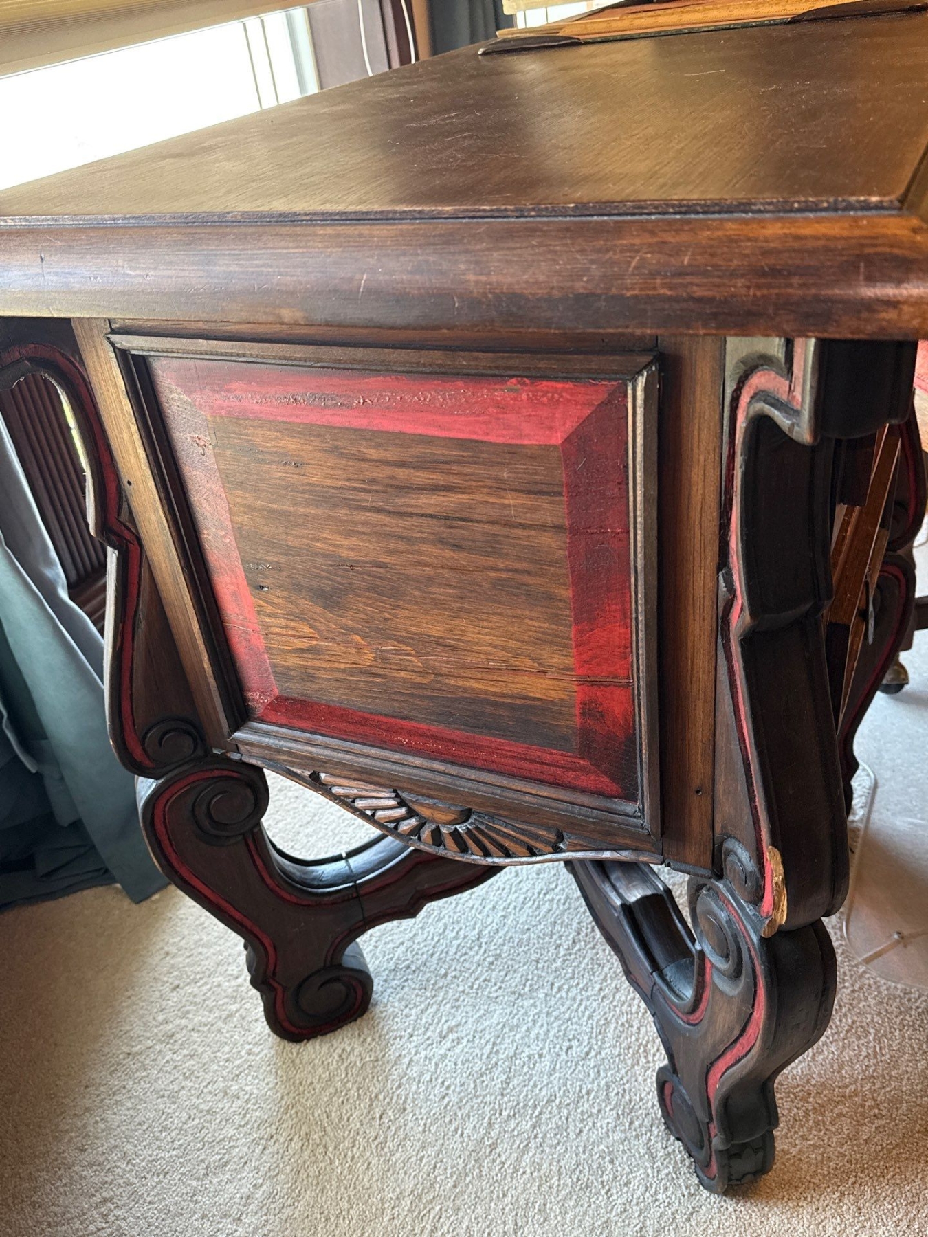 Large Solid Antique Wooden Desk and Chair, Slight Damage w/ Middle Drawer - 71W, 23D, 31T