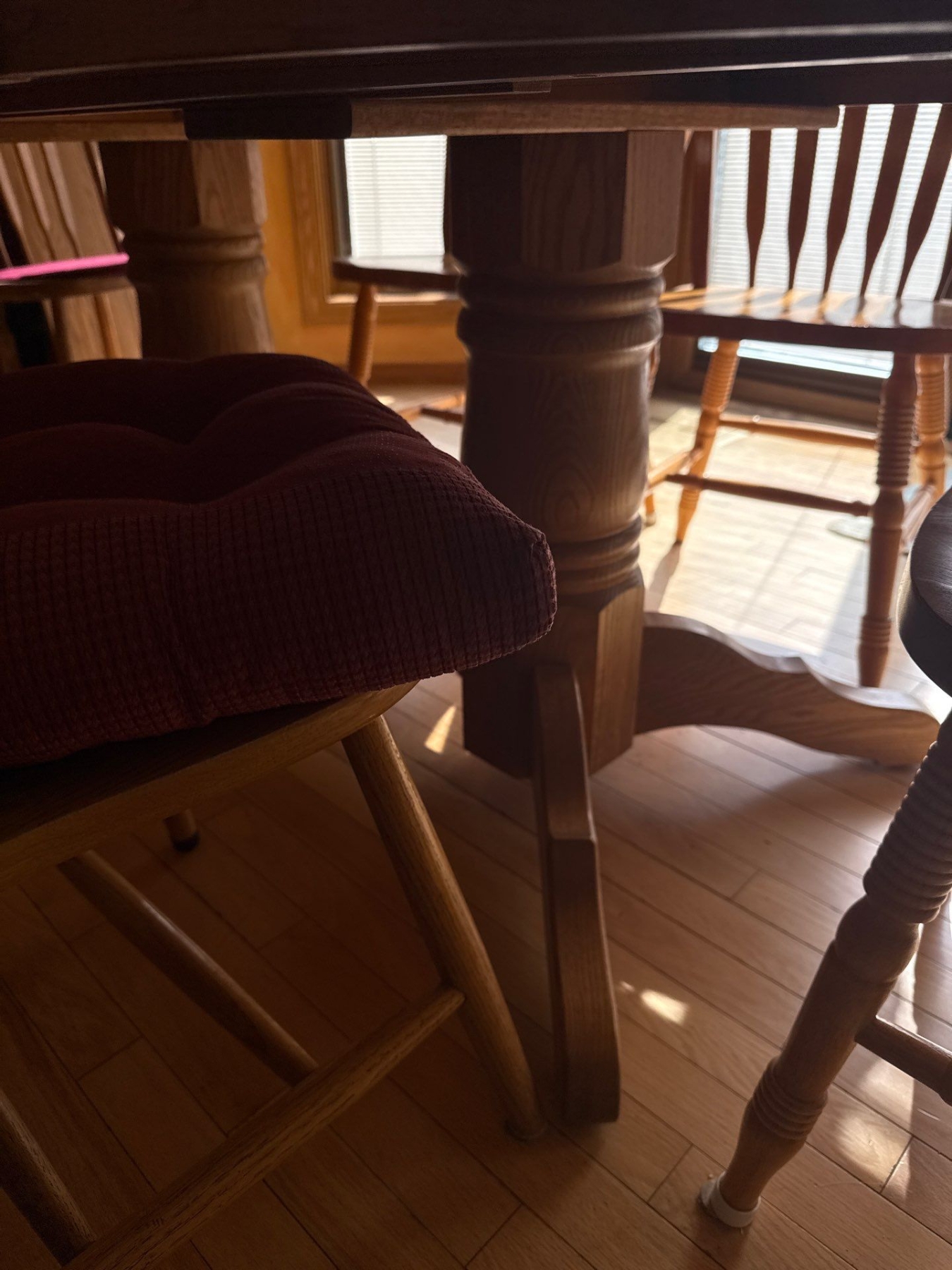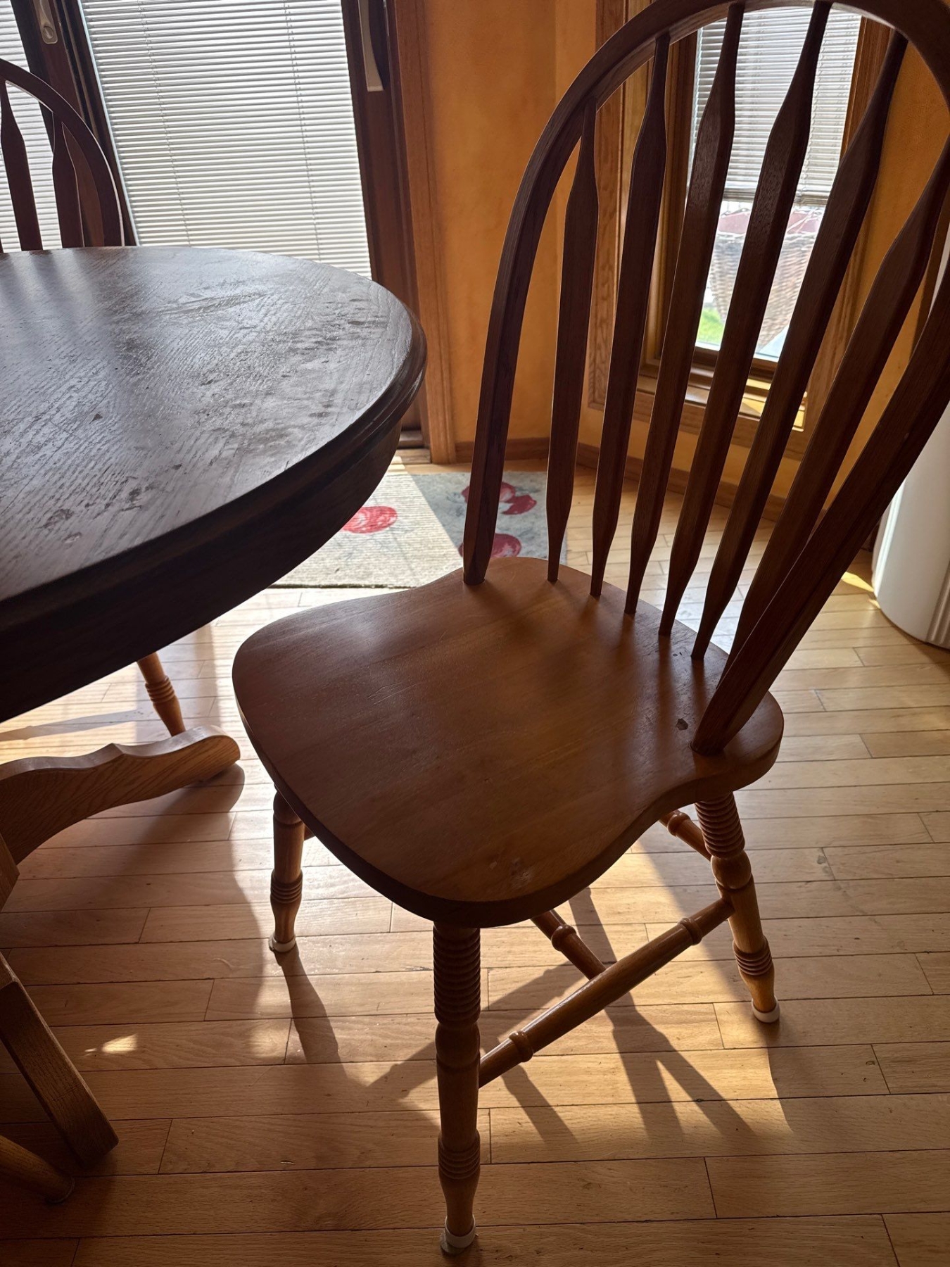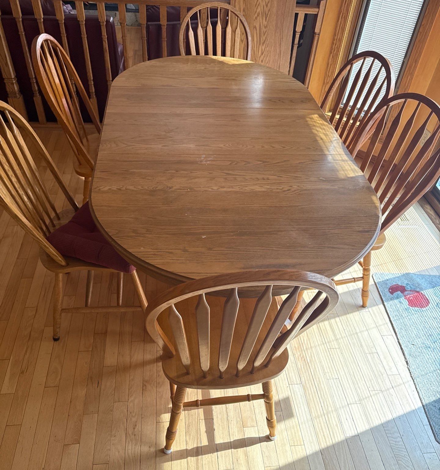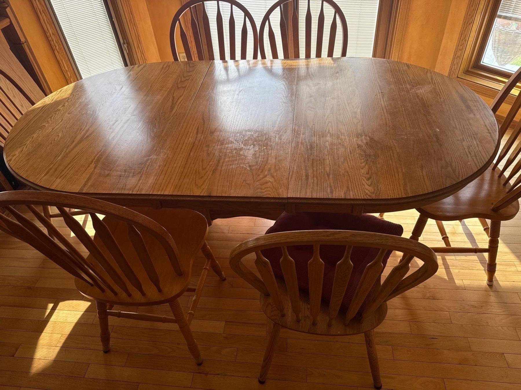 Large Solid Wood Kitchen Table w/ 6 Chairs & Leaf - Table is 77In Long and 29 In Tall (W/O Leaf)