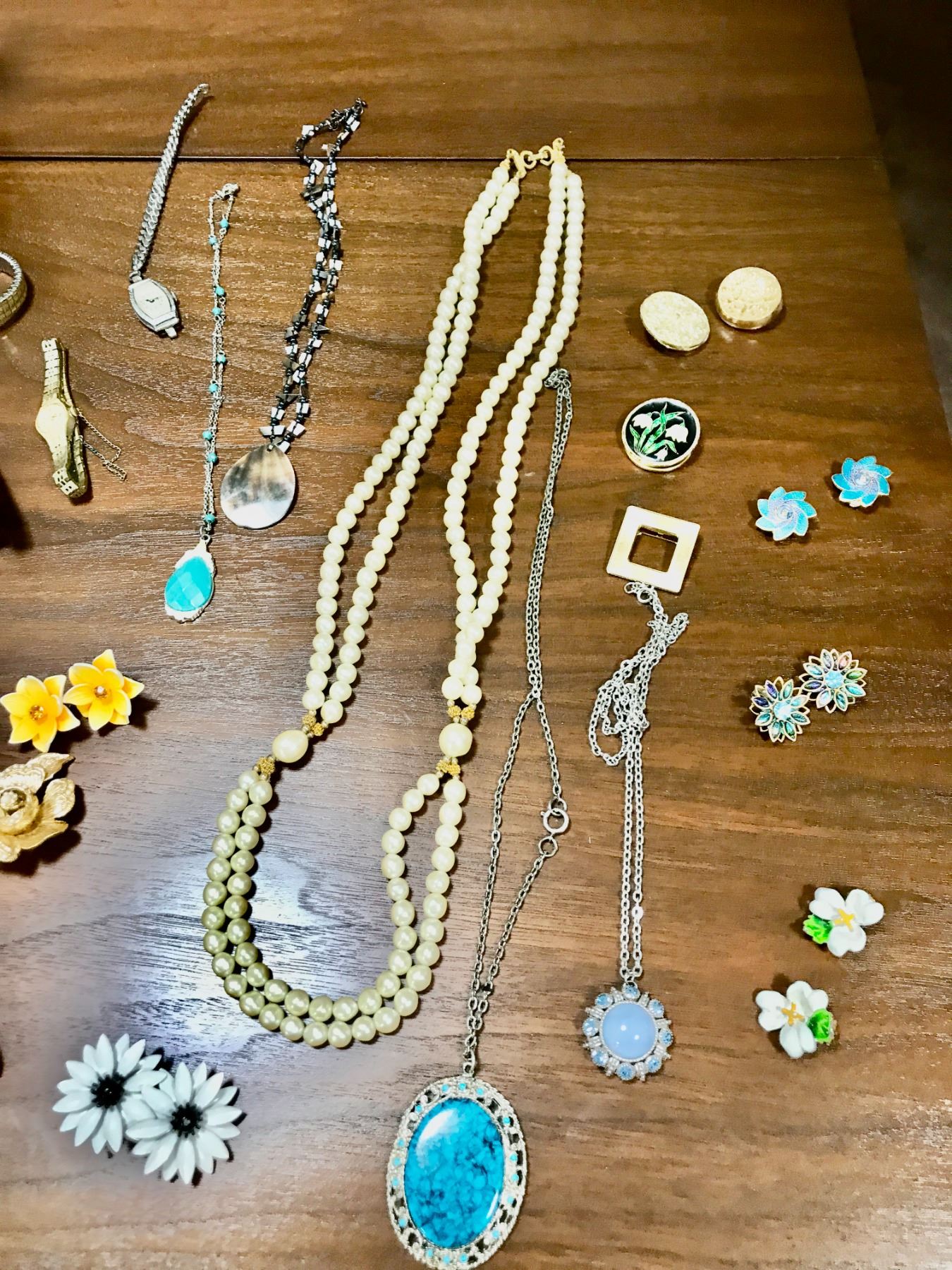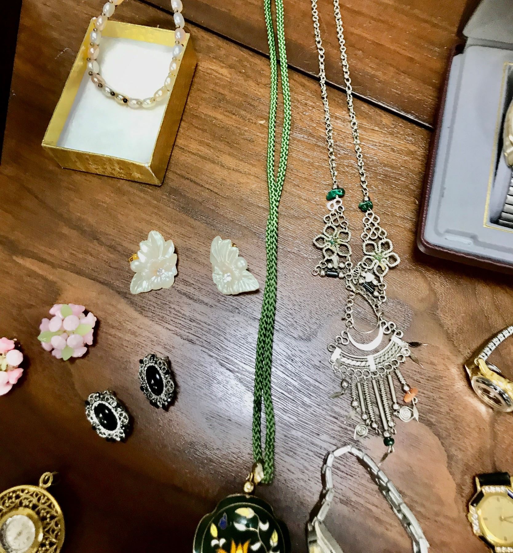 Large Variety of Watches incl Cardinal, asst Cuff Links, Faux Pearl Necklaces, Vintage Earrings, Nec