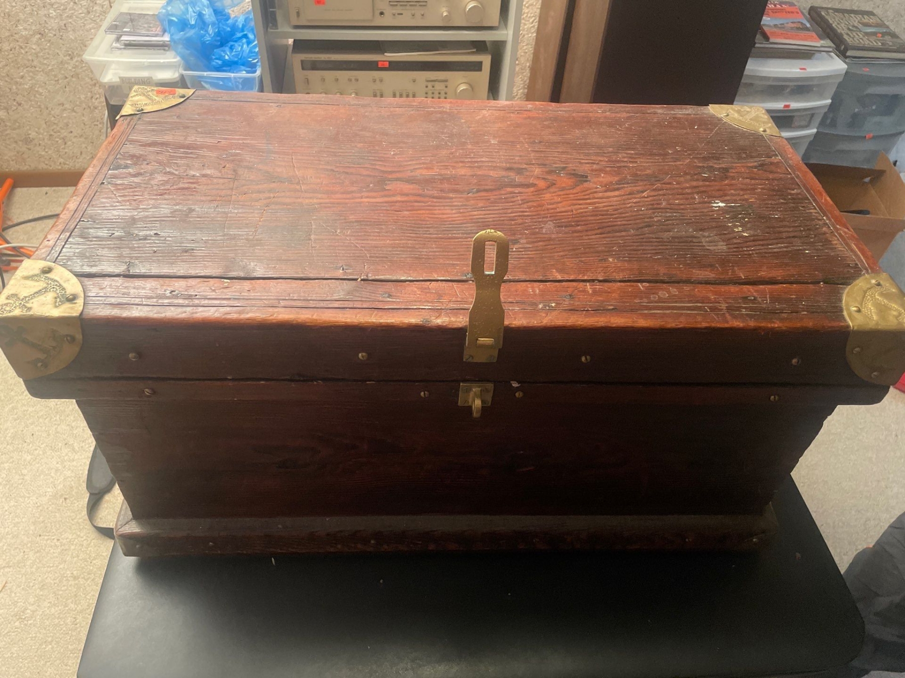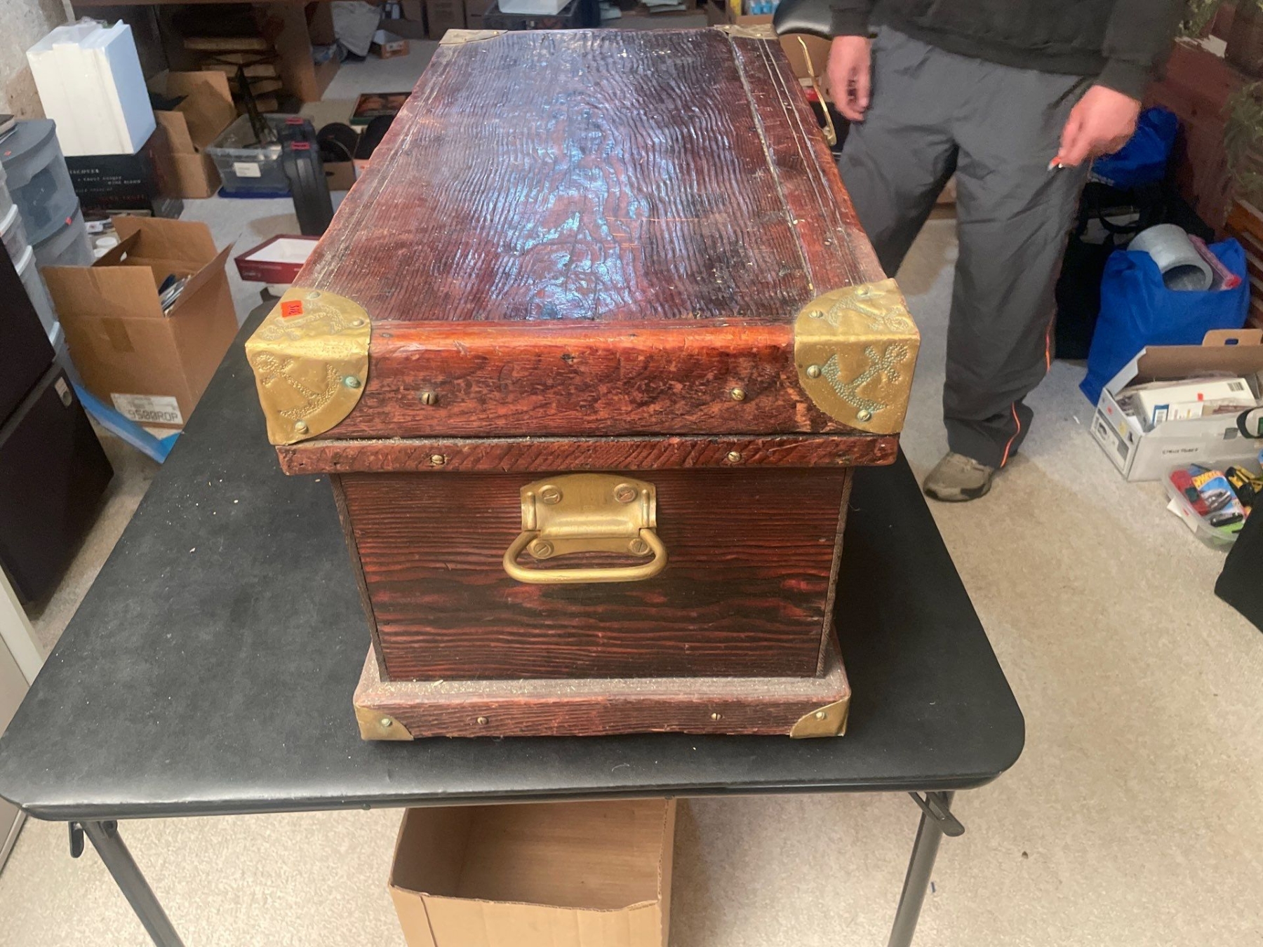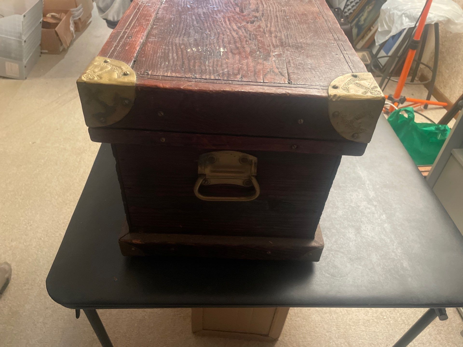 Large Wooden Trunk with Brass Fixtures, 29 inches wide, 15.5 inches High, 15 inched Depth.