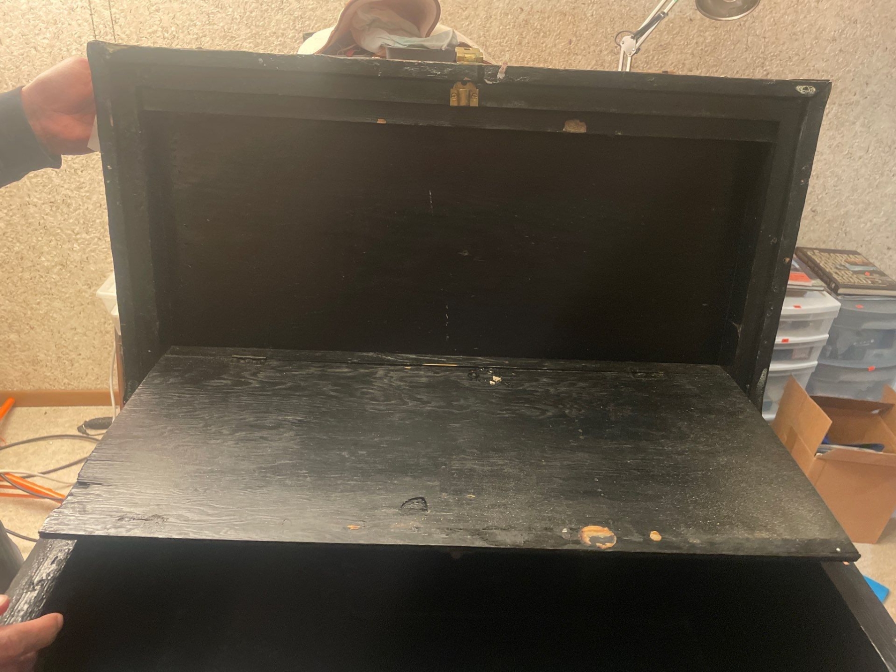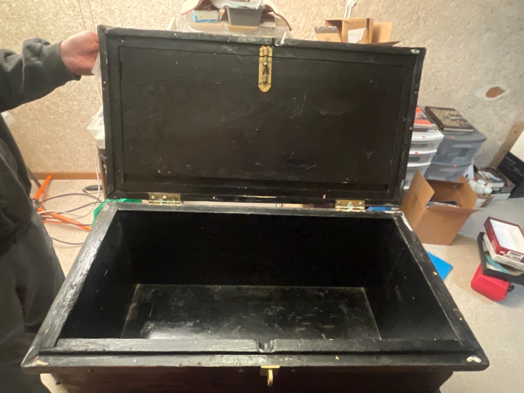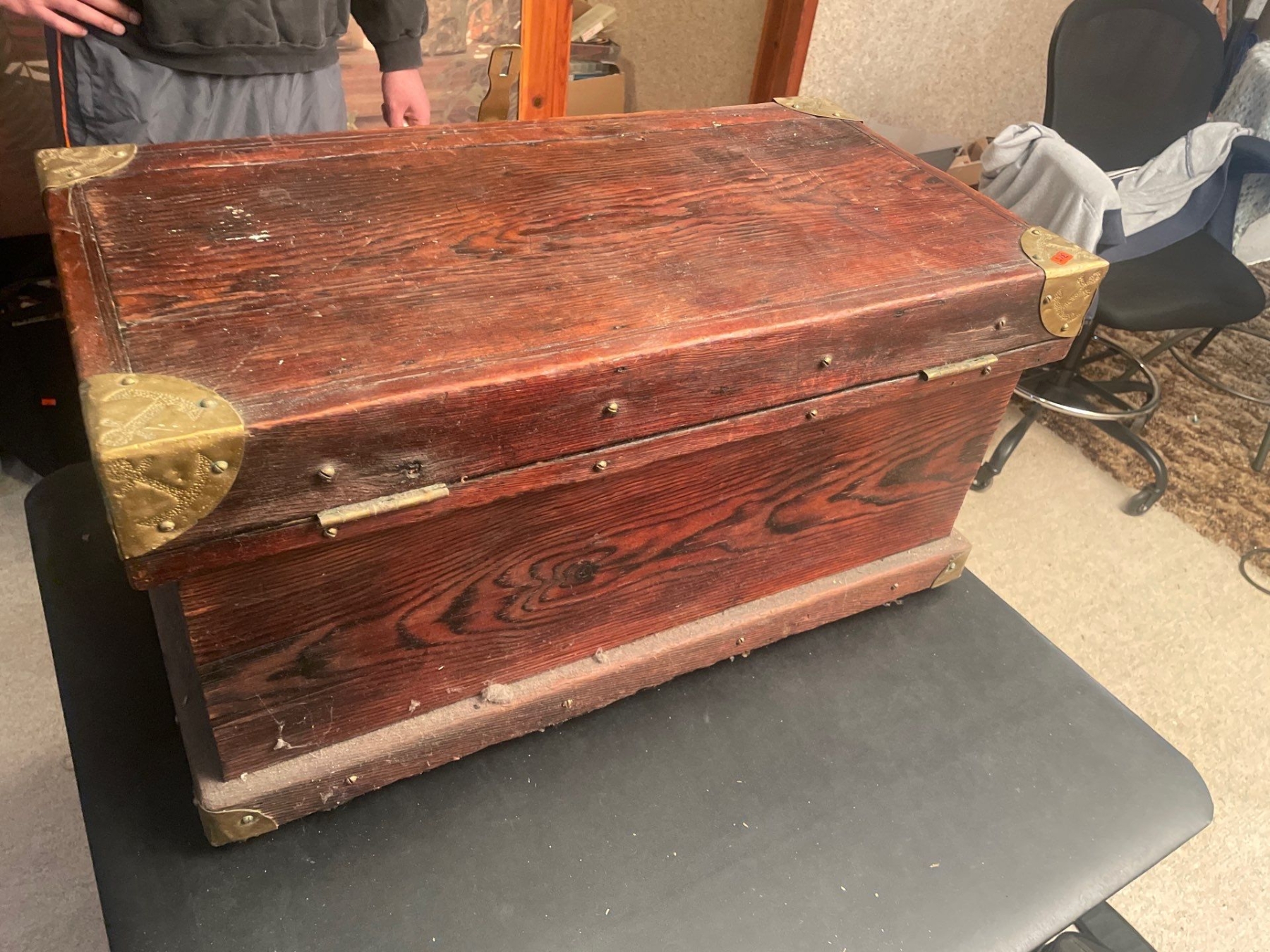 Large Wooden Trunk with Brass Fixtures, 29 inches wide, 15.5 inches High, 15 inched Depth.