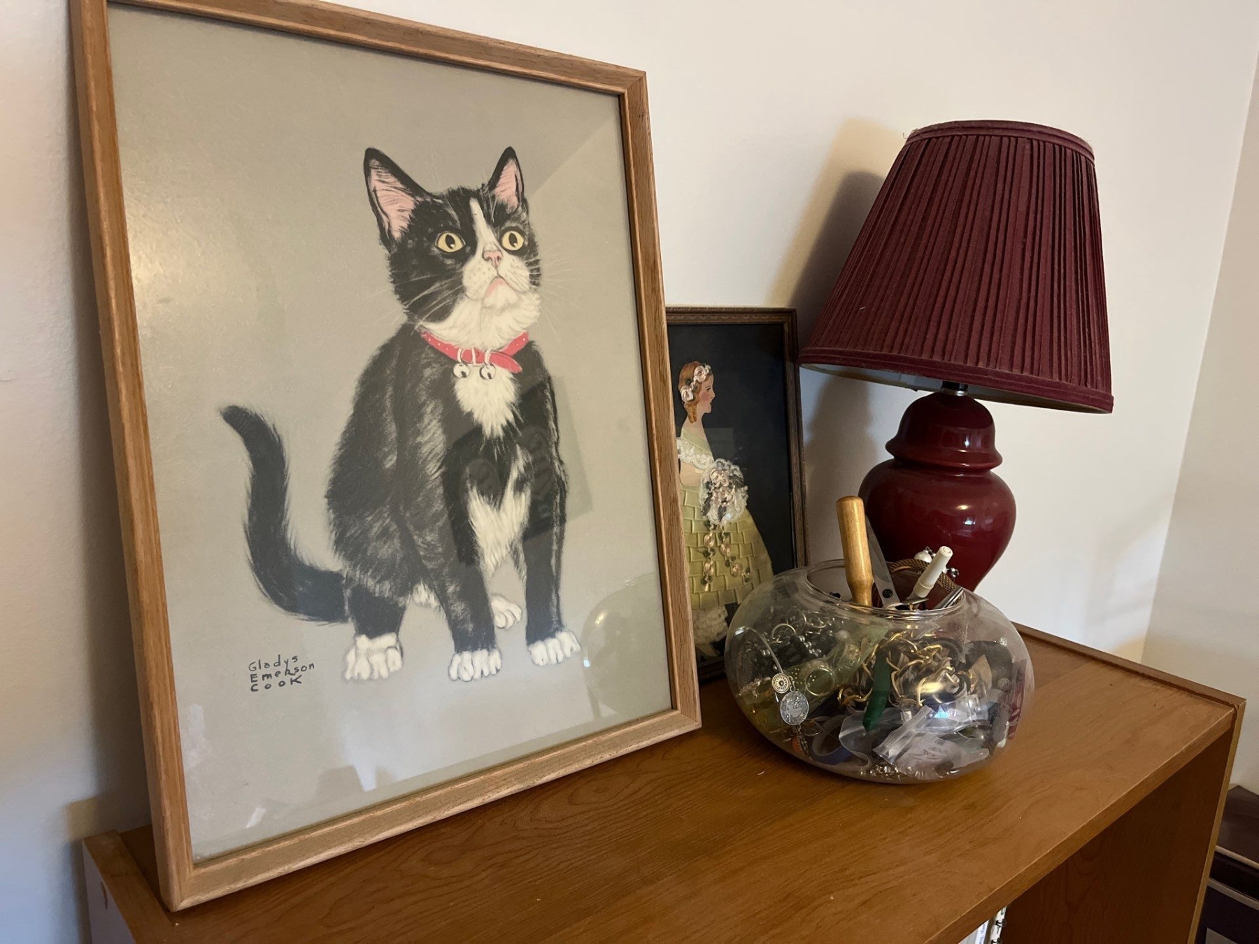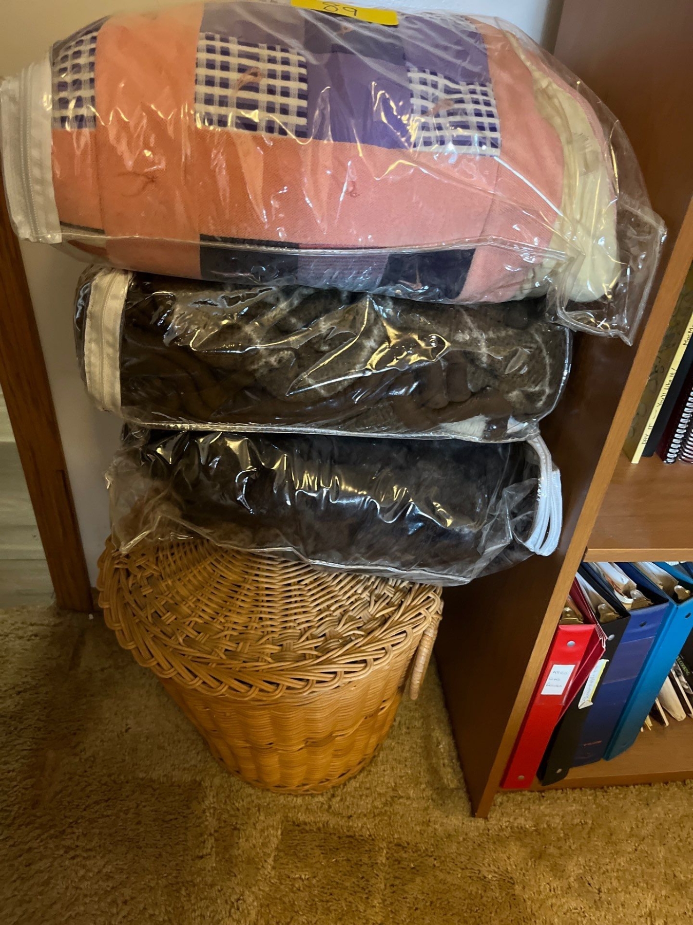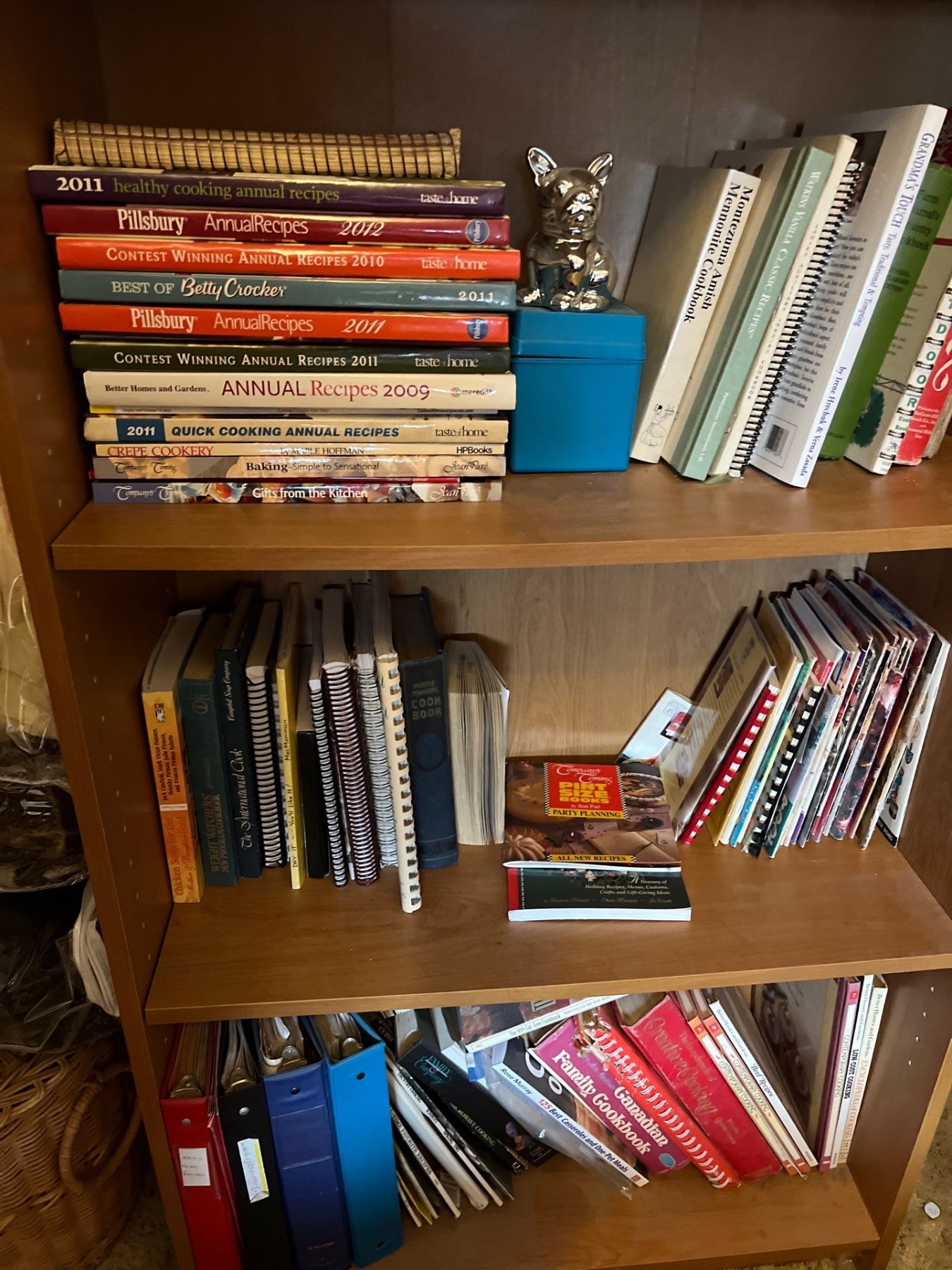Large collection of cookbooks shelves included vintage cat picture, wicker basket, and three blankets new in packages