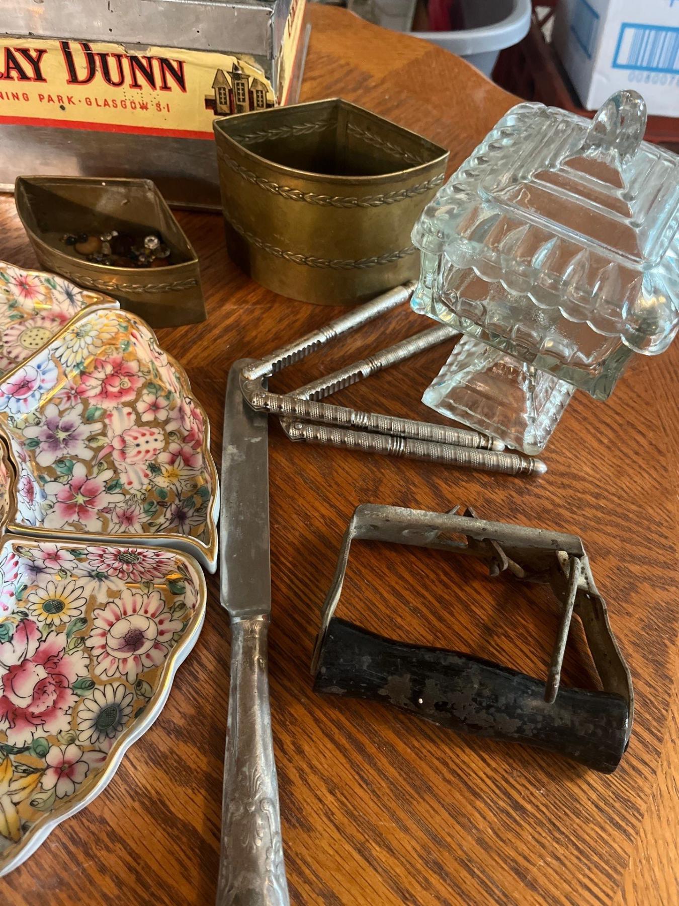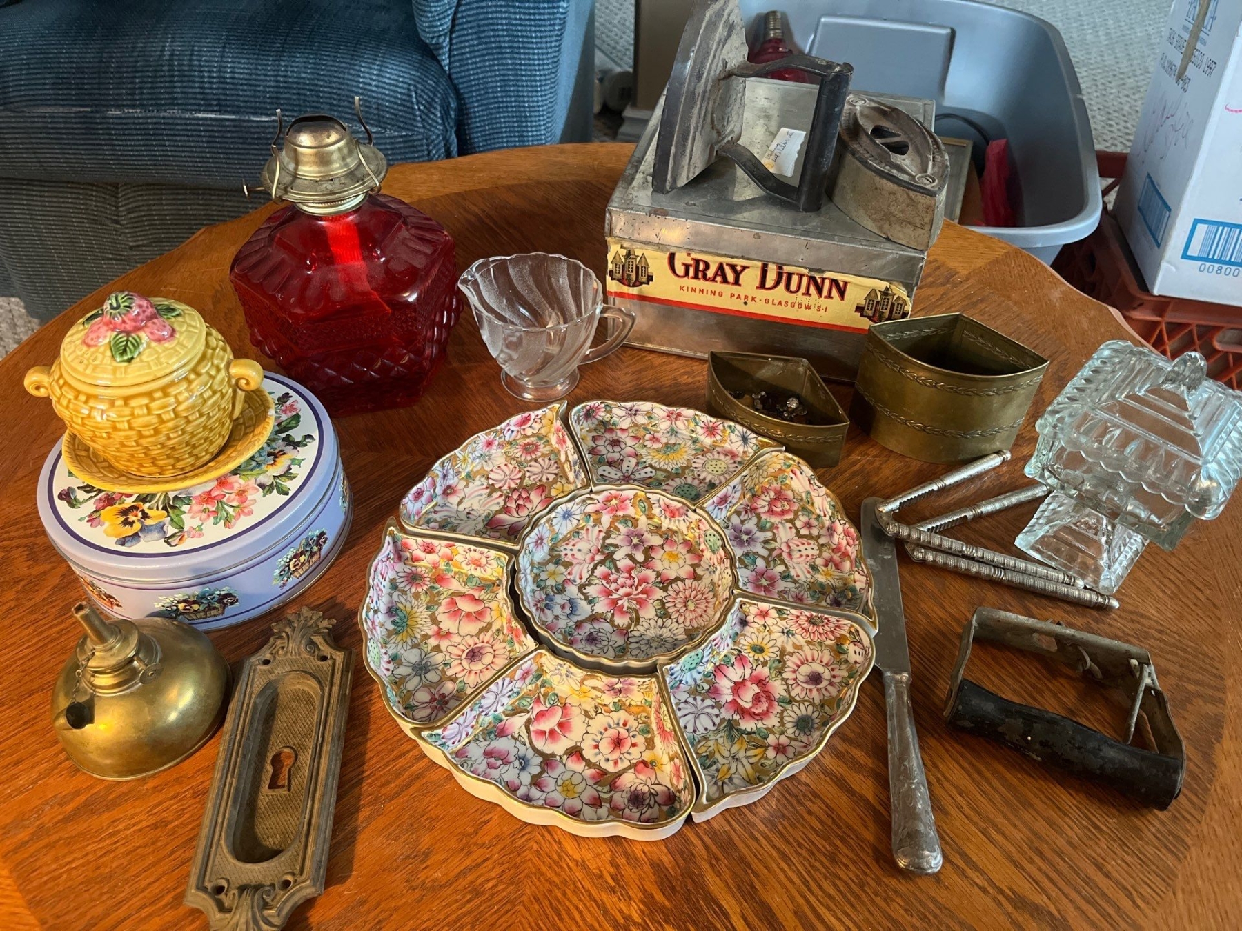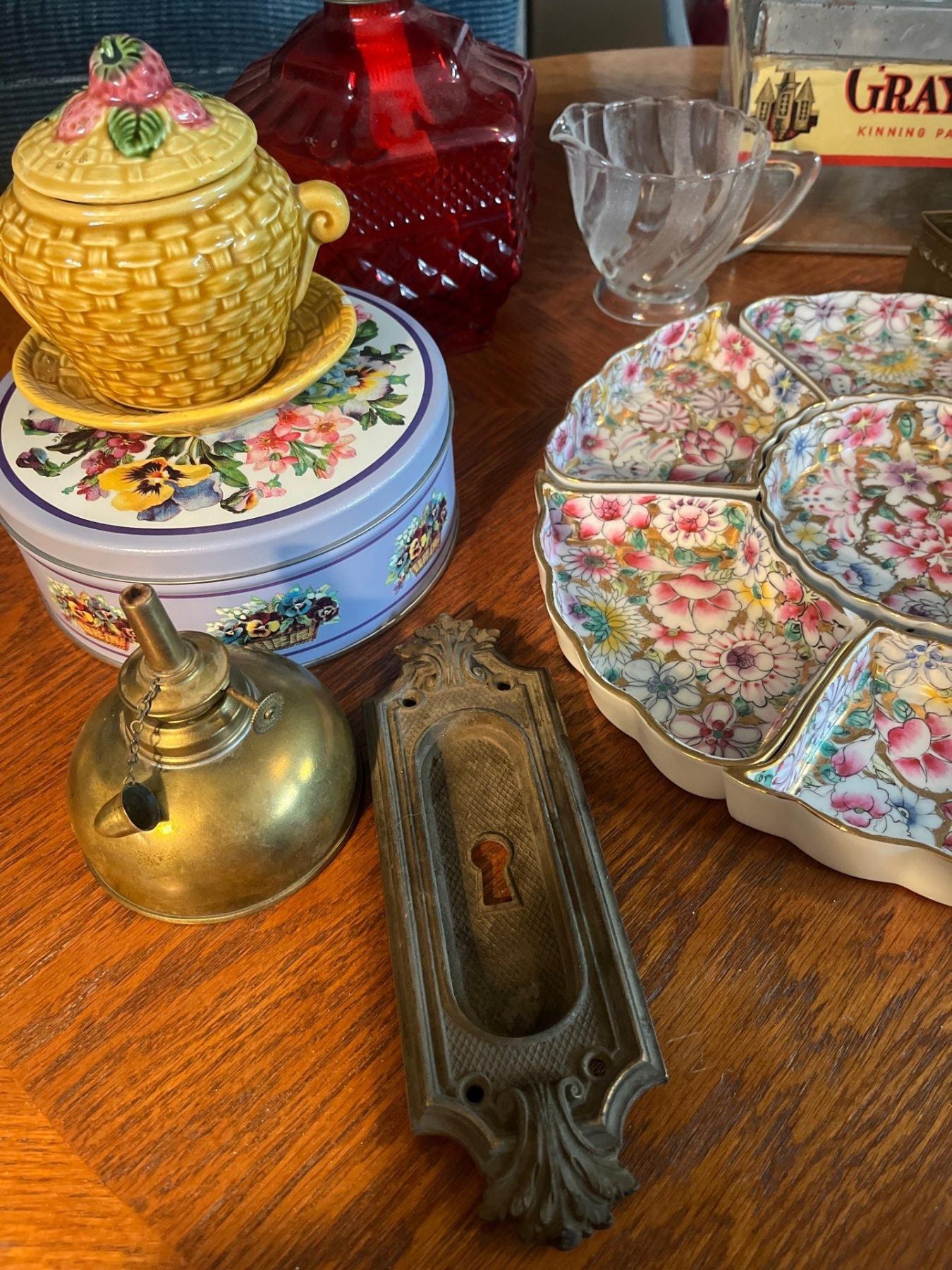 Large collection of vintage items, tins, irons, oil, and entrance and serving trays