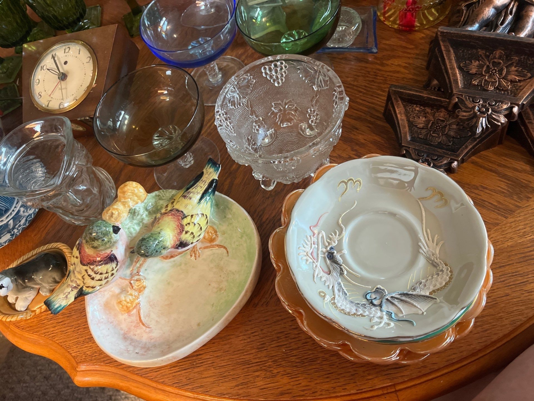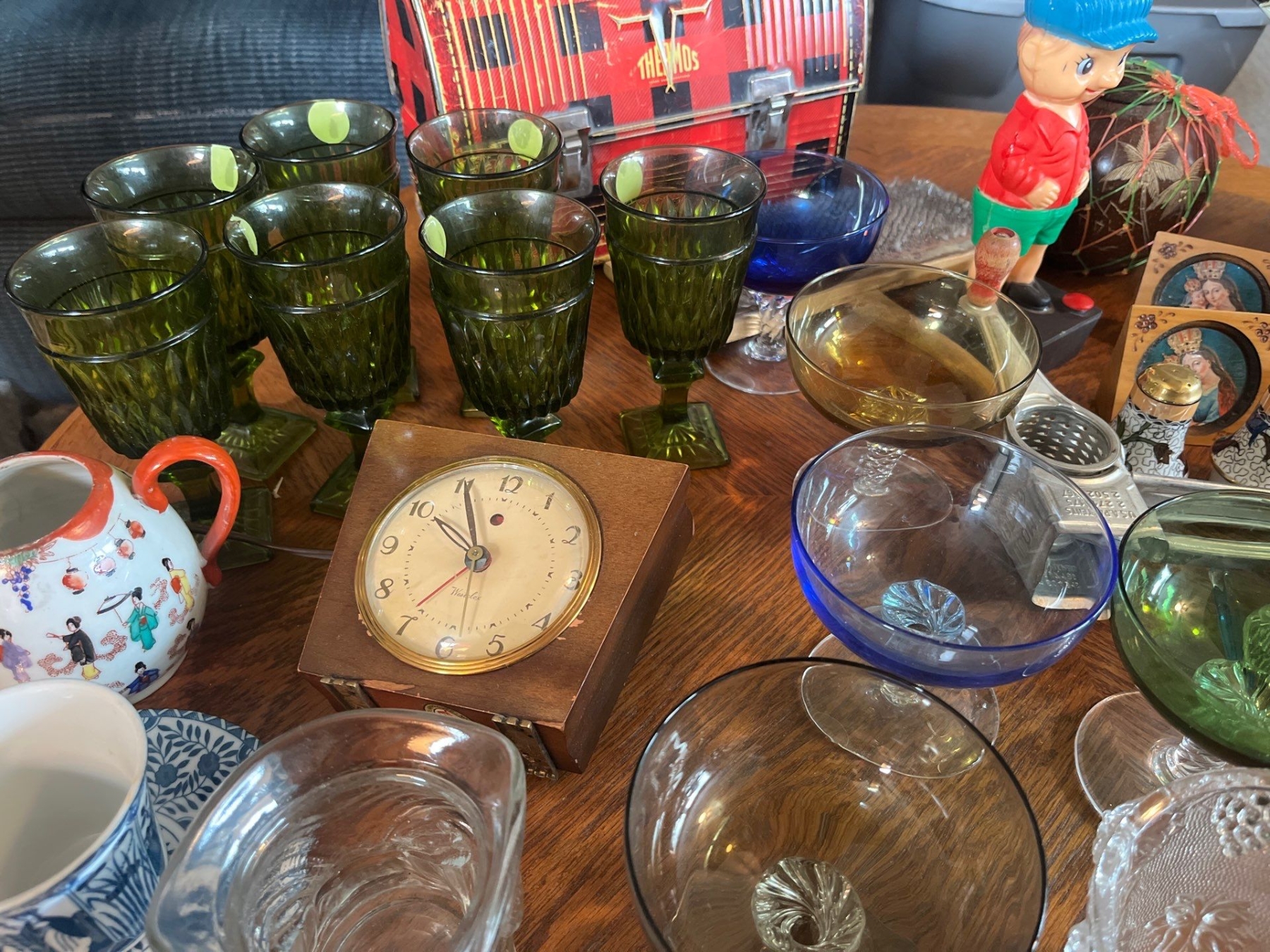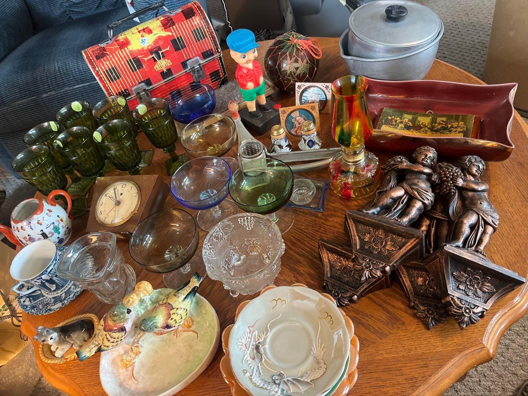 Large selection of vintage items, lunch boxes, glasses, carnival glass, pots, pens, small lanterns, tea, cups, and a cheese grater