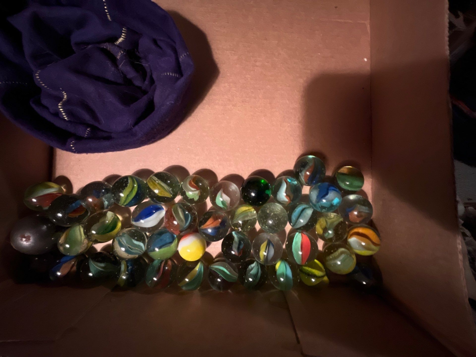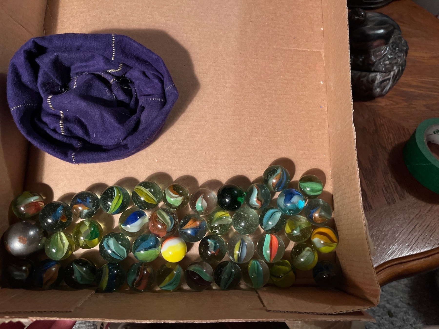 Large vintage marbles total of 41 and a vintage Seagrams purple bag several great designs for those marble collectors