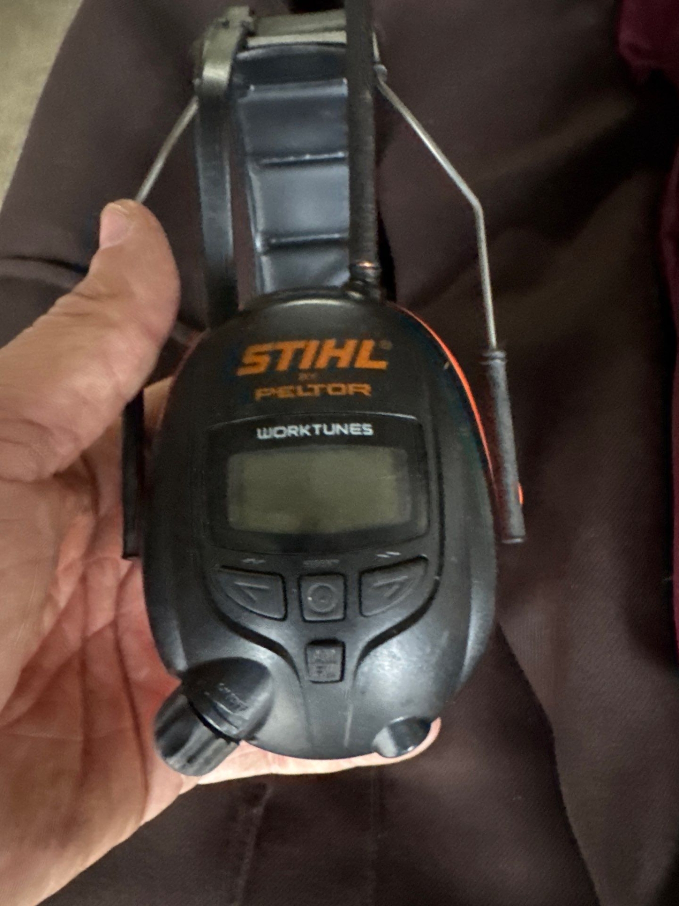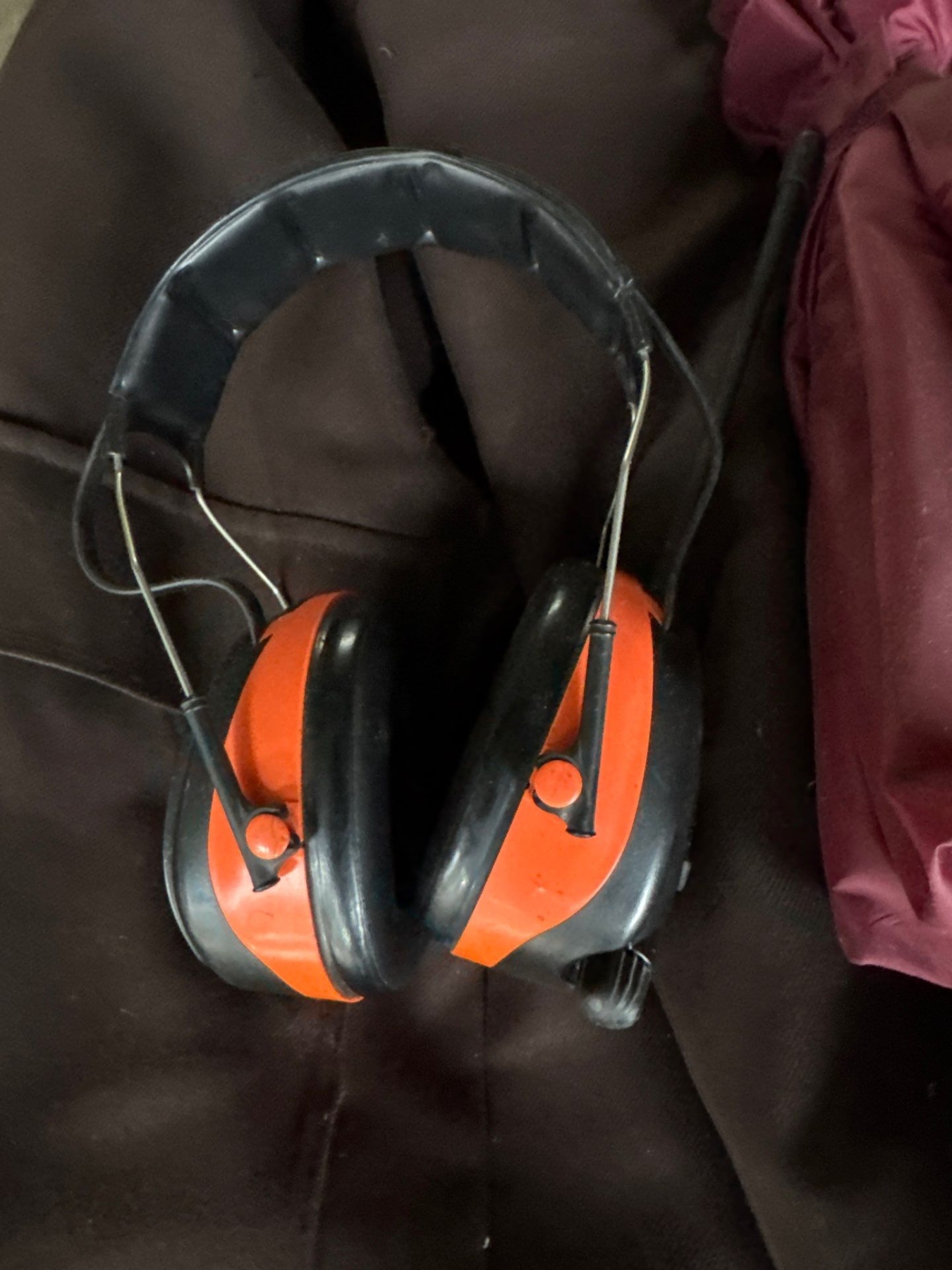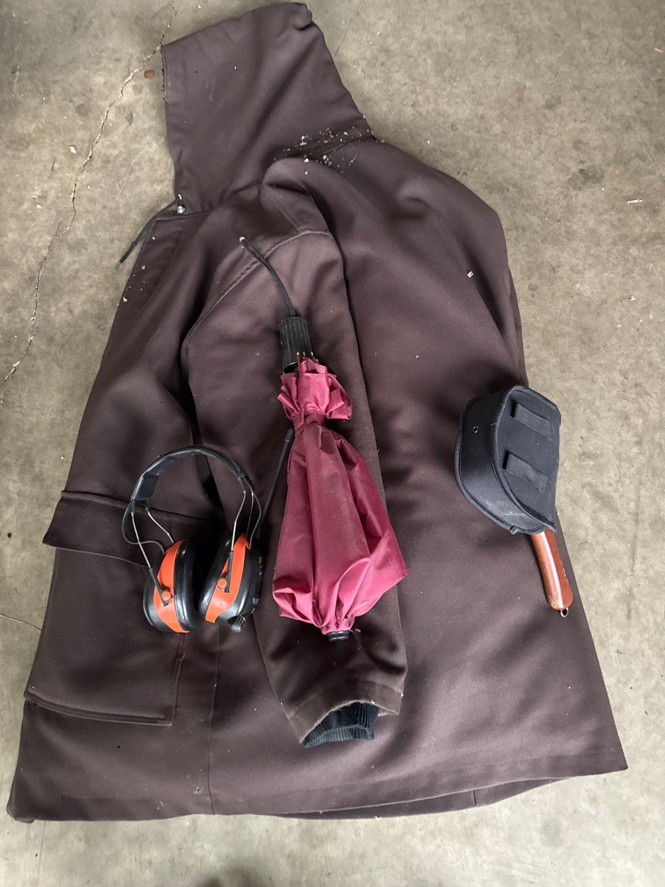 Large work jacket, umbrella, and still work tunes, earmuffs.