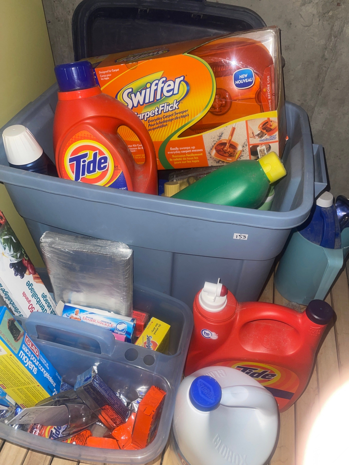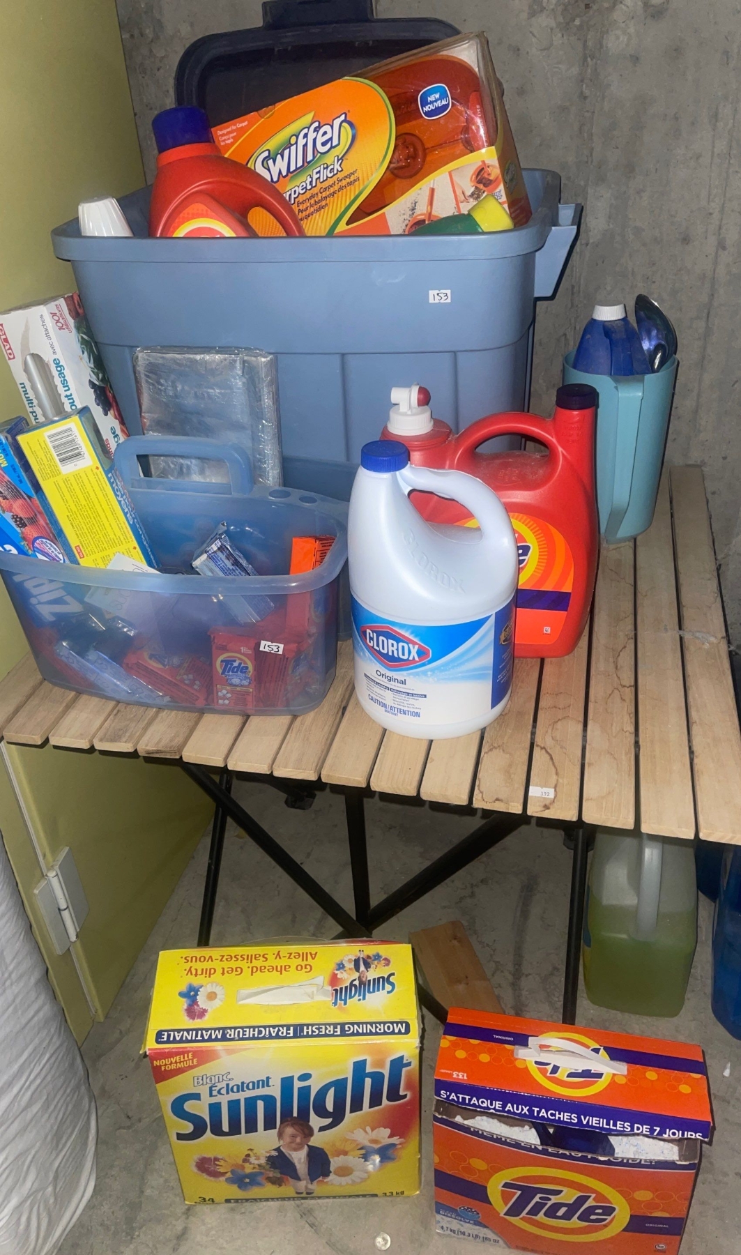 Laundry Table W/ Tote Of Basic Laundry Supplies Tide, Clorox, Sunlight Detergent, Soap, Static, Stains Out
