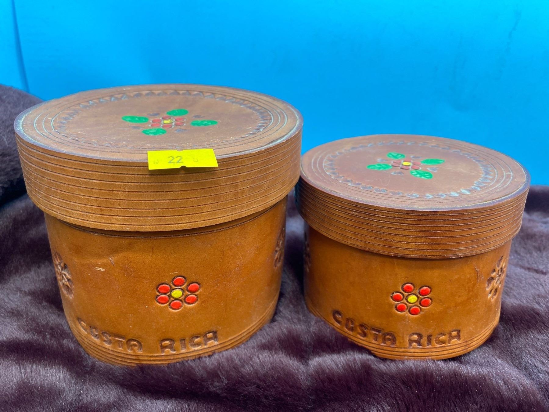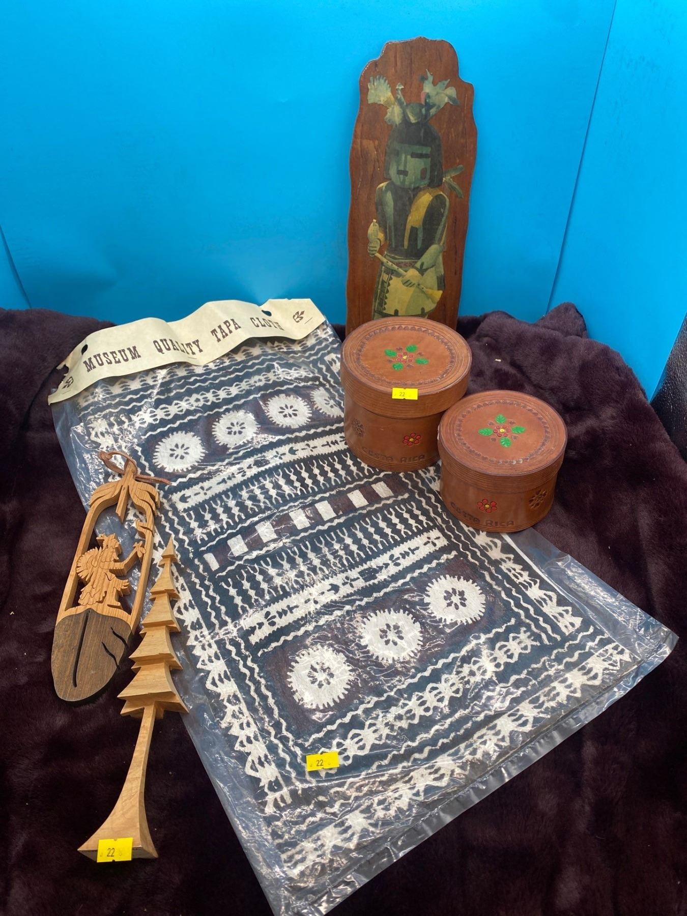 Leather Costa Rican Souvenirs Decorative Collectable Wood Art w/ Basket & Museum Quality Tapa Cloth