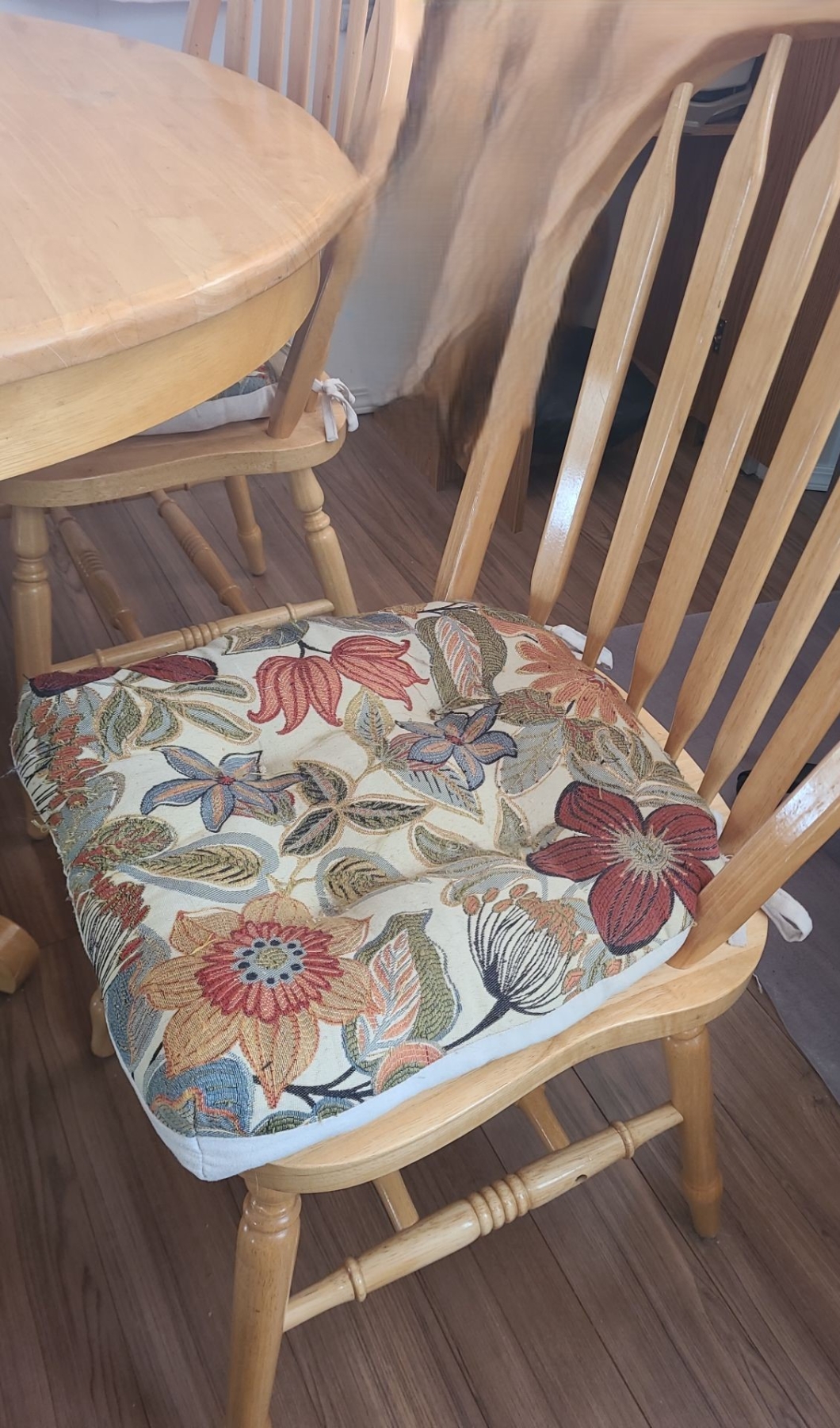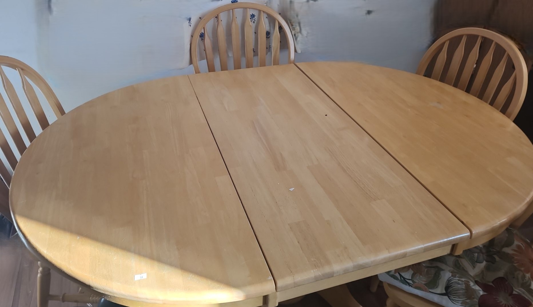 Light Finish Dining Table 59 W, 42 D, 30 T and 4 Chairs 17 W, 18 D, 38 T