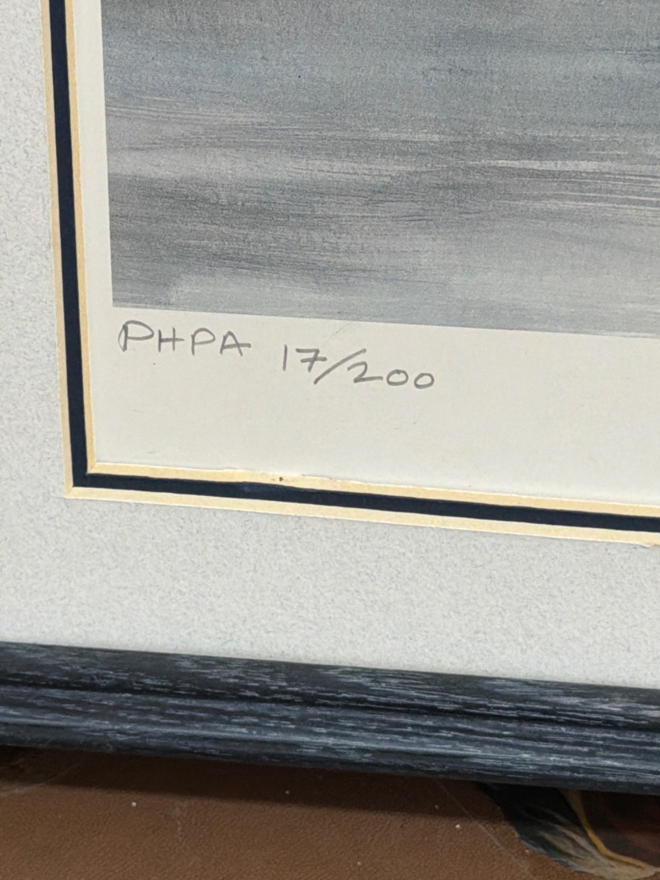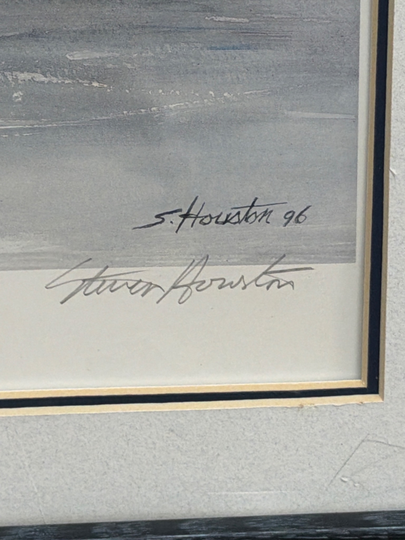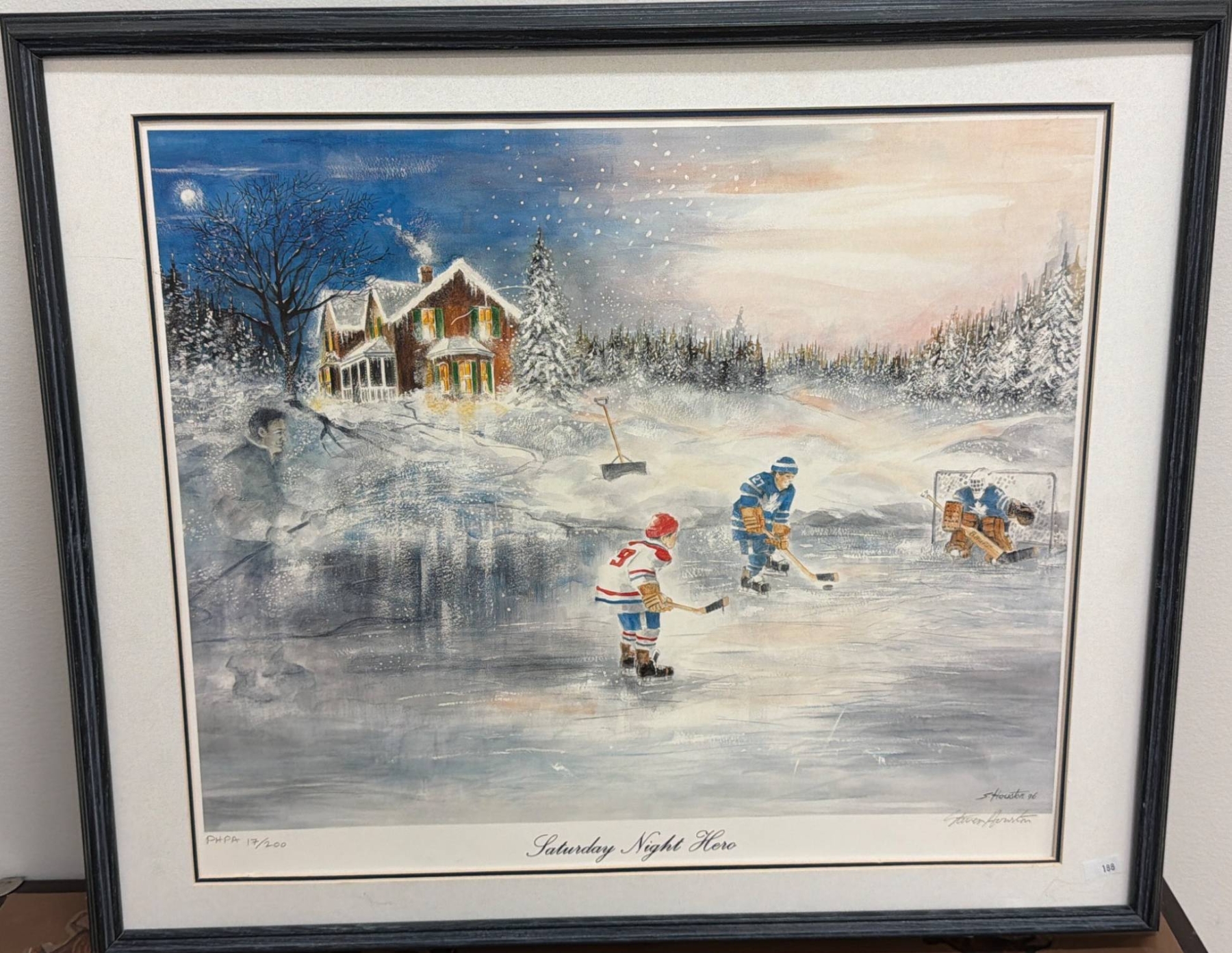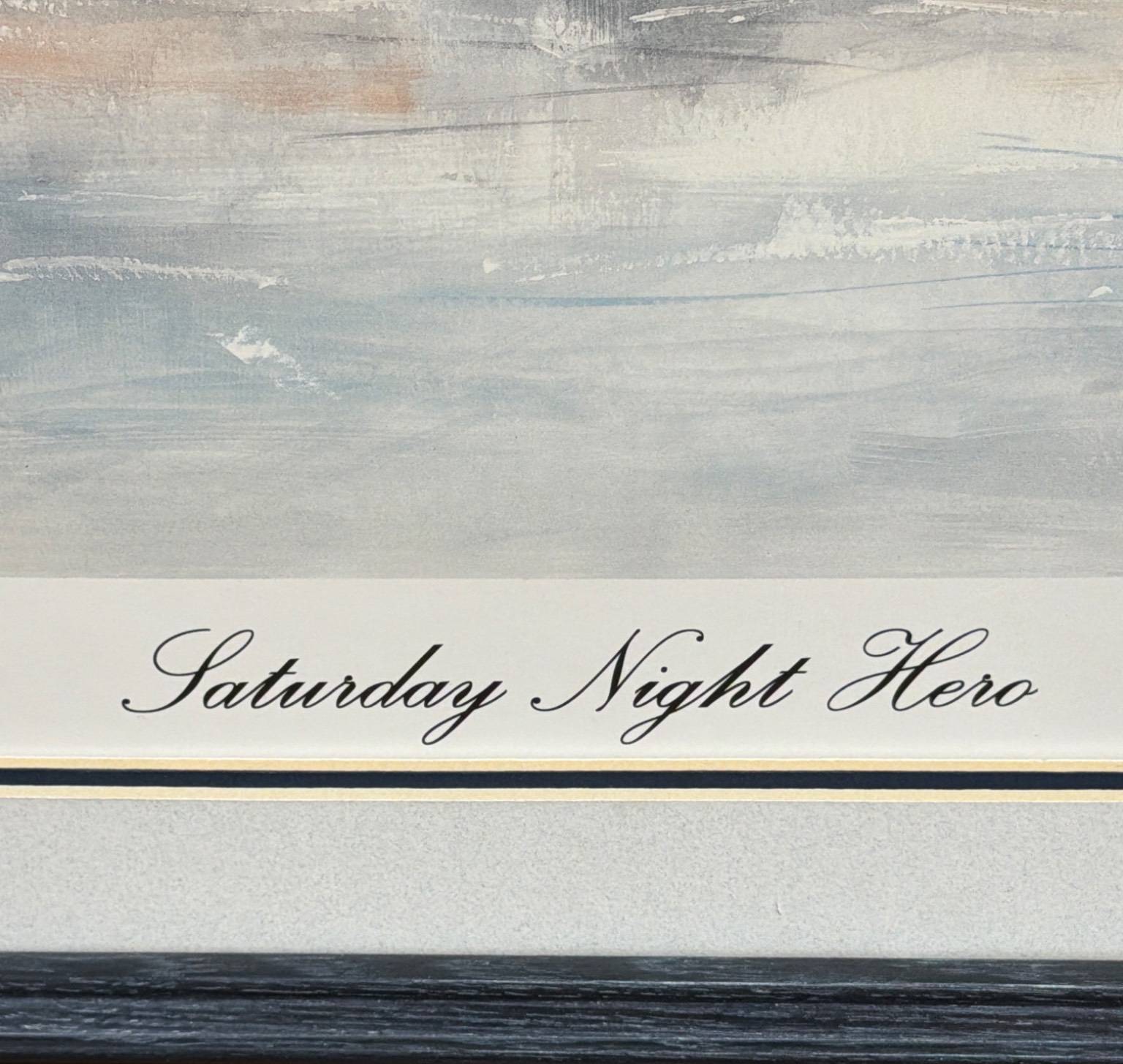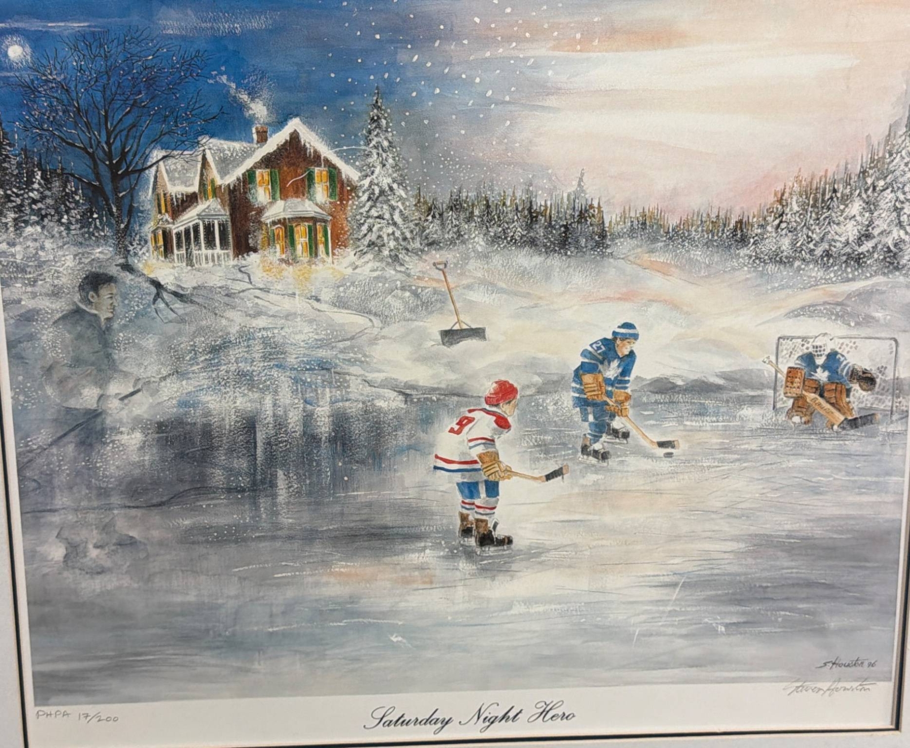 Limited edition print titled Saturday Night Hero™ by Steven Houston. Numbered 17/200 in the series and signed by the artist, this stunning 30" x 24" artwork captures a nostalgic winter scene of a family hockey game under starlit skies. Framed with a classic black frame and double matting, this is an excellent collector's piece for art or hockey enthusiasts.