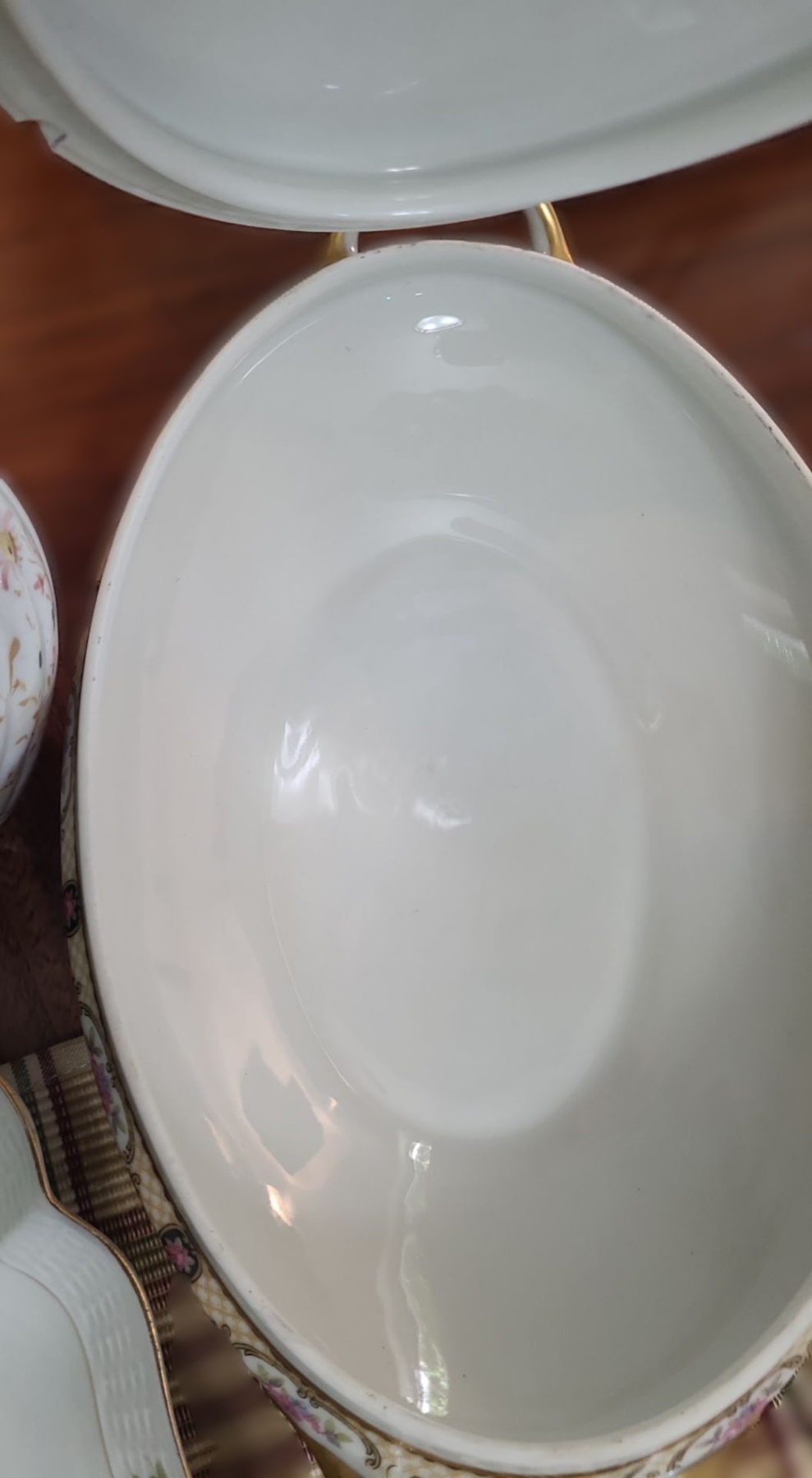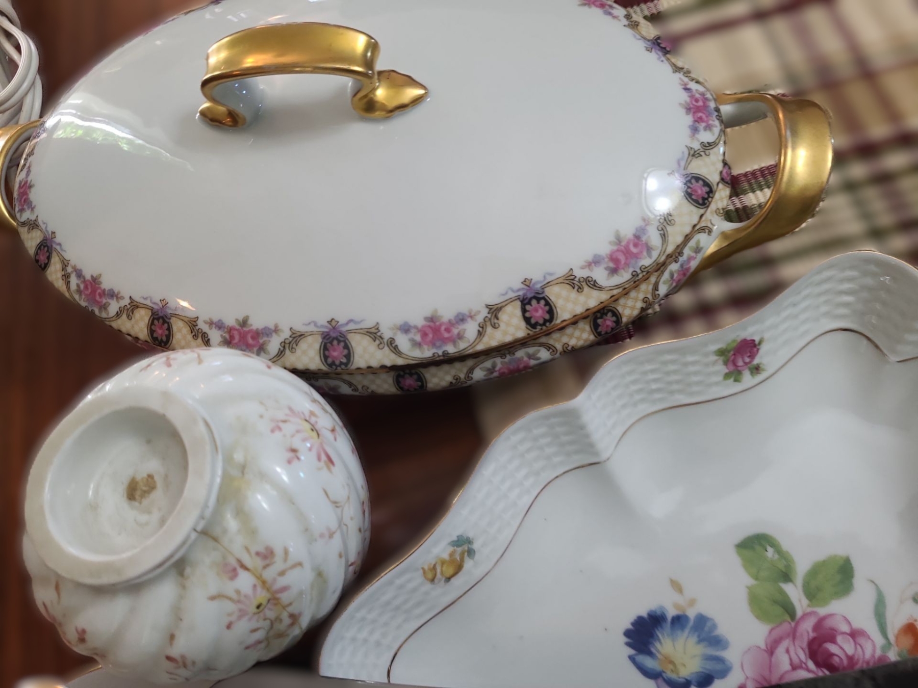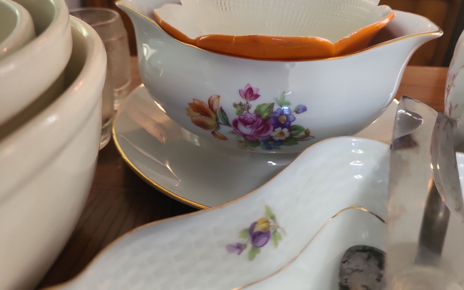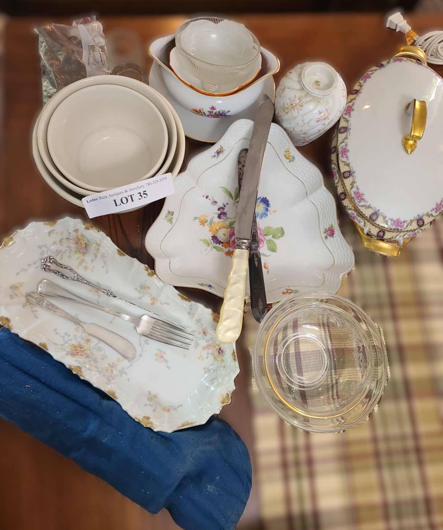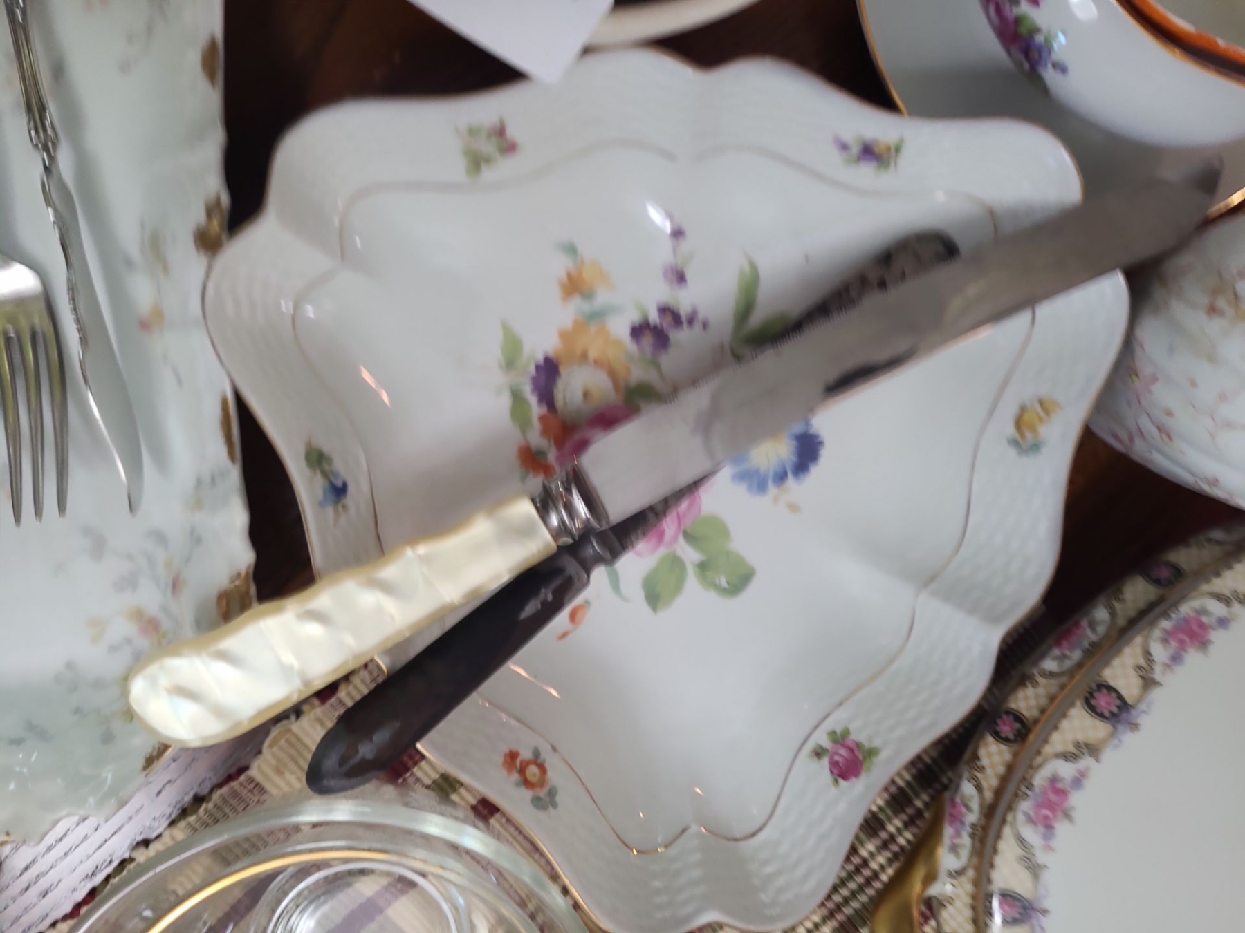 Limoges Tray small chip underneath, Orange Floral Bowl was broken & repaired. Glass Butter Dish no plate. Stainless Cutlery with a few broken blades