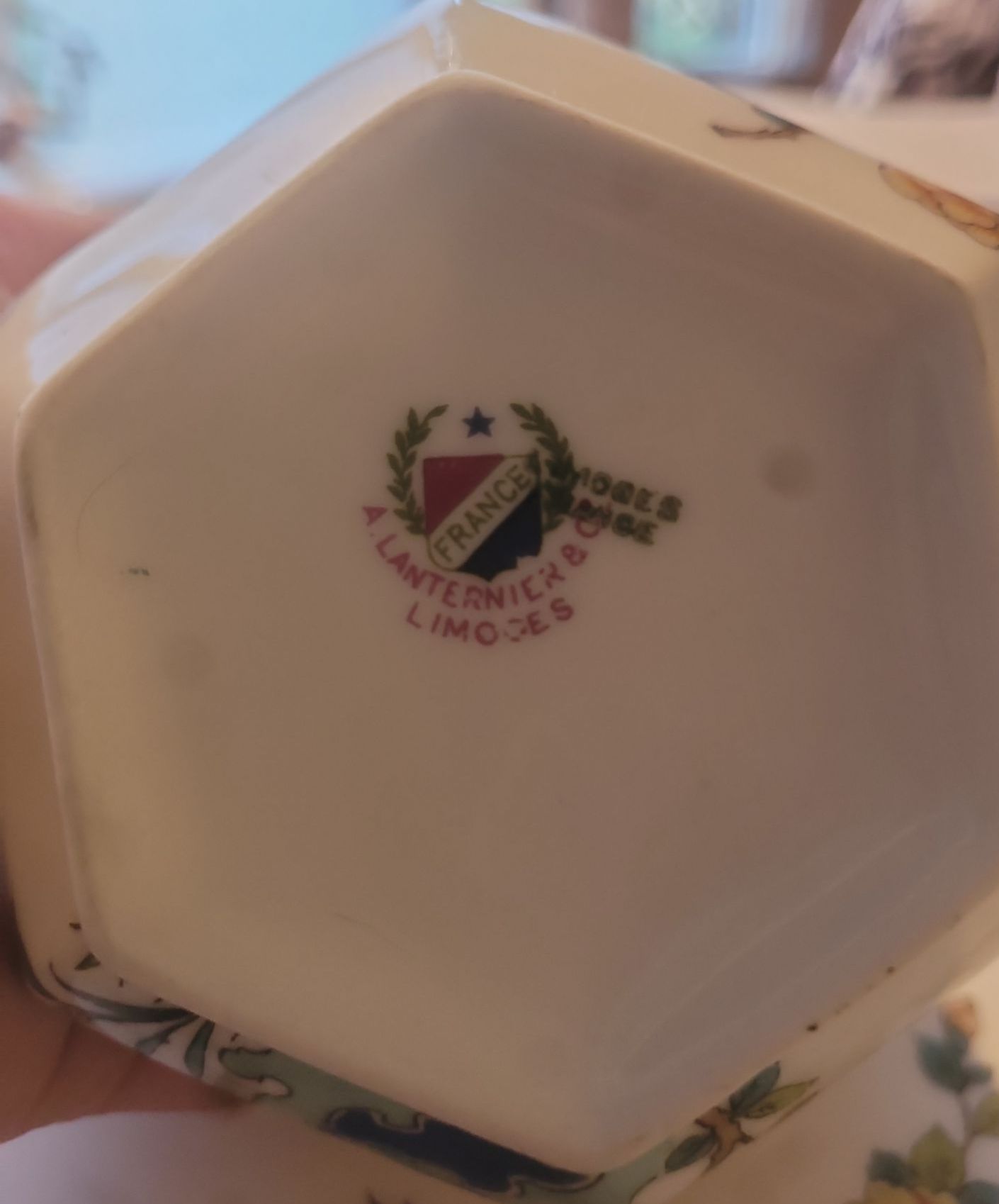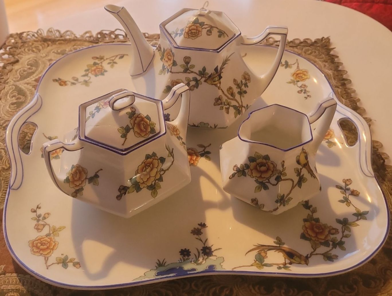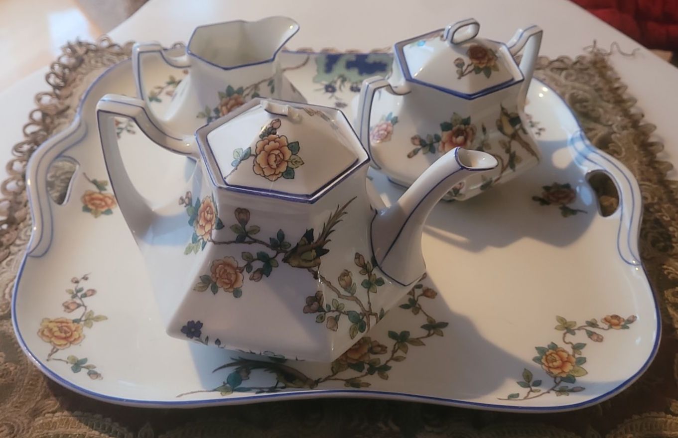 Limoges France China Set;  Tea Pot (Cracked), Creamer, Sugar Dish (Cracked), Tray