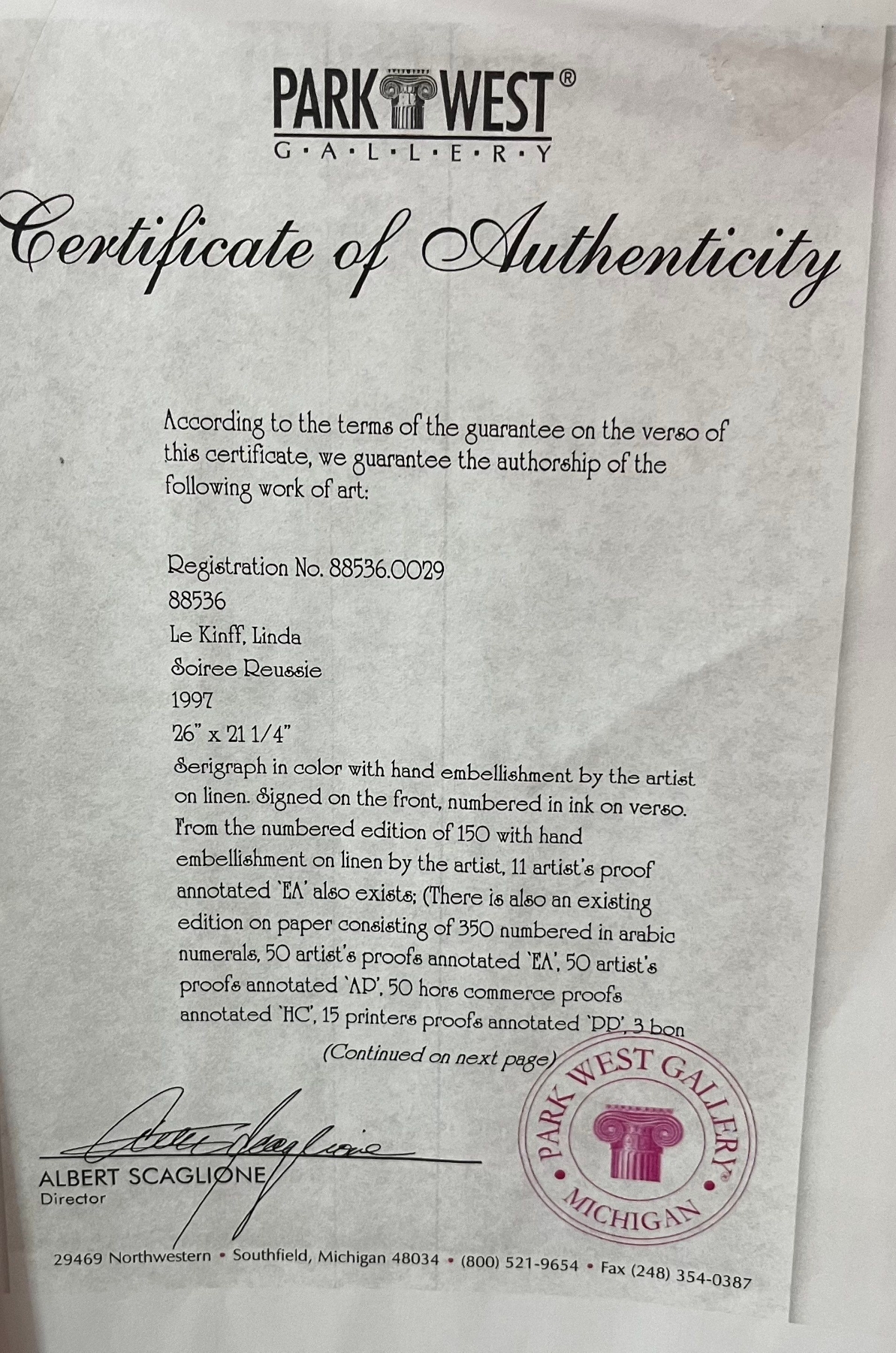From the numbered edition of 150 with hand embellishment on linen by the artist, 11 artist's proof annotated 'EA' also exists; (There is also an existing edition on paper consisting of 350 numbered in arabic numerals, 50 artist's proofs annotated 'EA', 50 artist's proofs annotated AP, 50 hors commerce proofs annotated 'HC, 15 printers proofs annotated 'DD, 3 bon