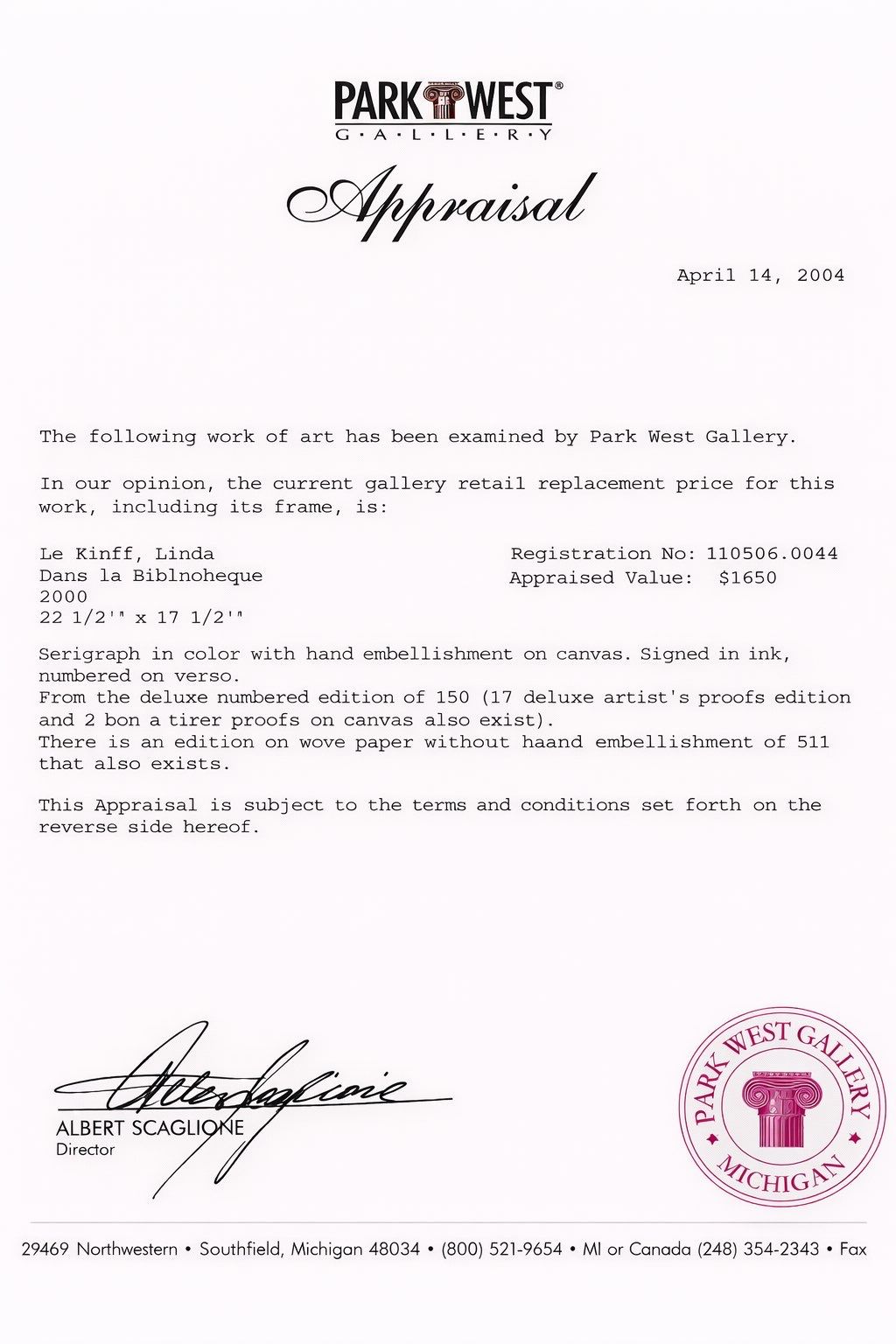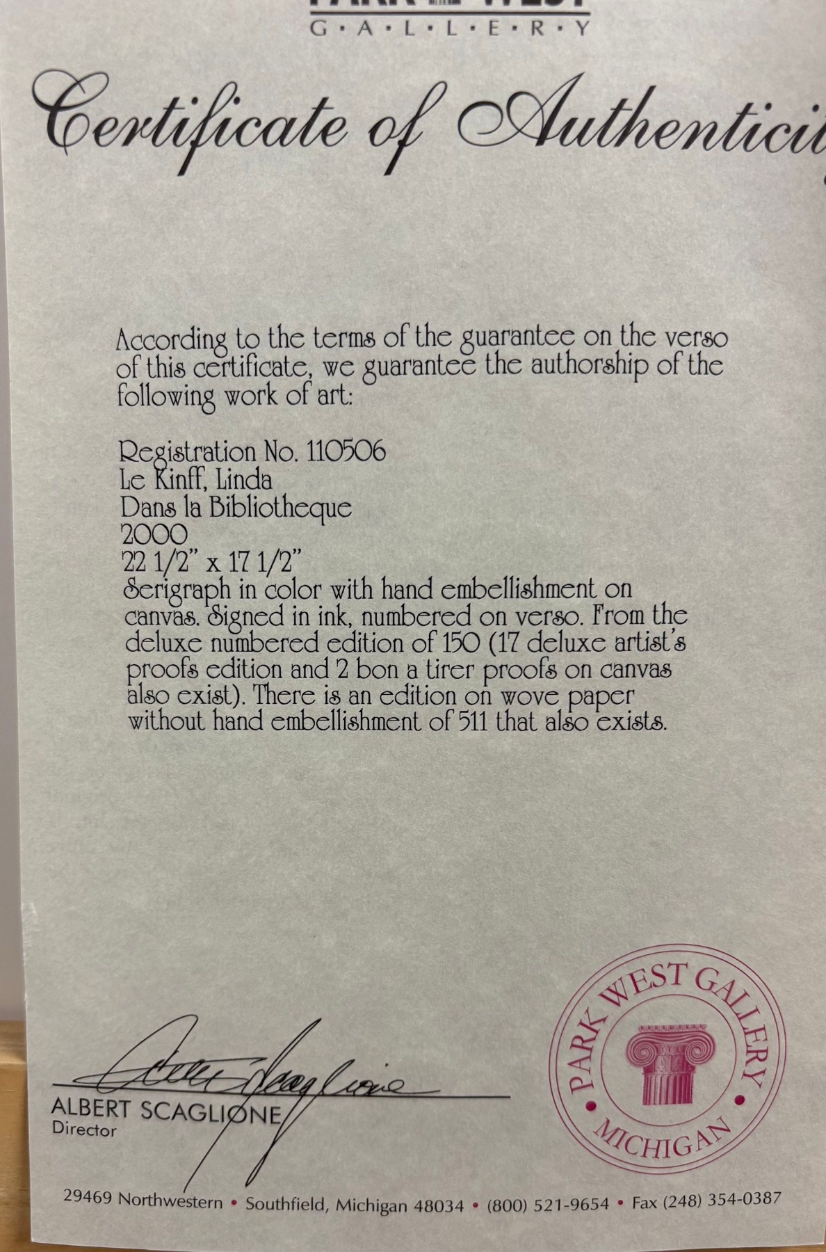 Linda Le Kinff Titled Dans La Bibliotheque 38/150 Seriograph Signed in Ink